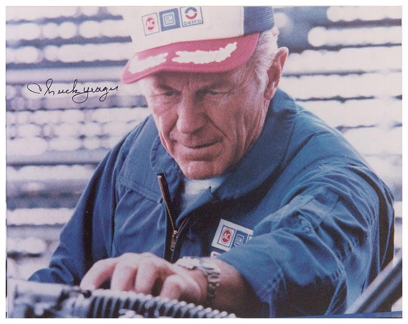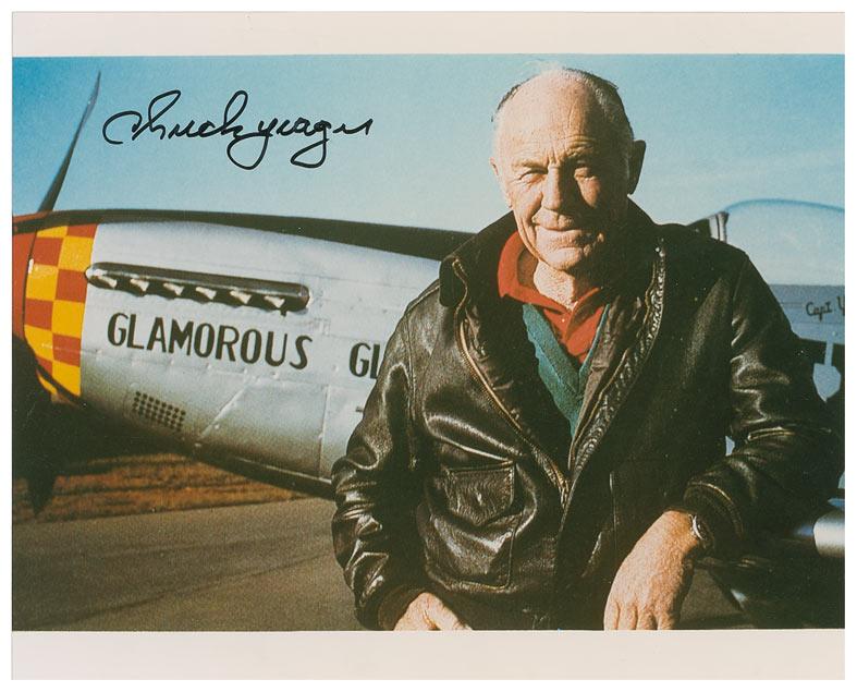 Two different color glossy 10 x 8 photos of Yeager, including one of him posing in front of the Glamorous Glennis, each signed in black felt tip. In fine condition.