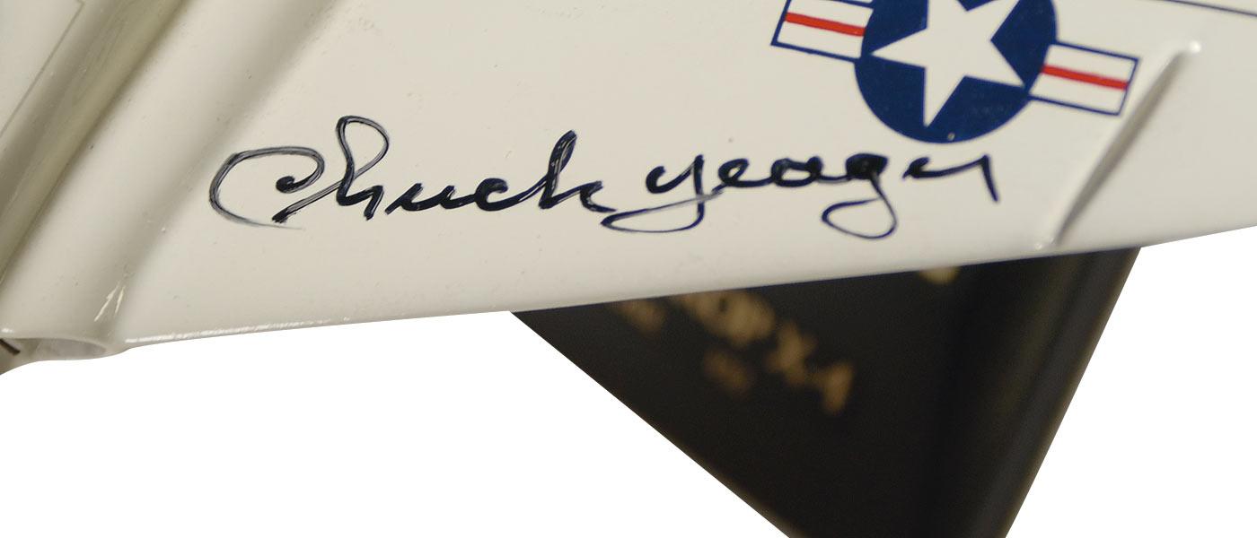 Scale model of a Northrop X-4 Bantam signed in black felt tip on the wing “Chuck Yeager.” In very fine condition. Accompanied by a photo taken at the time of signing.