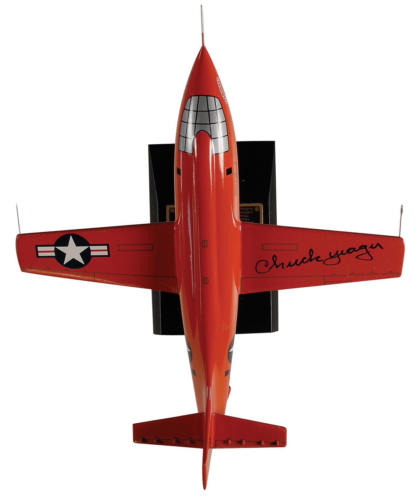 A 1/32 scale model of a Bell X–1A rocket research plane, signed on top of the right wing in black felt tip. In fine condition. Accompanied by a photo taken at time of signing and the original box.