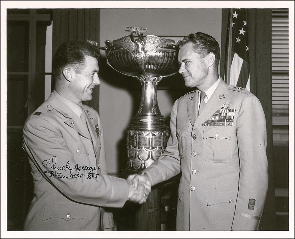 Glossy 10 x 8 photo of Yeager shaking hands with General Hoyt Vandenberg after receiving the Mackay Trophy in 1948, signed in black felt tip, “Chuck Yeager, B/Gen USAF Ret.” In fine condition.