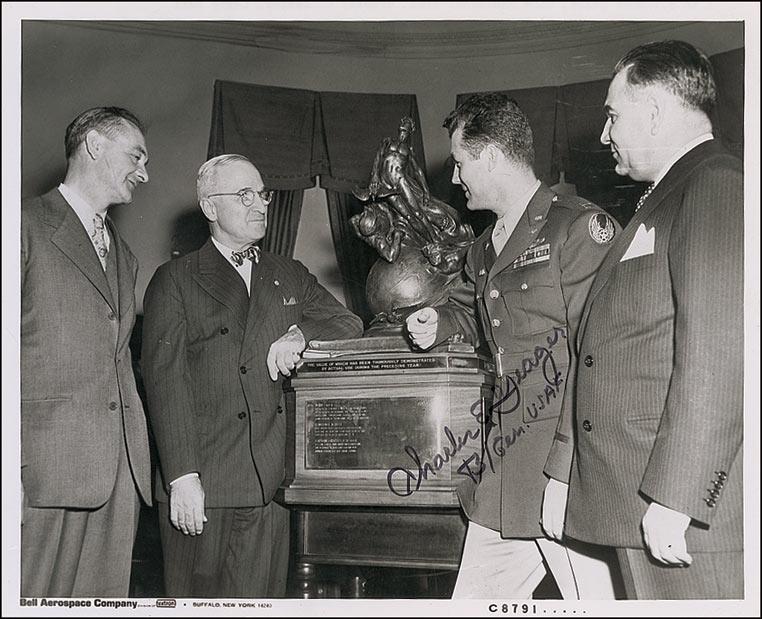 Glossy 10 x 8 photo of Yeager posing with Harry S. Truman and two other men after receiving the Mackay Trophy in 1948, signed in black felt tip, “Charles E. Yeager B/Gen USAF.” In fine condition, with some light wrinkles and creases.