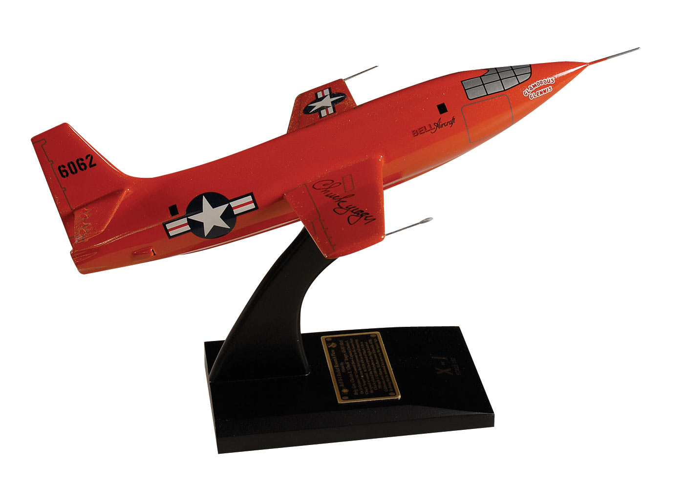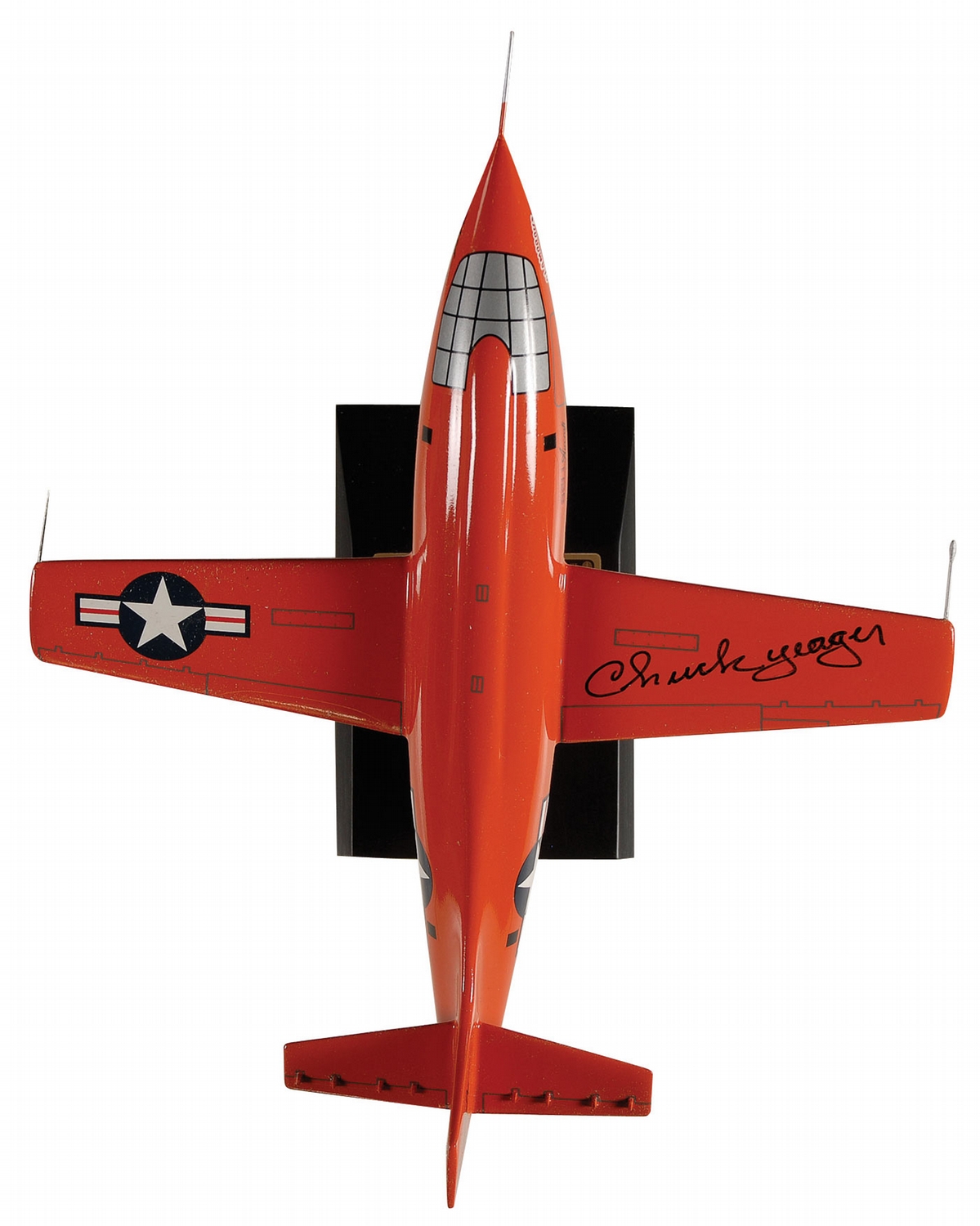 Scale model of Yeager’s X-1 aircraft, signed on the wing in black felt tip by Yeager. Accompanied by a photo taken at time of signing and the original box. In very fine condition. The X-1 was the first aircraft to break the sound barrier in 1947 and currently hangs in the main lobby of the Smithsonian's Air & Space Museum.