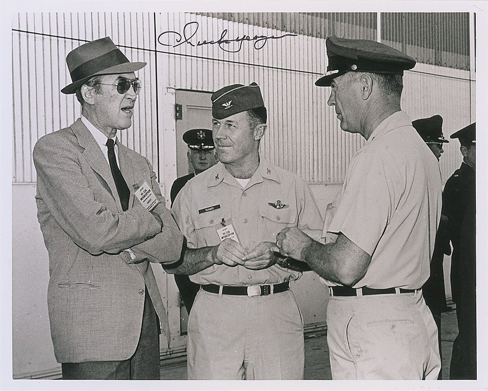 Glossy 10 x 8 photo of Yeager talking to Jimmy Stewart and another dignitary, signed in black felt tip. In very fine condition.
