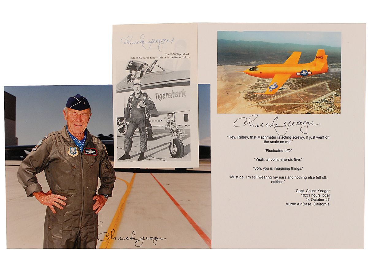 Three items: TQS signed in ink, “Chuck Yeager,” bearing a photo of the Glamorous Glennis affixed to an 8.25 x 10.75 trimmed white sheet with the quote from Yeager after breaking the sound barrier; a 4 x 7 clipped magazine photo of Yeager posing in front of the Tigershark, signed in blue ballpoint; and a color glossy 10 x 8 photo signed in black felt tip. In fine condition.