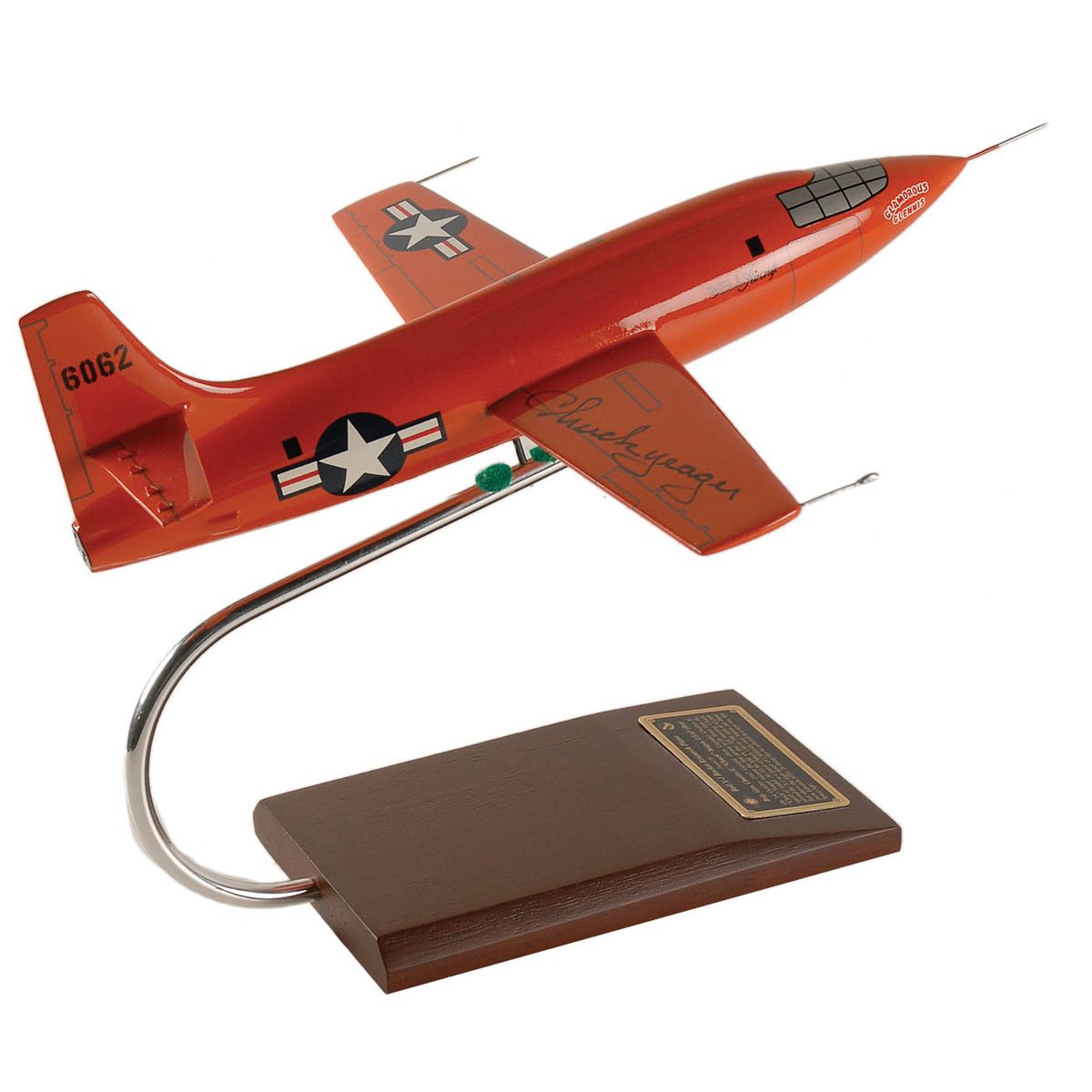 A 1/32 scale wooden model of a Bell X–1A rocket research plane, signed on top of the wing in black felt tip. In fine condition. Accompanied by a photo taken at time of signing. Accompanied by a full letter of authenticity from Steve Zarelli.