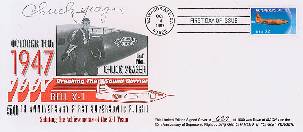 Flown limited edition FDC, 9.5 x 4, 627/1000, with a cachet honoring the 50th anniversary of Yeager’s first supersonic flight, signed above the cachet in pencil by Yeager. In very fine condition.