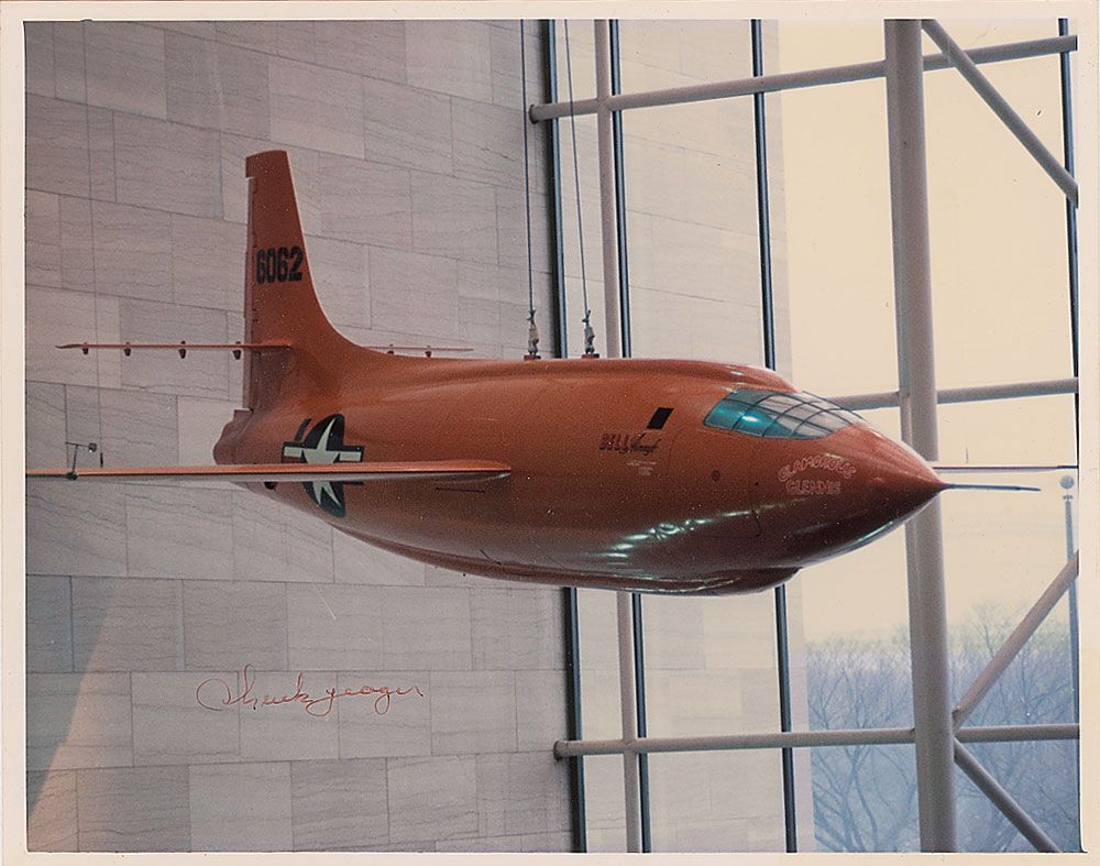 Color satin-finish 10 x 8 photo of Yeager’s supersonic X-1 plane, signed in felt tip. Signature a couple shades light, otherwise fine condition.