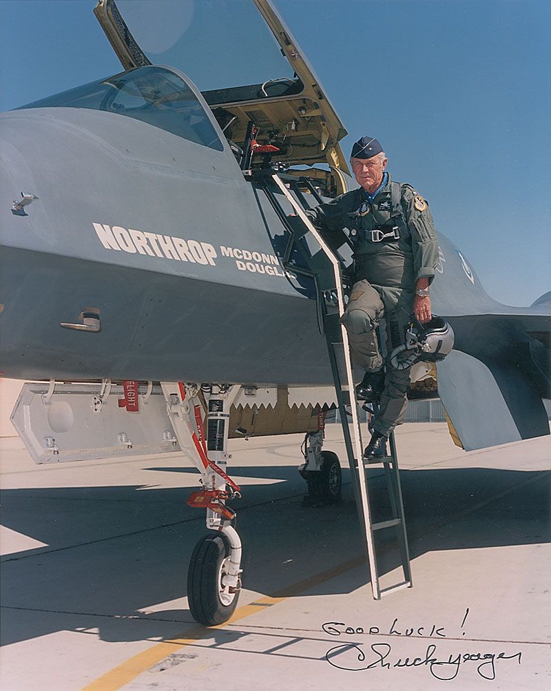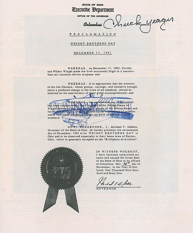 Two items: color satin-finish 8 x 10 photo of Yeager with a jet, signed in black felt tip; and a copy of the December 17, 1961, Wright Brothers Day proclamation from Ohio, 7 x 8.5, signed in black felt tip. In fine condition.