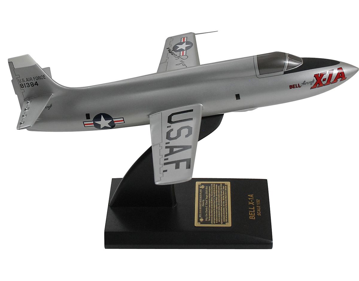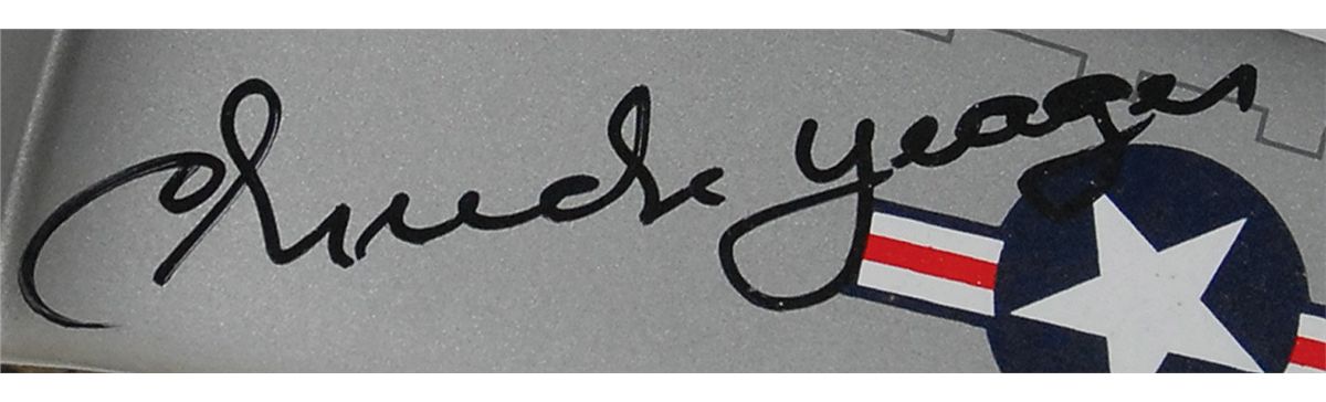 Detailed 1/32 scale model of Yeager’s Bell X-1 rocket research plane, signed on the top of a wing in black felt tip. Model is accompanied by its display stand. In fine condition.