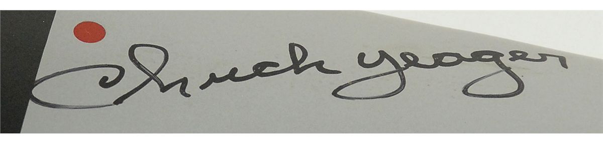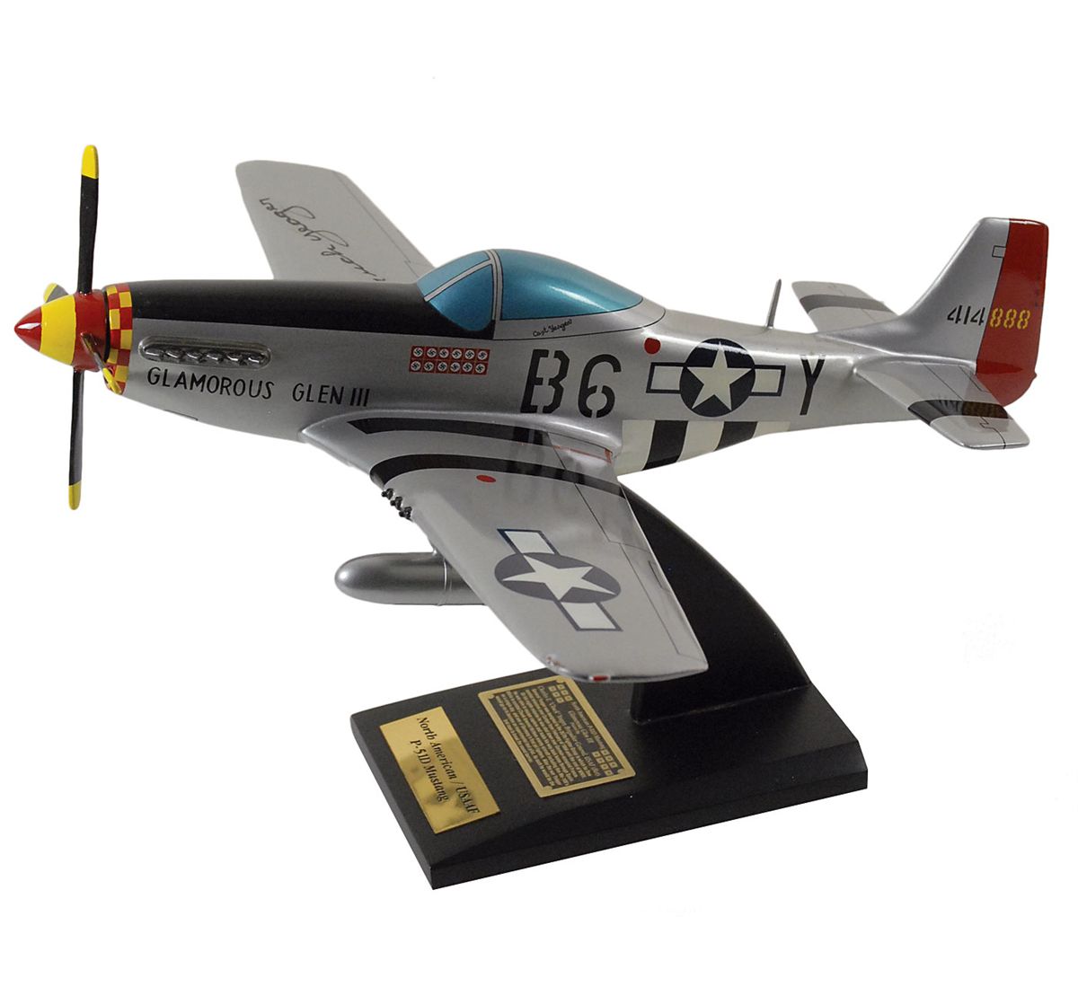 Scale composite model of Yeager’s Glamorous Glenn III P-51D Mustang, signed on the wing in black felt tip. Model comes with its original display stand. In fine condition, with a small ding to the corner of one wing.