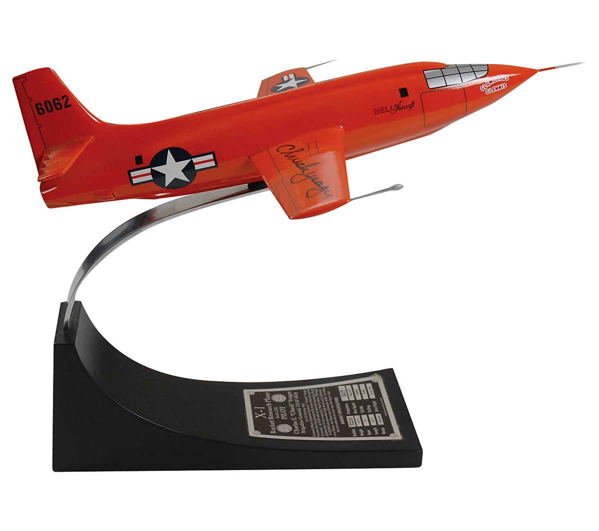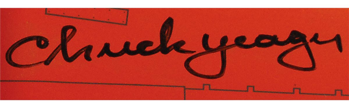 Well-done composite 1/32 scale model of a Bell X-1 rocket research plane, signed on the wing in black felt tip by Chuck Yeager. Model is accompanied by its display stand. In fine condition.