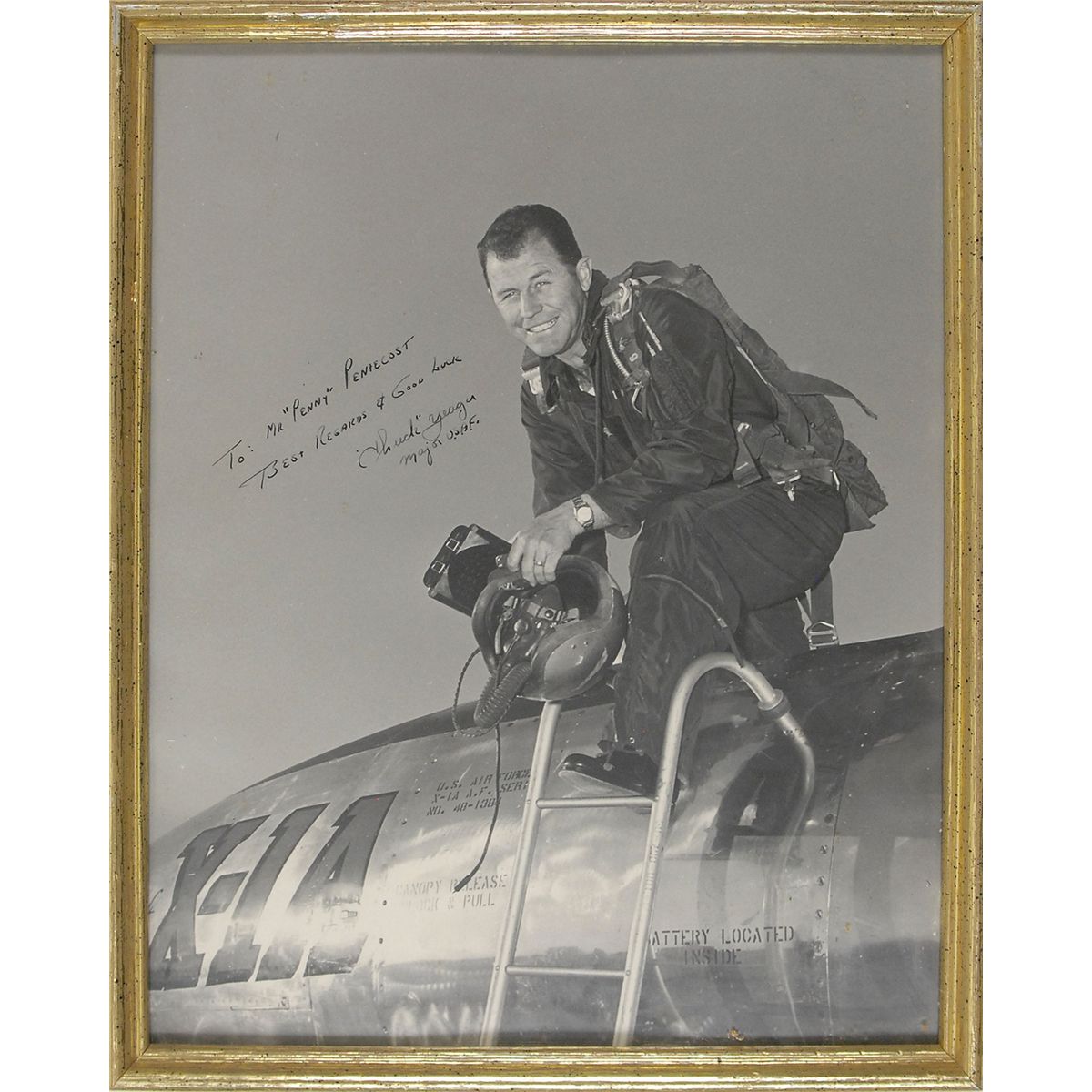 Vintage 10.75 x 14 oversized photo of Yeager exiting the cockpit of his X-1A aircraft, signed and inscribed in fountain pen, “To: Mr. ‘Penny’ Peniecost, Best regards & Good Luck, ‘Chuck’ Yeager, Major U.S.A.F.” Framed to an overall size of 11.75 x 15. In fine condition. Arguably the best Yeager photo we have ever seen, impressive in both size and quality.