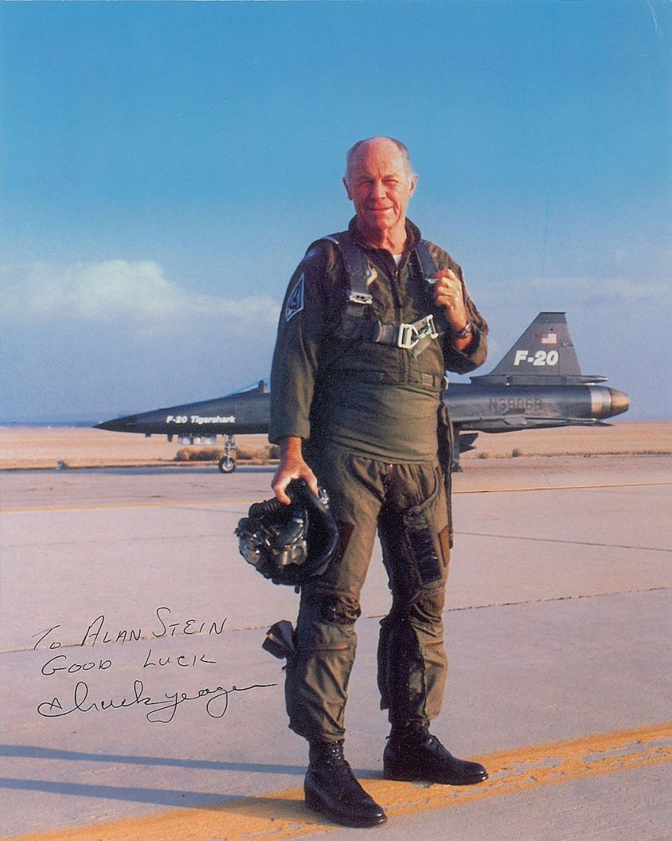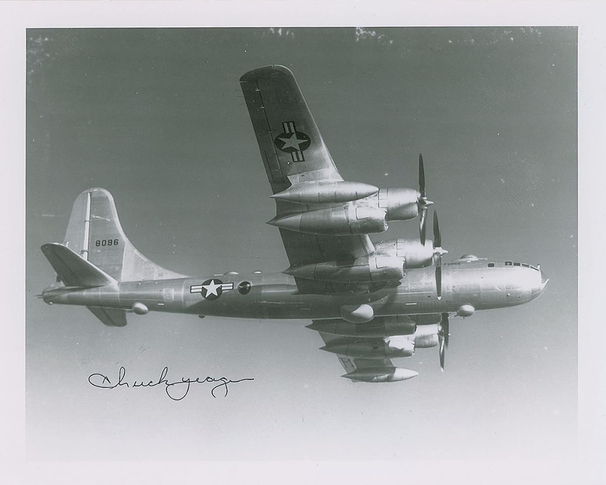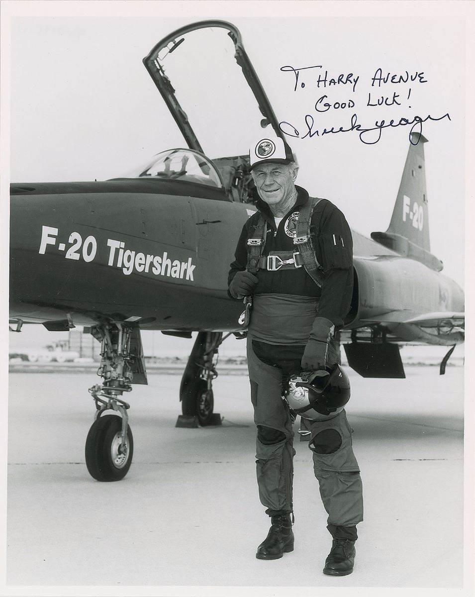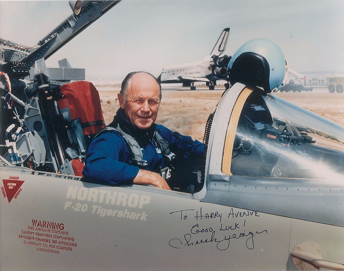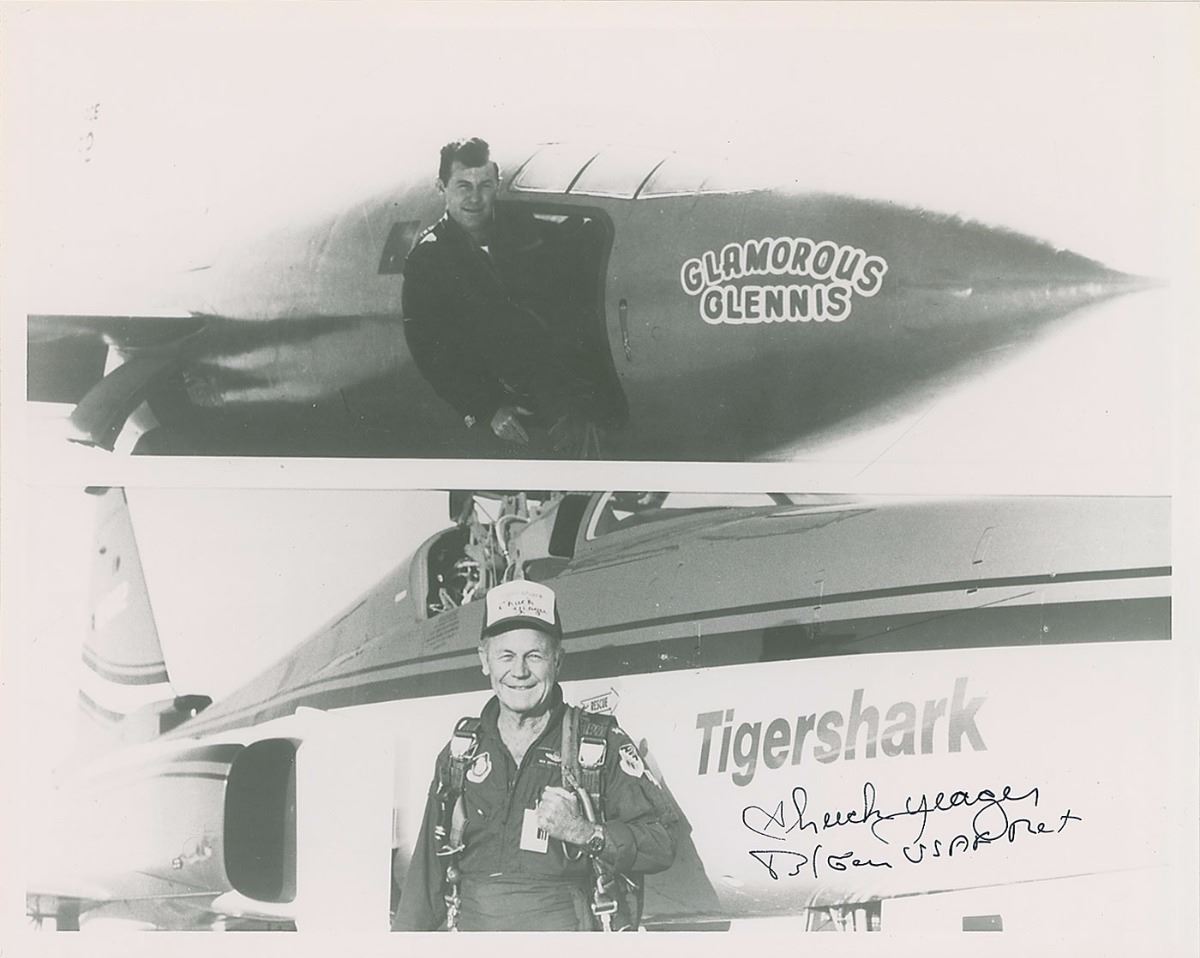 Set of five photos of Yeager and his various aircraft, 8 x 10 and 10 x 8, each signed in black ink, with a few inscribed. In overall fine condition, with a crease to the upper right corner tip of the 8 x 10 cardstock photo.