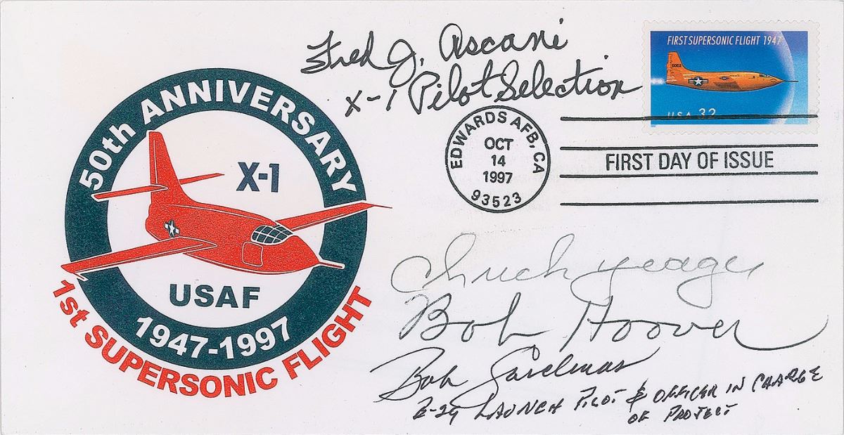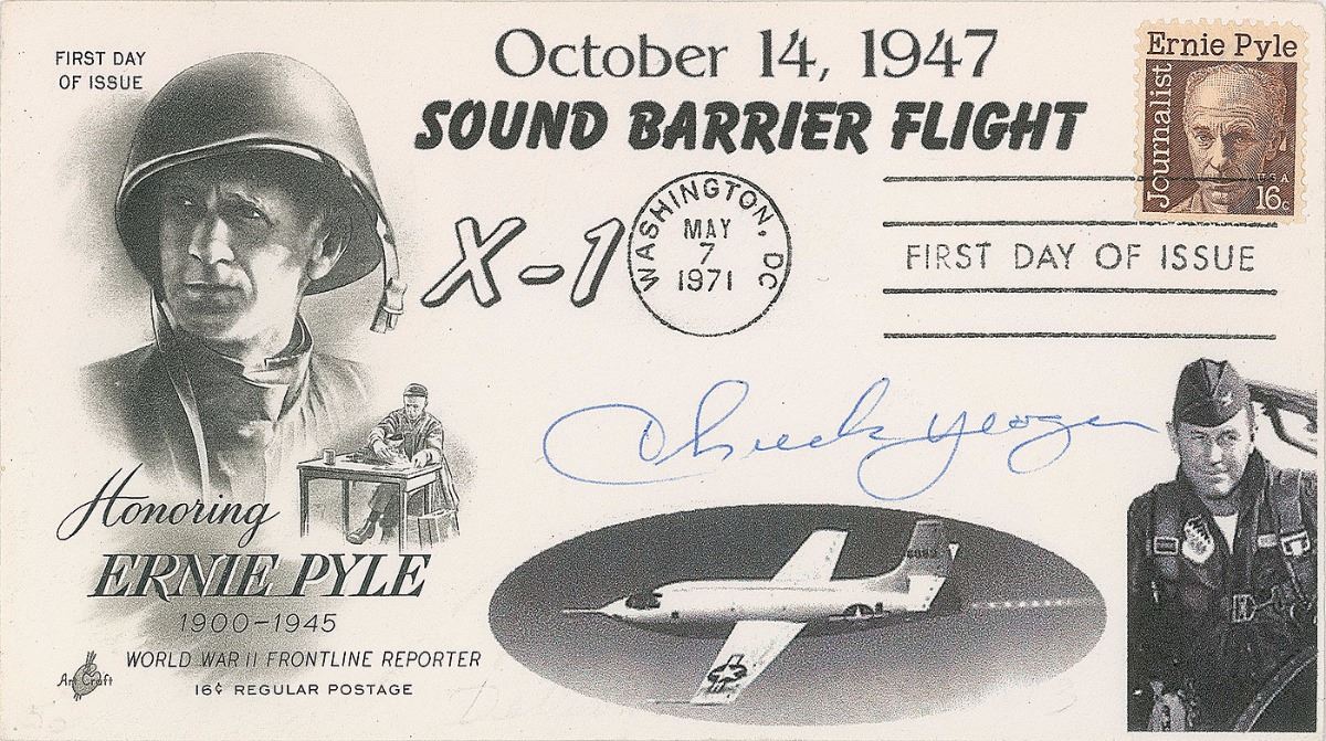Two covers: an FDC, 6.5 x 3.5, with a cachet honoring WWII front-line reporter Ernie Pyle and an X-1 Sound Barrier Flight stamp, signed in blue ballpoint by Chuck Yeager; and an FDC, 7.5 x 3.75, with a cachet honoring the 50th anniversary of the first supersonic flight, signed in pencil by Yeager, and in black ink by Fred Ascani, Bob Hoover, and Bob Cardenas. In overall fine condition.