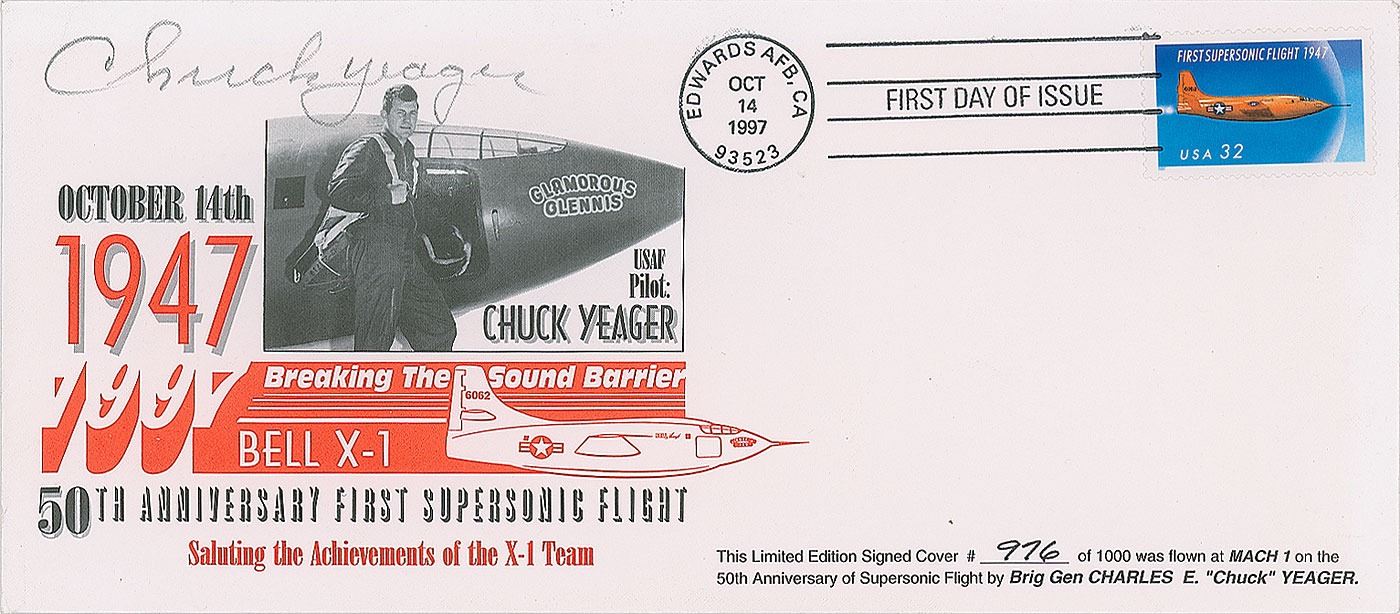 Limited edition flown FDC carried at Mach 1 by Yeager on the 50th anniversary of the first supersonic flight, numbered 976/1000, signed along the top in pencil, "Chuck Yeager." In very fine condition.