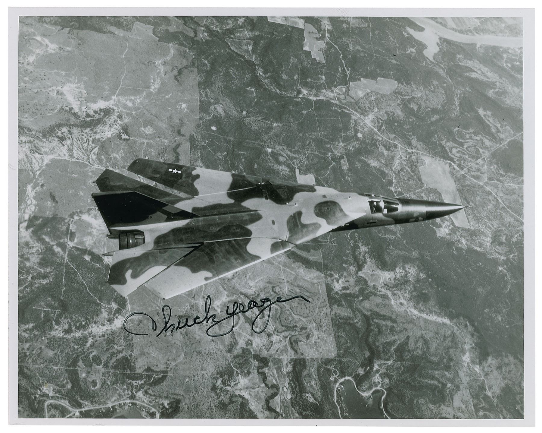 Glossy 10 x 8 photo of a camouflaged military jet, signed in black felt tip by Yeager. Reverse bears a General Dynamics credit stamp. In fine condition.