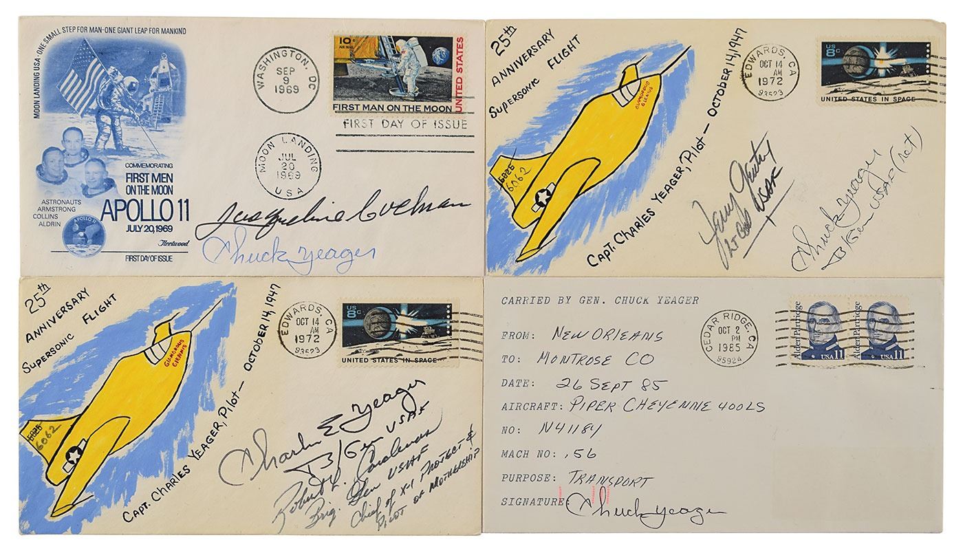 Four covers signed by Chuck Yeager, including: a pair of commemorative covers with hand-painted cachets honoring the 25th anniversary of the "Supersonic Flight" of the Glamorous Glennis on October 14, 1947, both signed in ink by Yeager, who adds, "B/Gen USAF," with one signed by Brigadier General Robert L. Cardenas and the other signed by Colonel Jerry Gentry, both of whom were experimental pilots; an FDC with a cachet honoring the Apollo 11 mission, signed in blue ballpoint by Yeager, and in black ink by Jacqueline Cochran, who was the first woman to fly faster than the speed of sound; and a flown mailing envelope "Carried by Gen. Chuck Yeager" from New Orleans to Montrose, Colorado, on September 26, 1985, signed below in black ballpoint by Yeager. In overall fine condition.