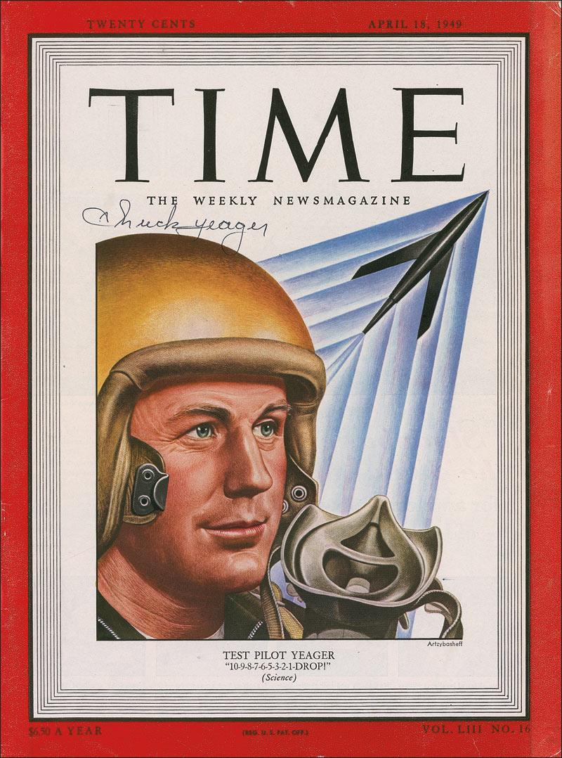 Complete issue of Time, dated April 18, 1949, featuring Yeager on the cover, signed on the cover in black ink. In fine condition, with some light handling wear and creasing to cover’s edge. Pre-certified Scott Cornish and RRAuction COA.