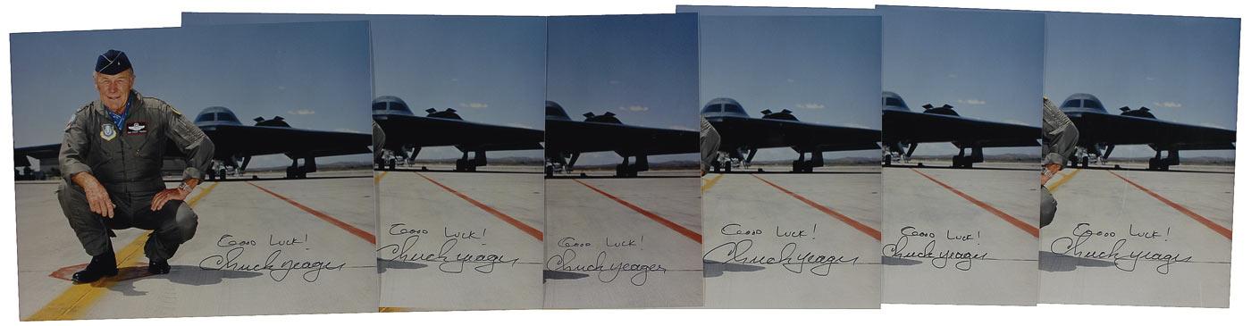 Six identical color glossy 10 x 8 photos of Yeager posing in front of a Stealth plane, each signed in black felt tip, “Good luck! Chuck Yeager.” In fine condition. Pre-certified Scott Cornish and RRAuction COA.