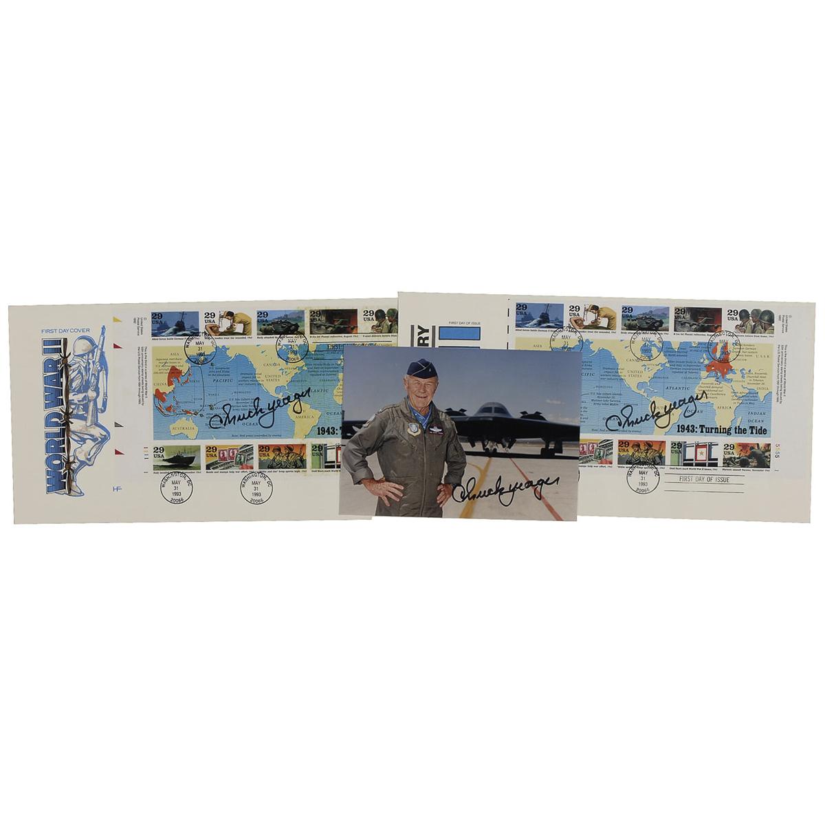Three items: color satin-finish 7 x 5 photo of Yeager posing in front of a Stealth, signed in black felt tip; and two oversized FDCs, 12.25 x 6.5, both commemorating World War II, each signed on the front in black felt tip. In very fine condition.