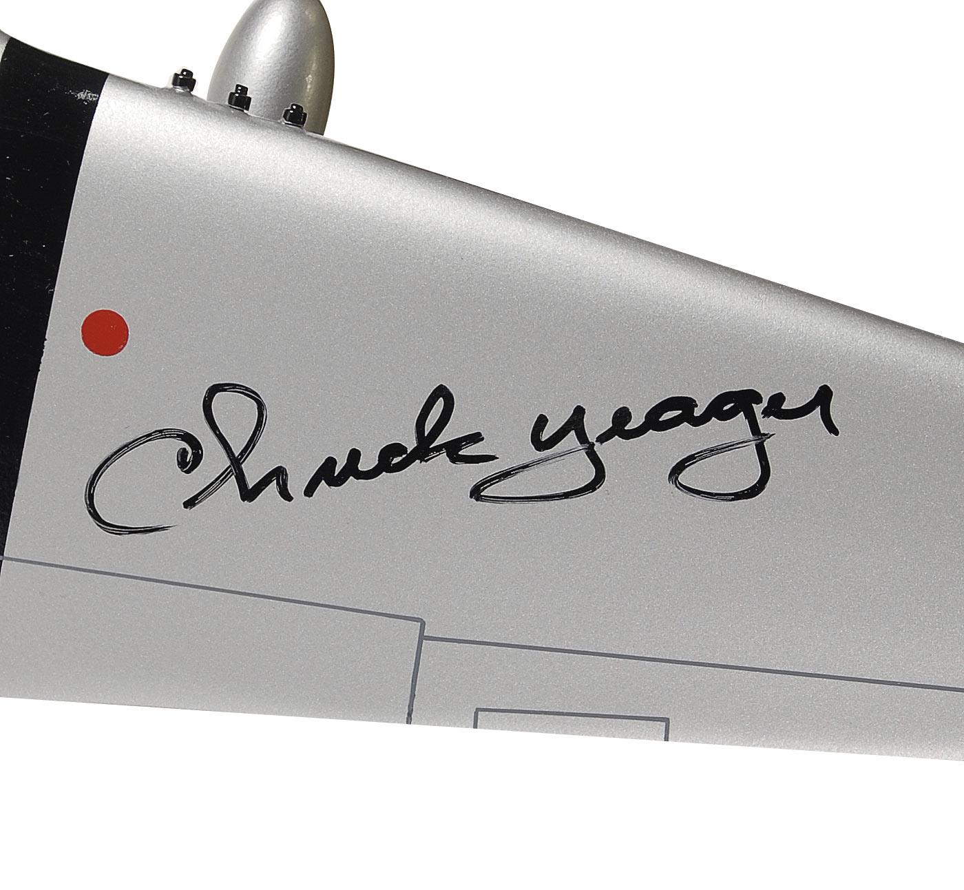 Solid wood scale model of Yeager’s Glamorous Glen III P-51D Mustang, signed on the wing in black felt tip by Yeager. In fine condition. Accompanied by a photo taken at time of signing. Assembly required.