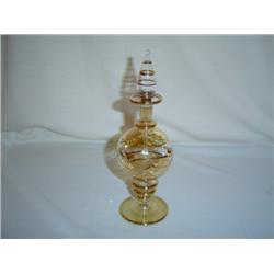 This is an 8.5" gold tone Egyptian Perfume Bottle with glass stopper. Each perfume bottle, individually crafted of hand-blown glass, hand-paint...