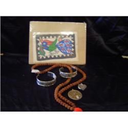 36" Ruk Seed Mala, Two Silver Tibetan Mantra Cuffs and two Silver Filigree Tibetan Pendants and hand painted Tibetan art print, 5" X 7"