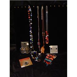 Collection of Bead Jewelry, 46" Necklace, Earth tones w/ gold tone accent with Post earrings, 60" glass and seed bead necklace, Beaded Pou...