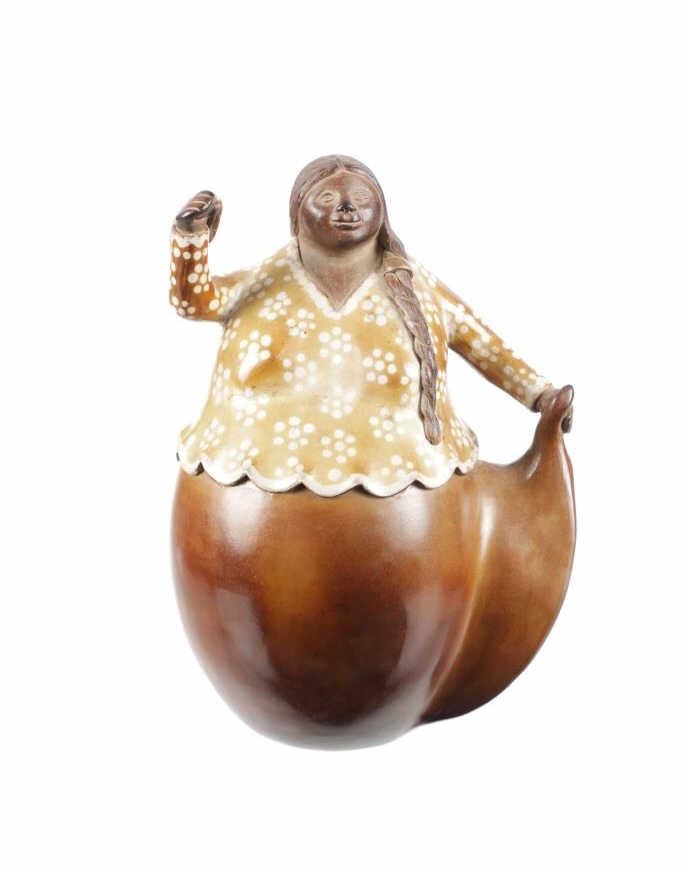 For your consideration is this beautiful piece of pottery made by Miguel Sullon Paz in Chulucanas, Peru in 1994. The piece shows a a woman holding a piece of cloth in her right hand and holding up part of her dress in her left hand as she smiles directly at the viewer. She is wearing a polka dot shirt and has her hair in one large braid. It is signed on the bottom reading, "Miguel Sullon Paz / Chulucanas, Peru 94". It shows good condition with slight wear present and no major signs of damage noted. It measures 4 1/2" L x 6" W x 8 1/4" H and weighs 1 pound and 10 ounces.