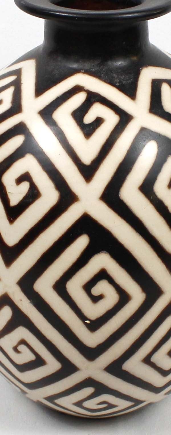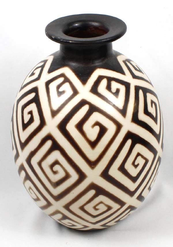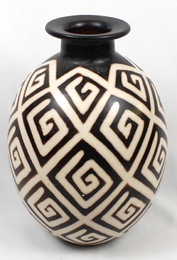 Chulucanas Peru Pottery Vase by Luis Salas, measures 8'' x 11'' and is signed on the bottom, created in the town of Chulucanas in northern Peru using techniques developed in pre-Inca times