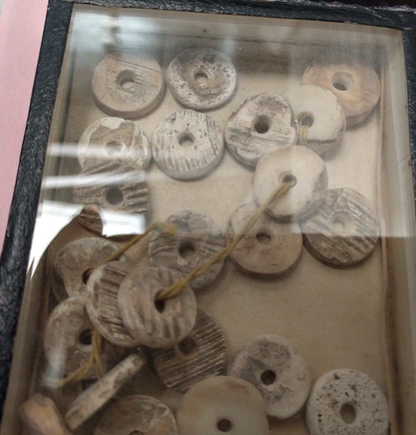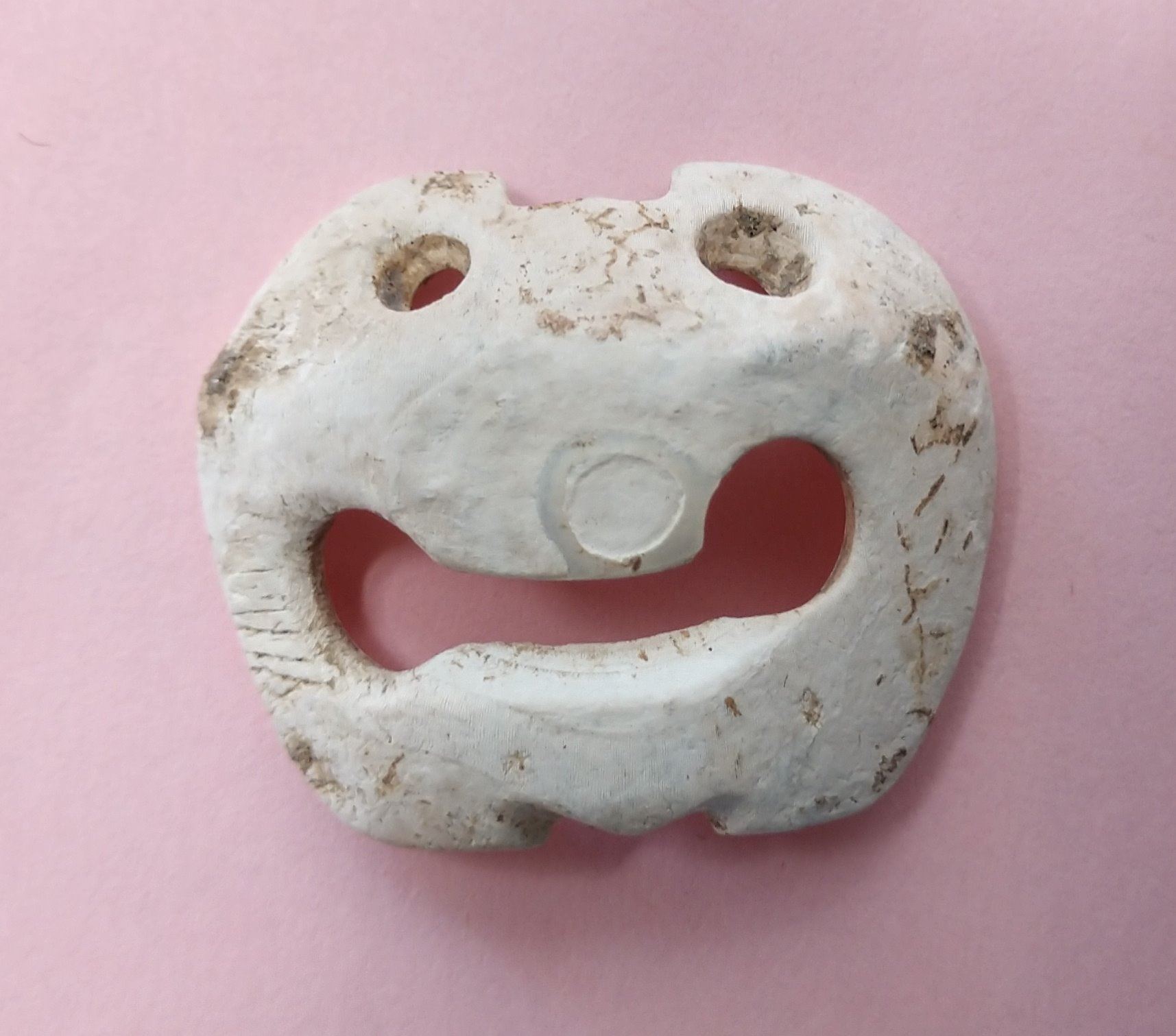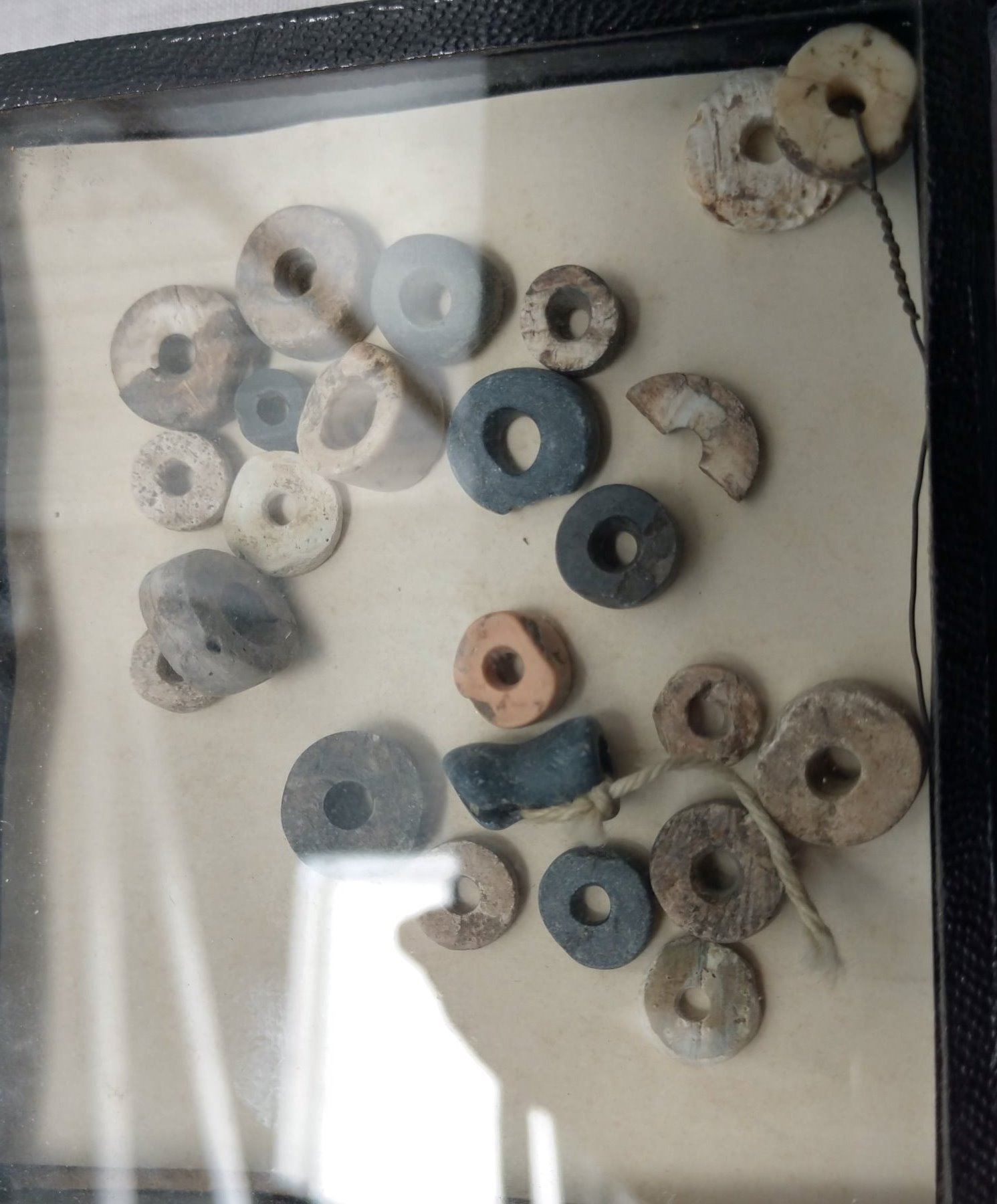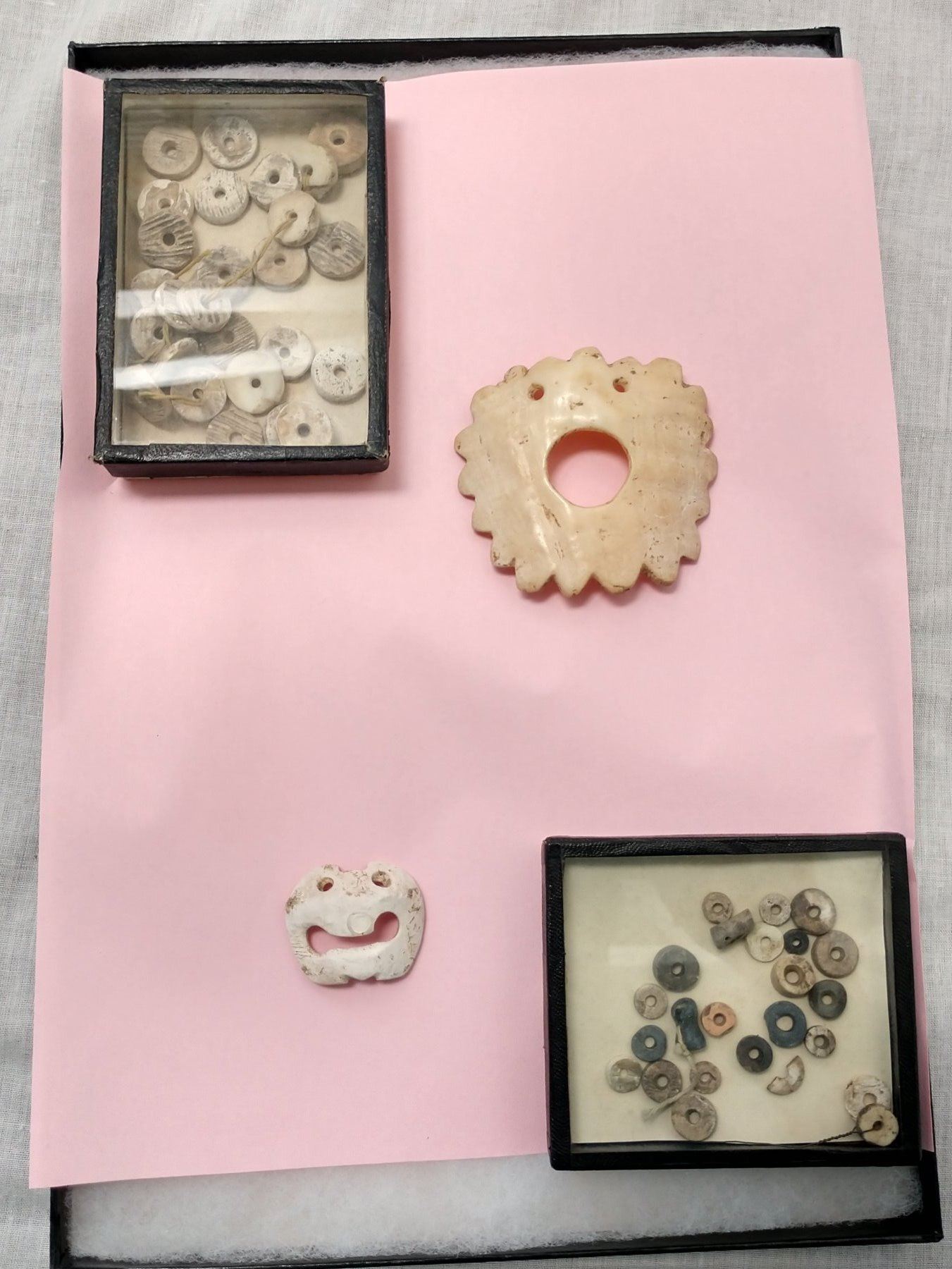 Chumash Artifact Collection, pre-historic item. Made of shell and stone, the items measure 1/8" to 2 3/4" long. Santa Barbara County, California. Effigy pendant. Condition: As found, see images. Shipping: $24.50 w/insurance and signature.