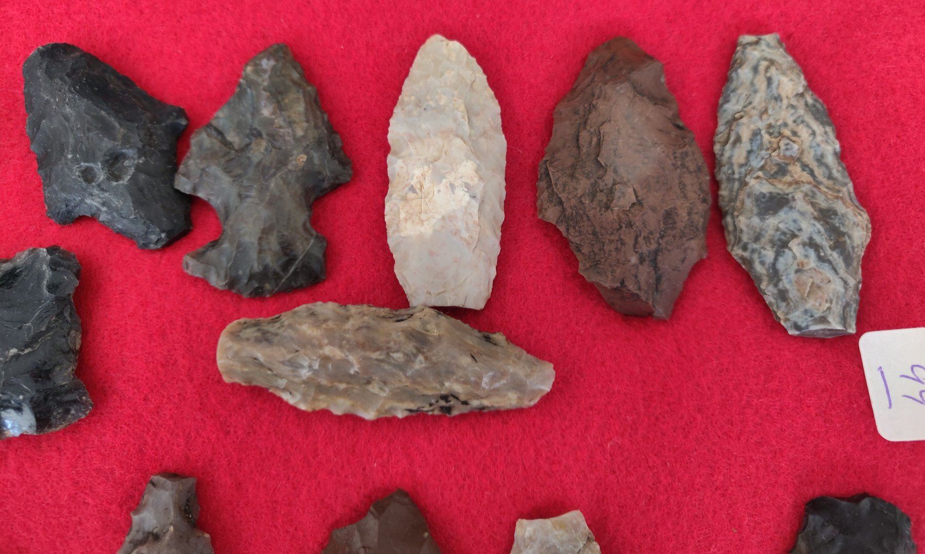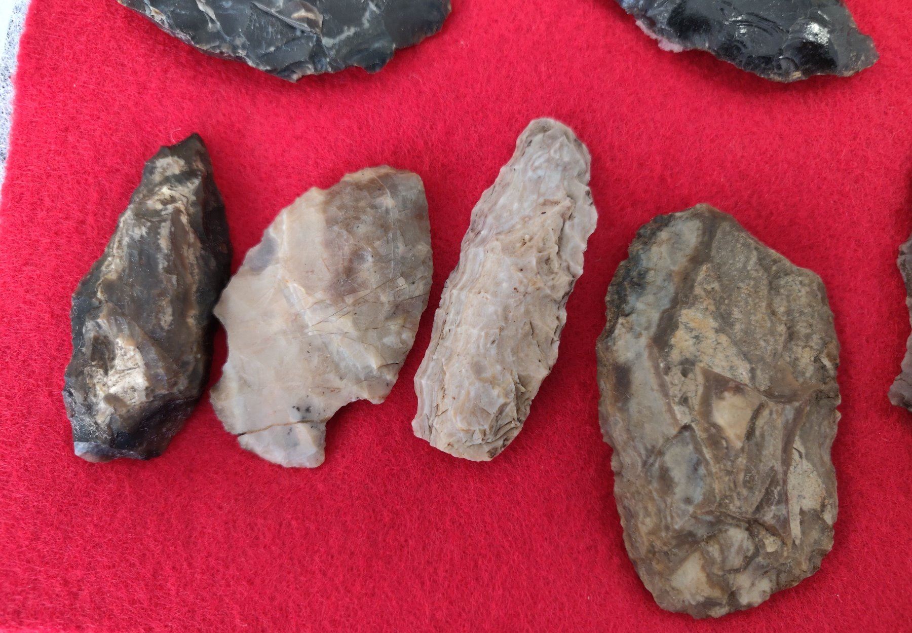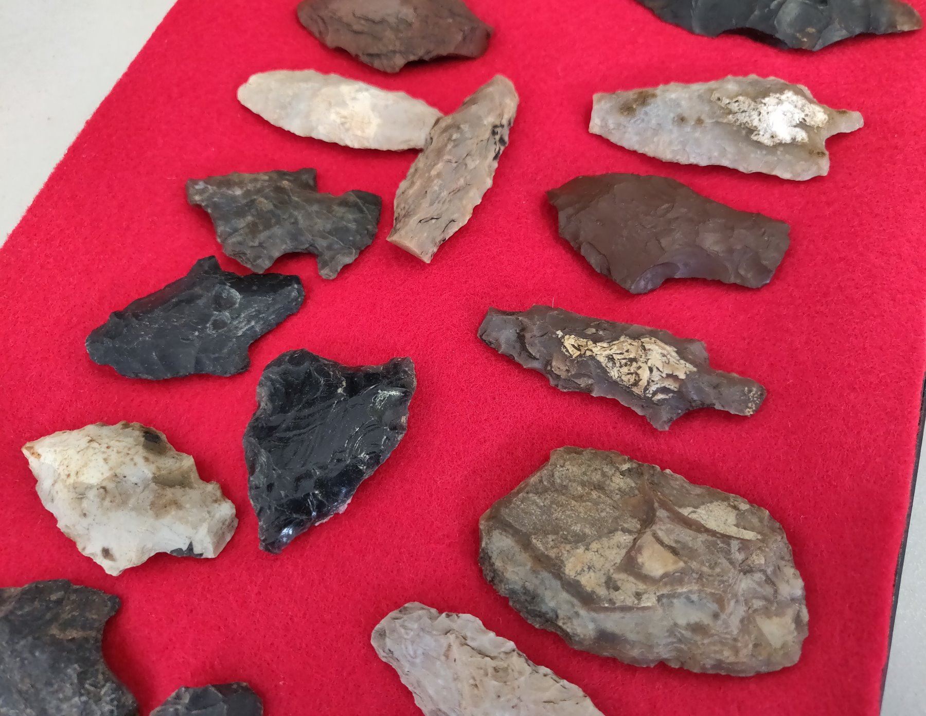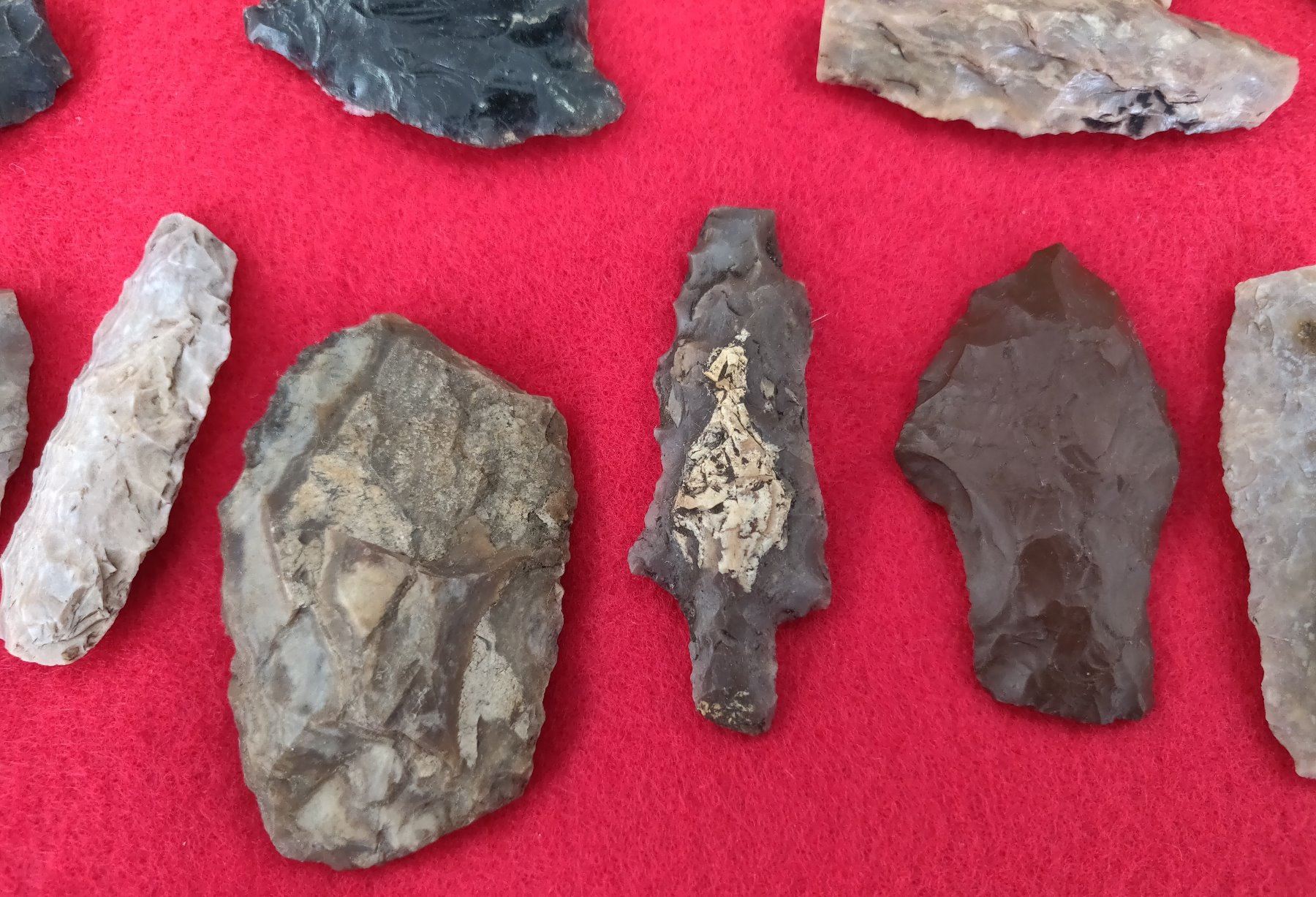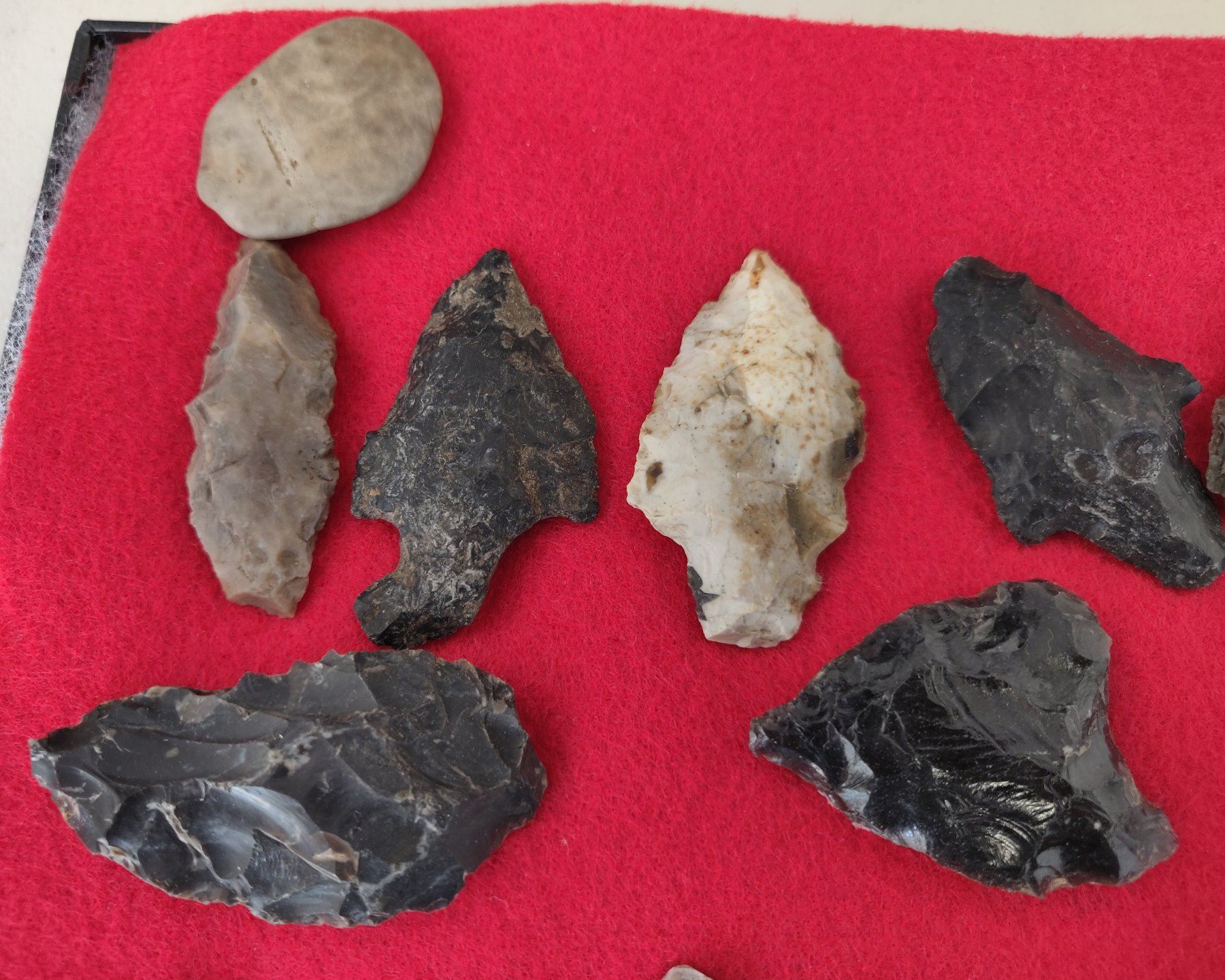 Chumash Artifact Collection, pre-historic items. Made of obsidian, flint and chert, the longest item measures 3". Santa Barbara County, California. Frame not included. Condition: As found, see images. Shipping: $24.50 w/insurance and signature.