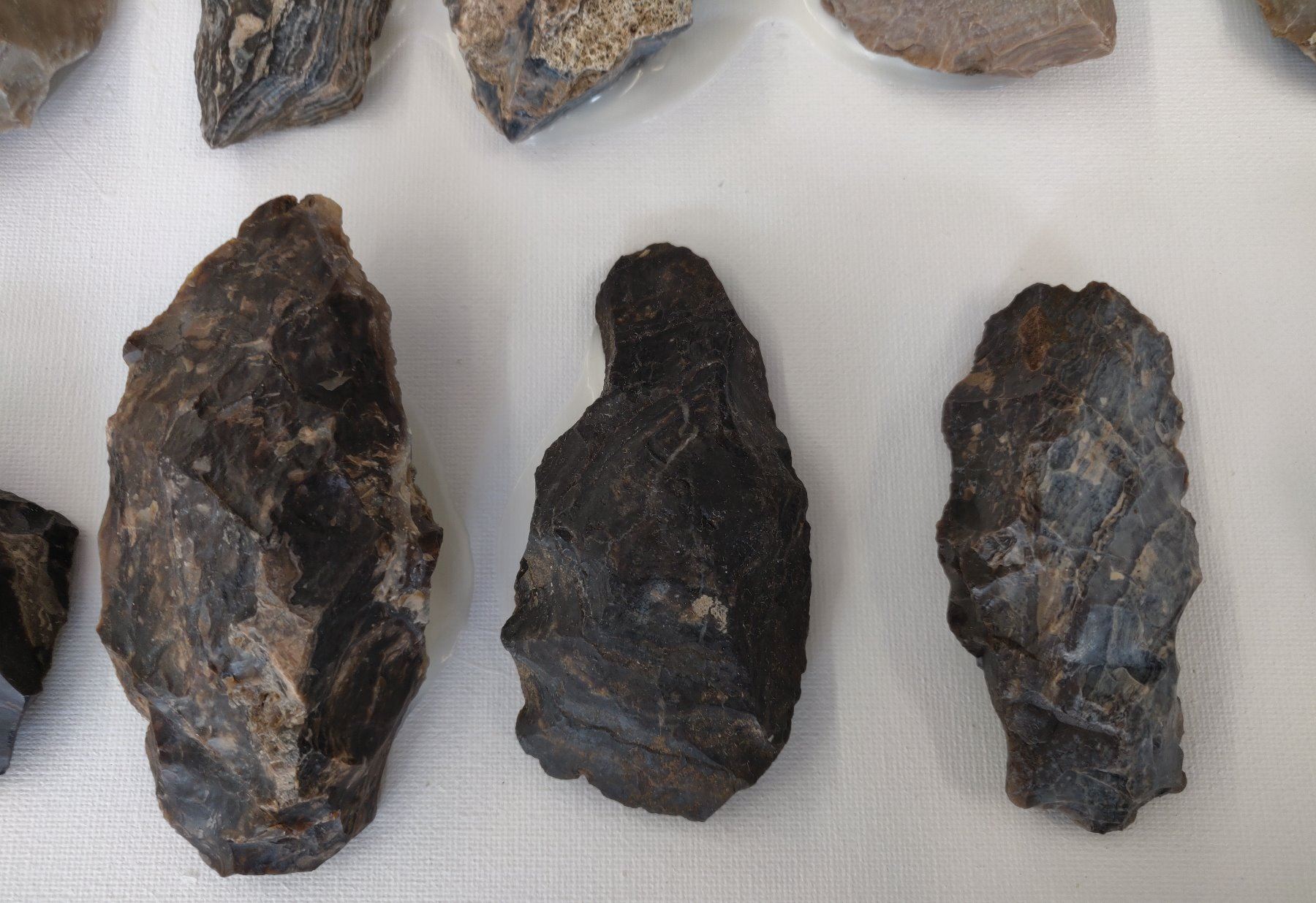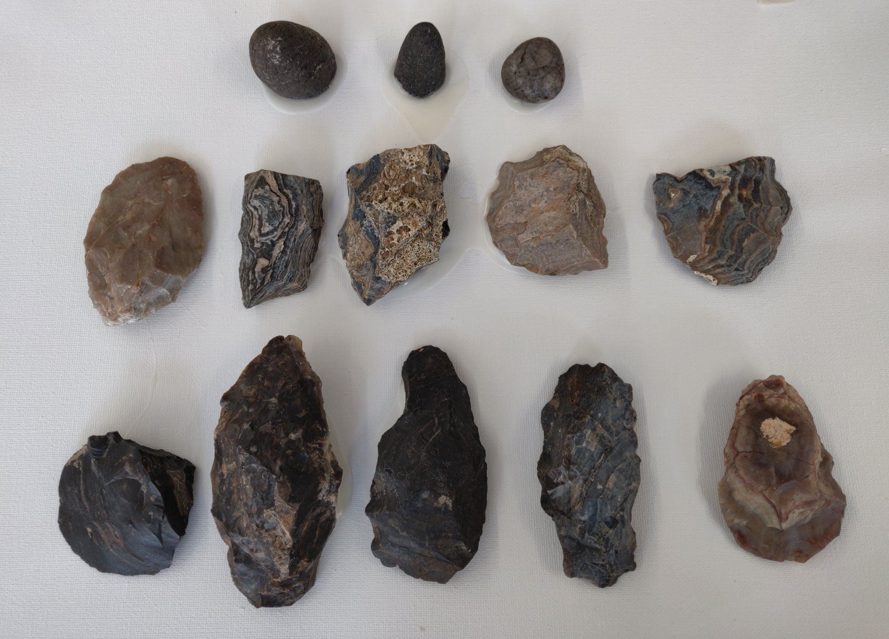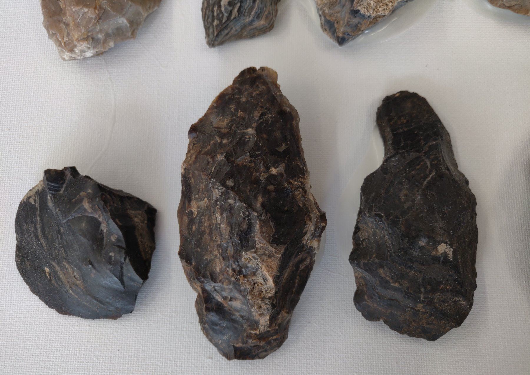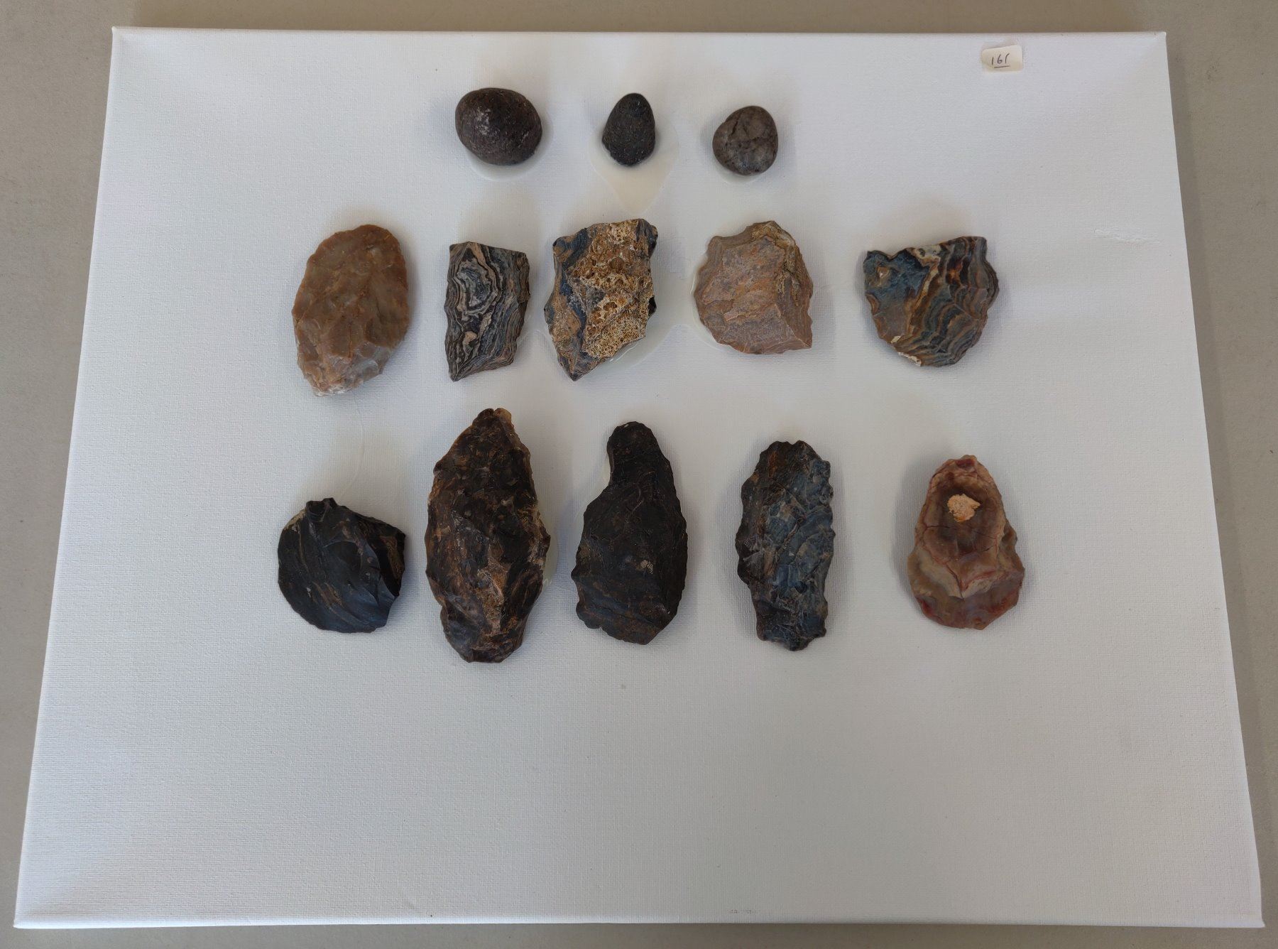 Chumash Artifact Collection, pre-historic items. Made of hematite, basalt and chert, the longest item measures 4 1/2". Santa Barbara County, California. Frame not included. Condition: As found, see images. Shipping: $30.00 w/insurance and signature.