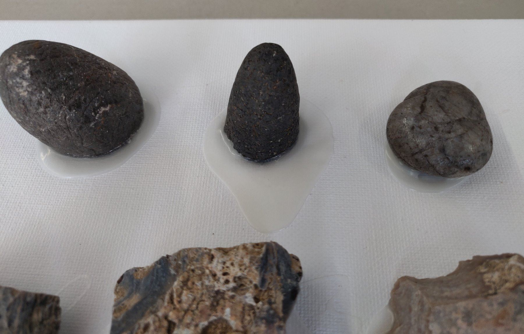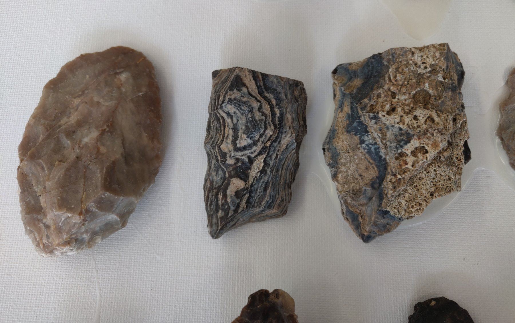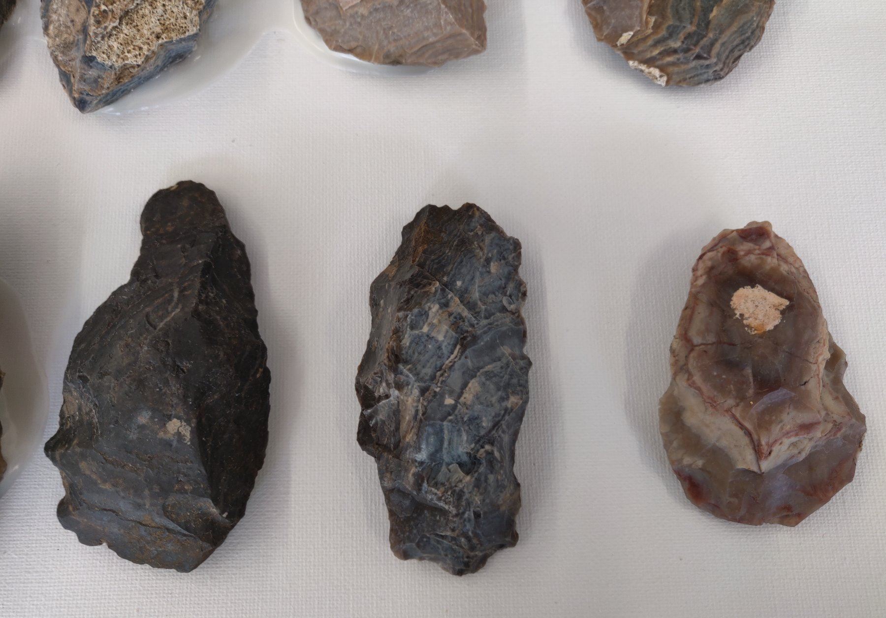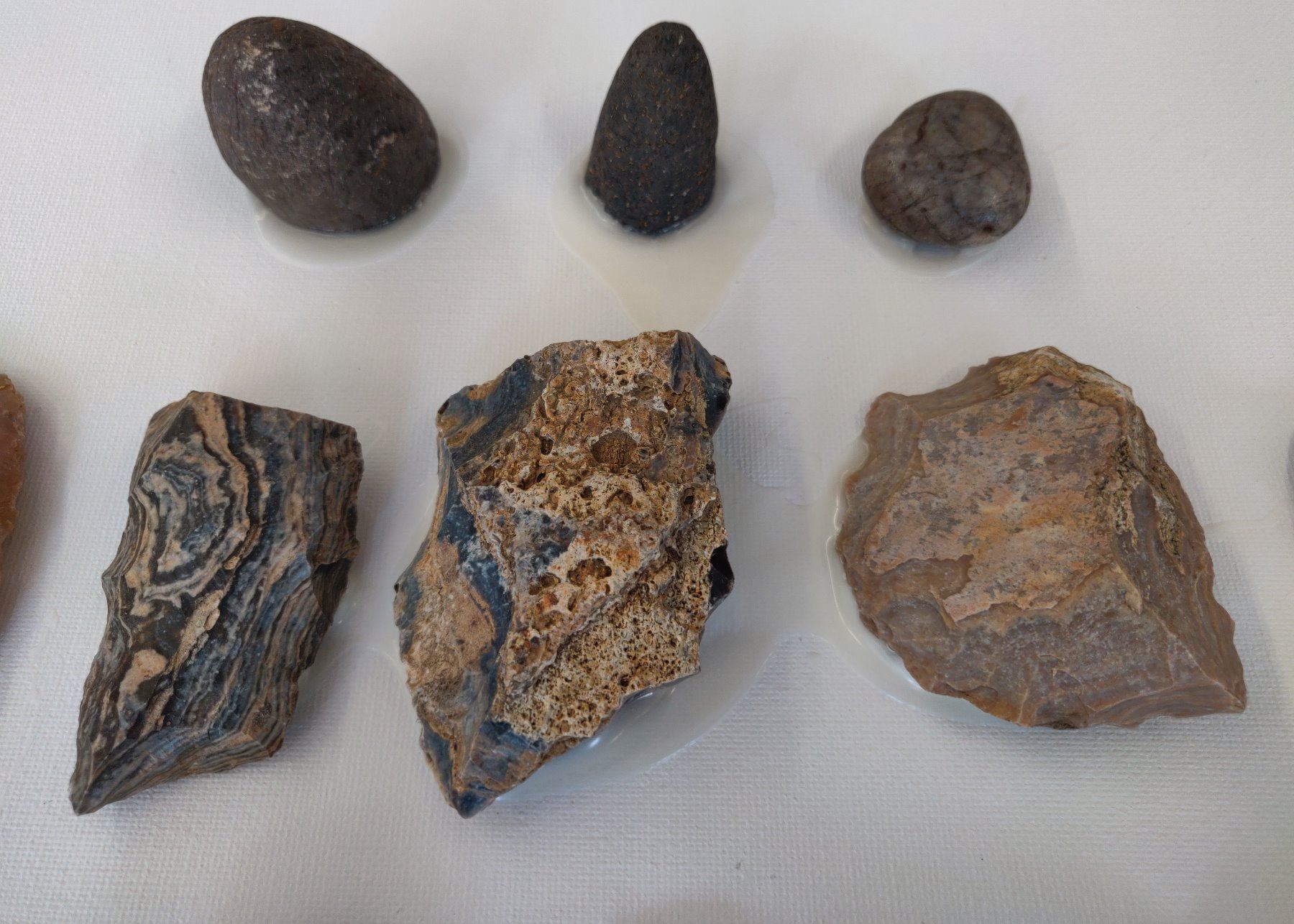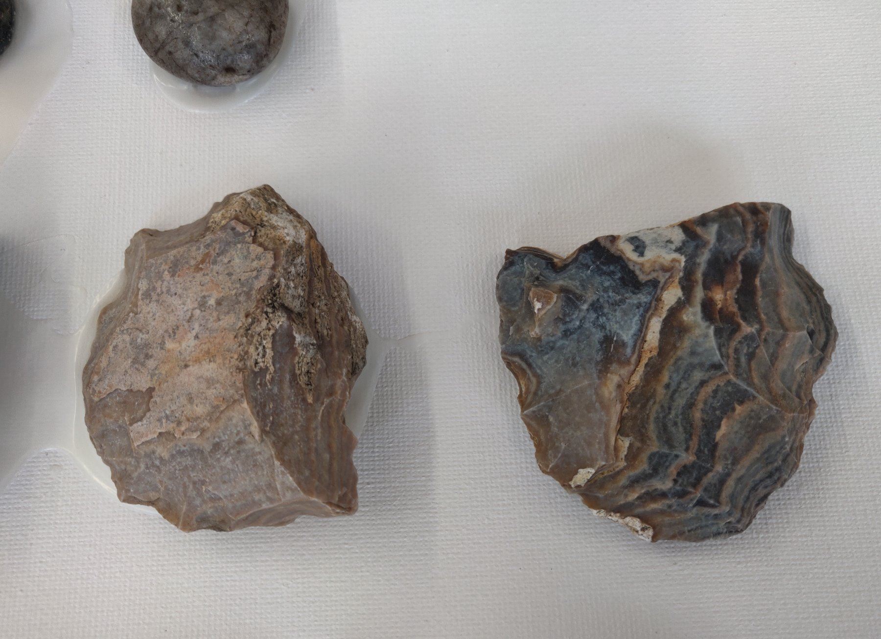 Chumash Artifact Collection, pre-historic items. Made of hematite, basalt and chert, the longest item measures 4 1/2". Santa Barbara County, California. Frame not included. Condition: As found, see images. Shipping: $30.00 w/insurance and signature.