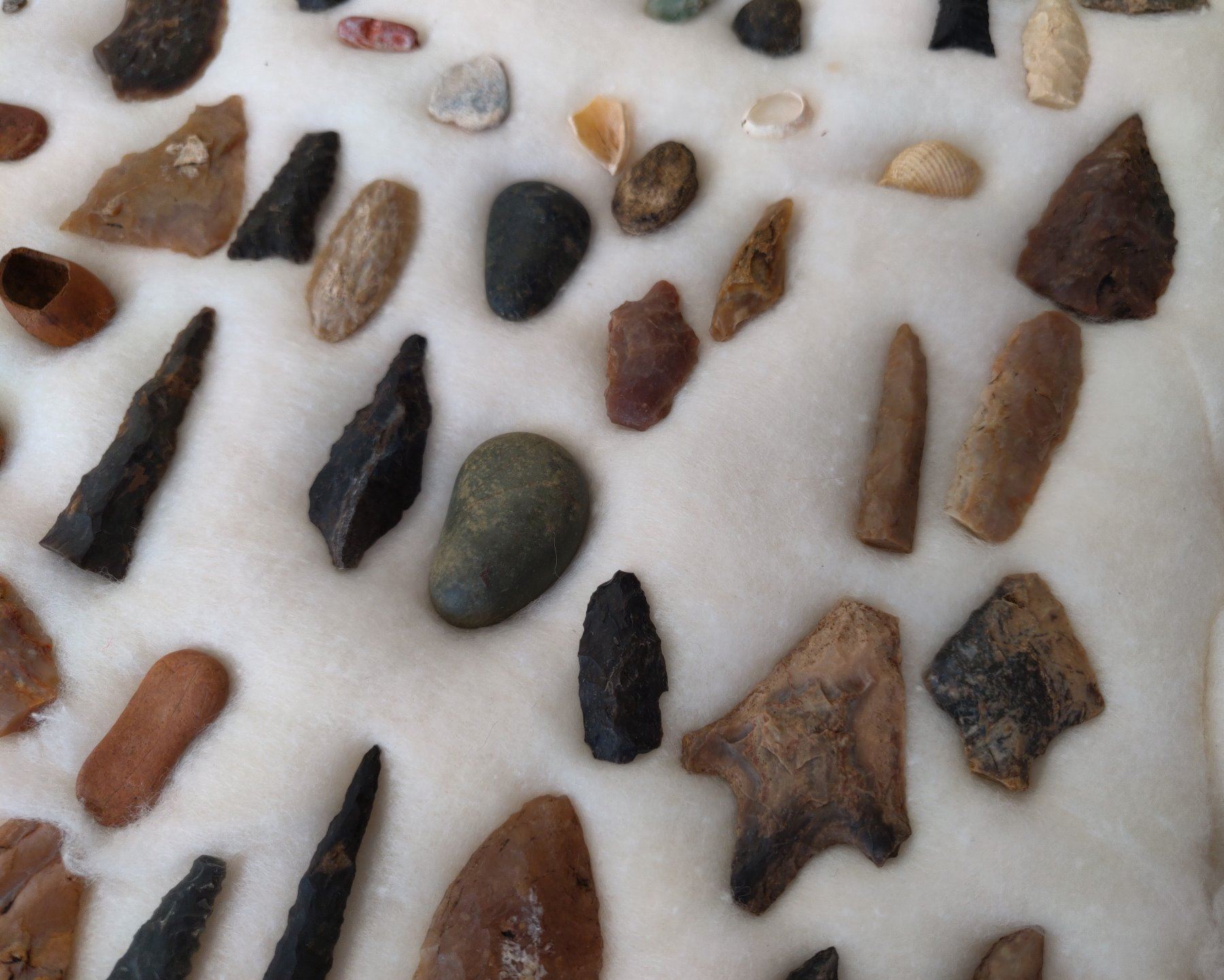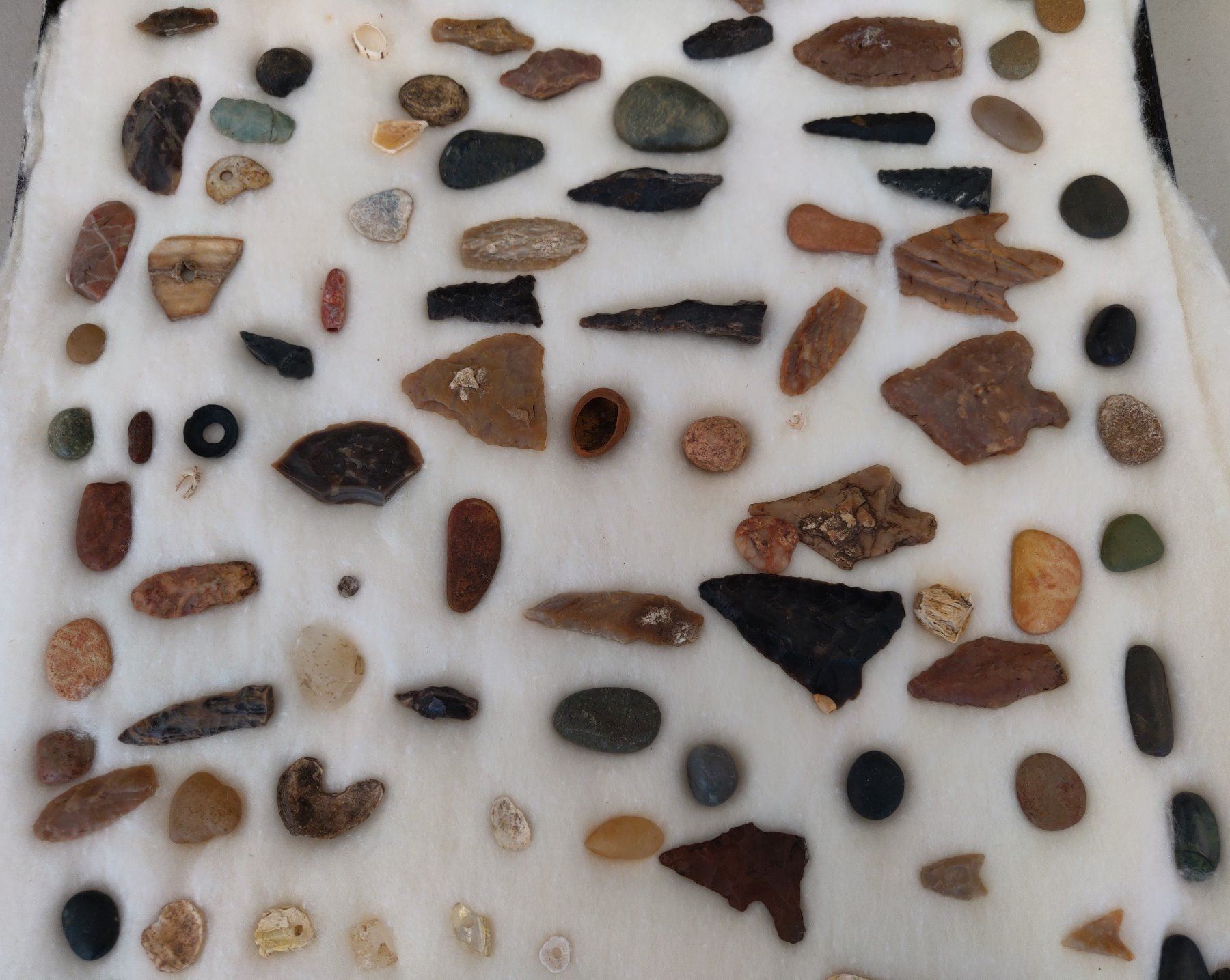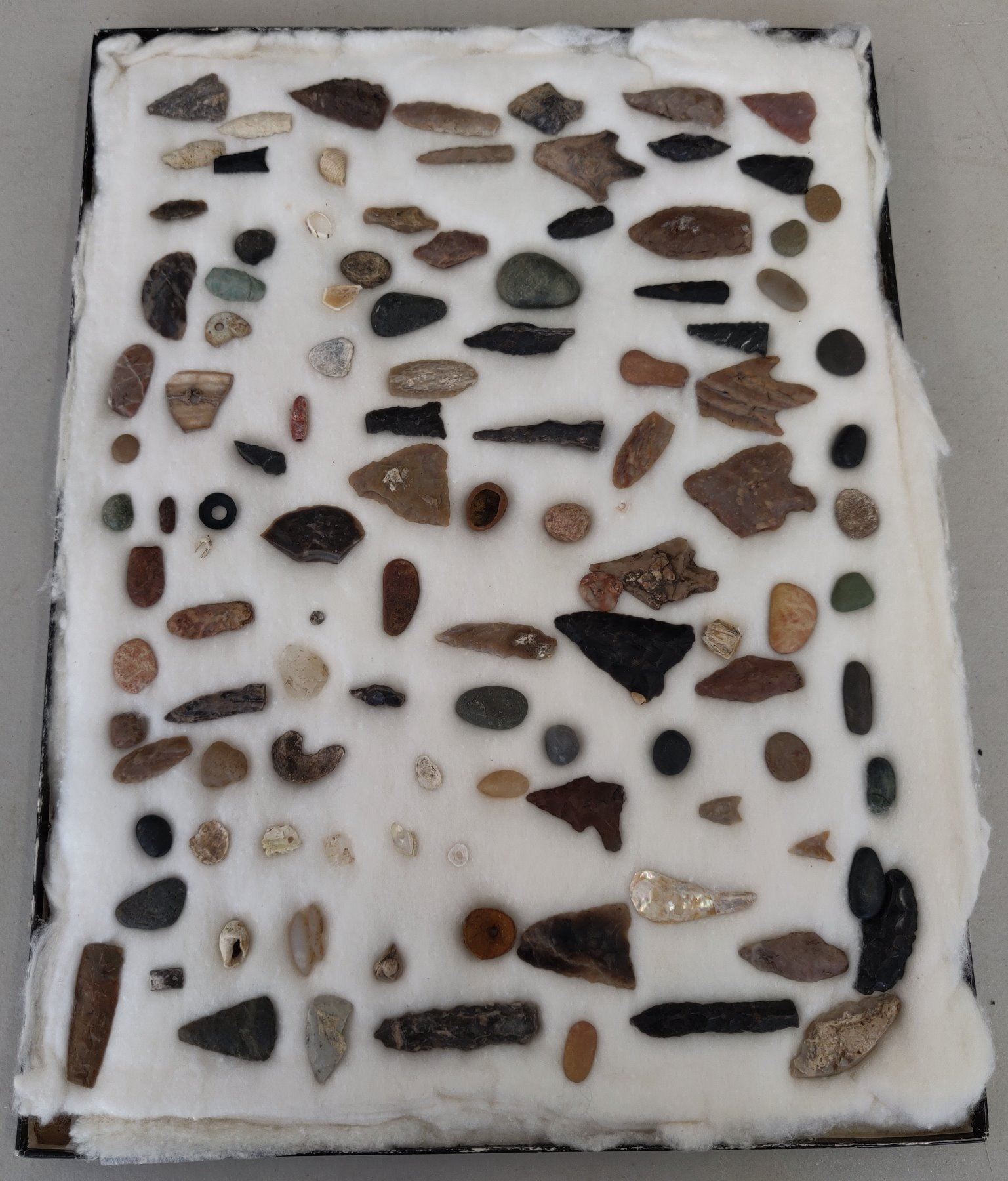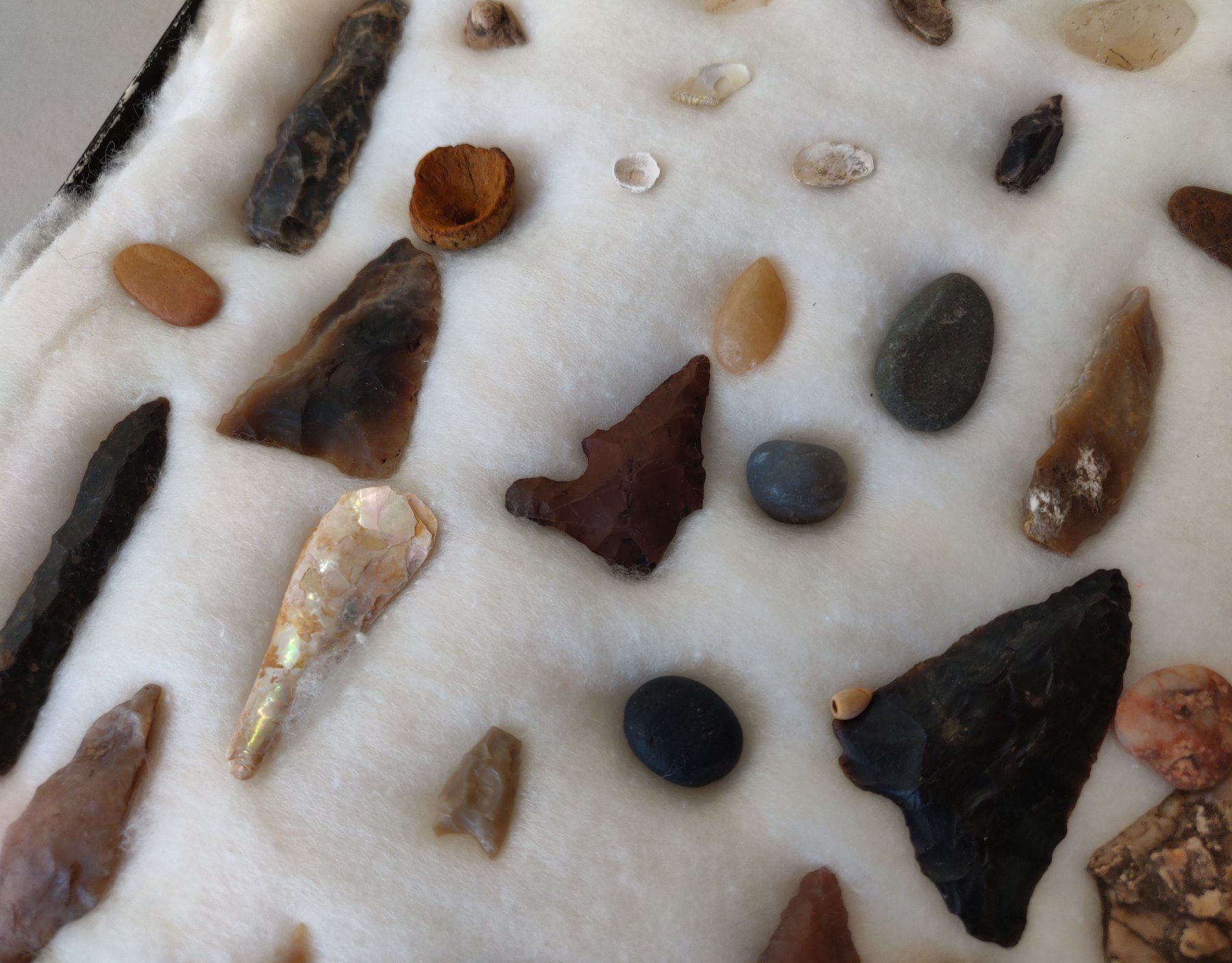 Chumash Artifact Collection, pre-historic items. Made of obsidian, flint, shell and chert, the longest item measures 2 1/2". Santa Barbara County, California. Frame not included. Condition: As found, see images. Shipping: $30.00 w/insurance and signature.