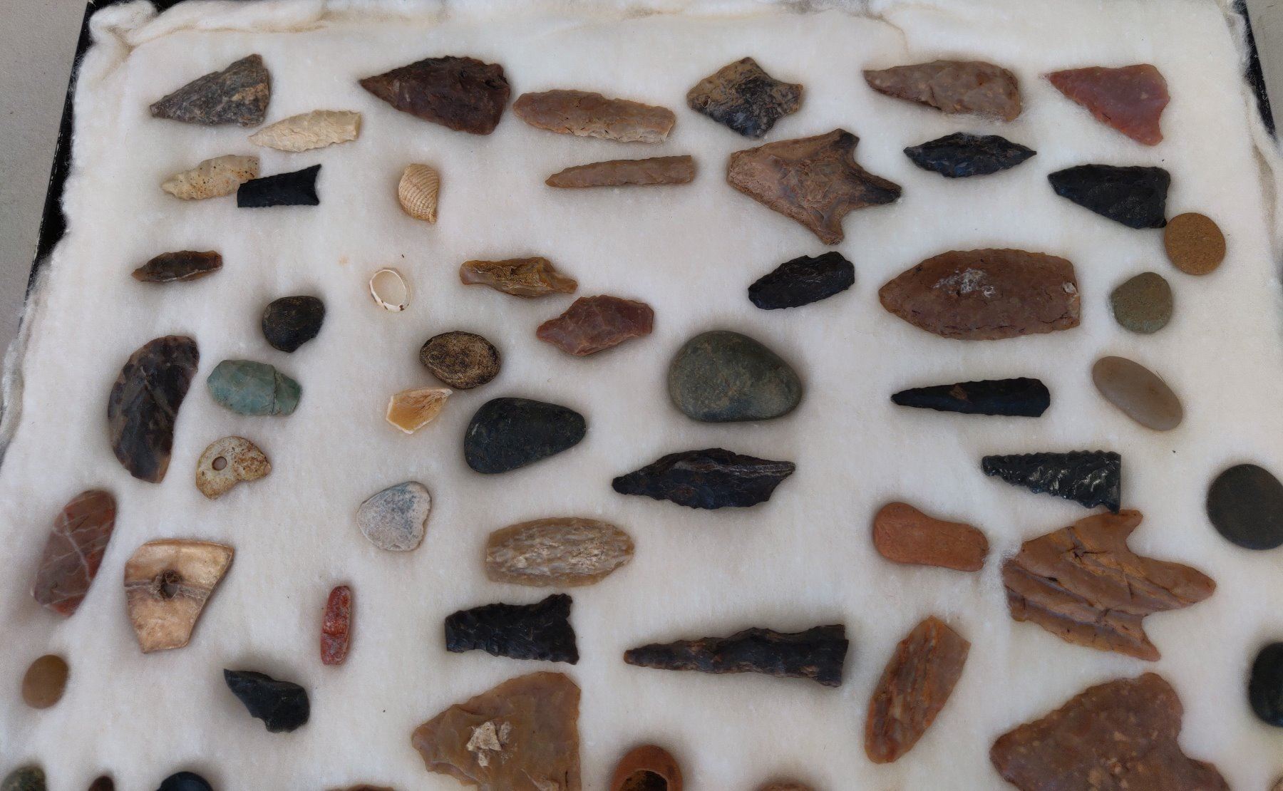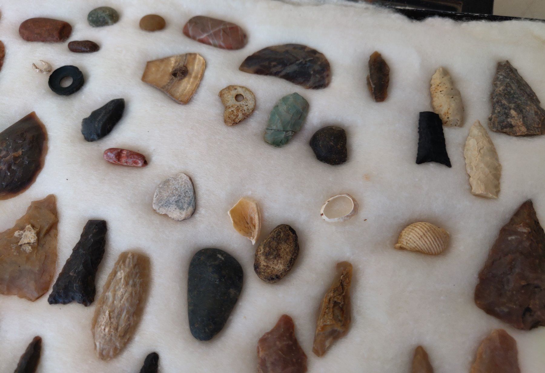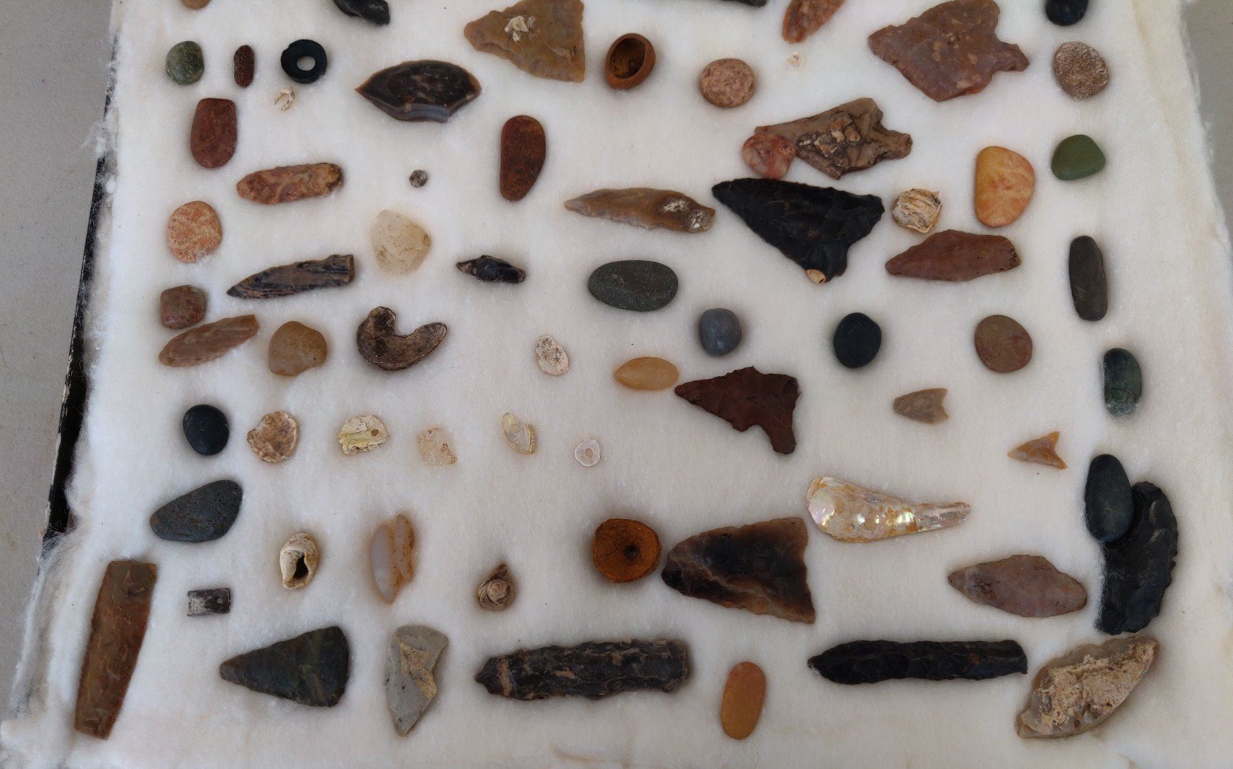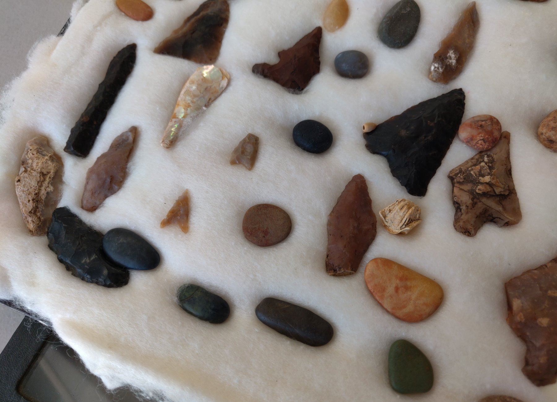 Chumash Artifact Collection, pre-historic items. Made of obsidian, flint, shell and chert, the longest item measures 2 1/2". Santa Barbara County, California. Frame not included. Condition: As found, see images. Shipping: $30.00 w/insurance and signature.