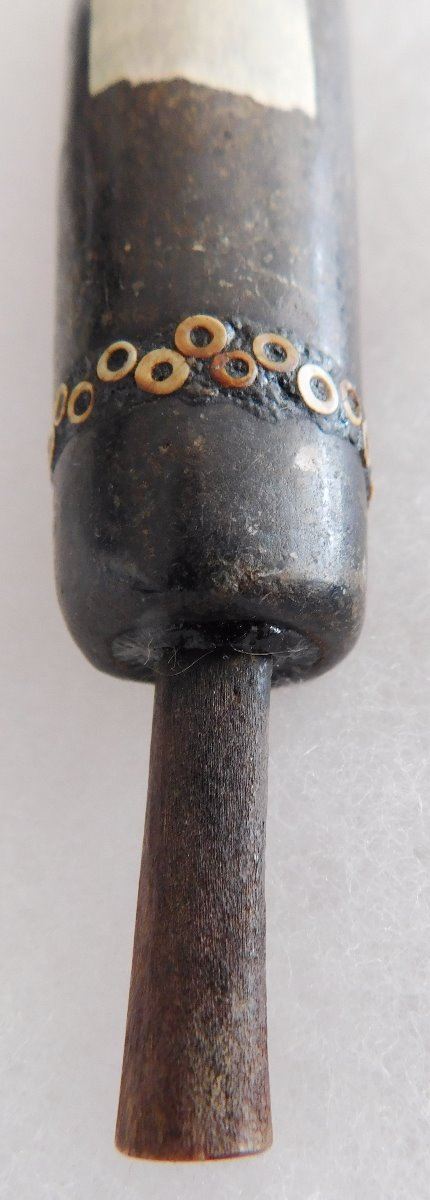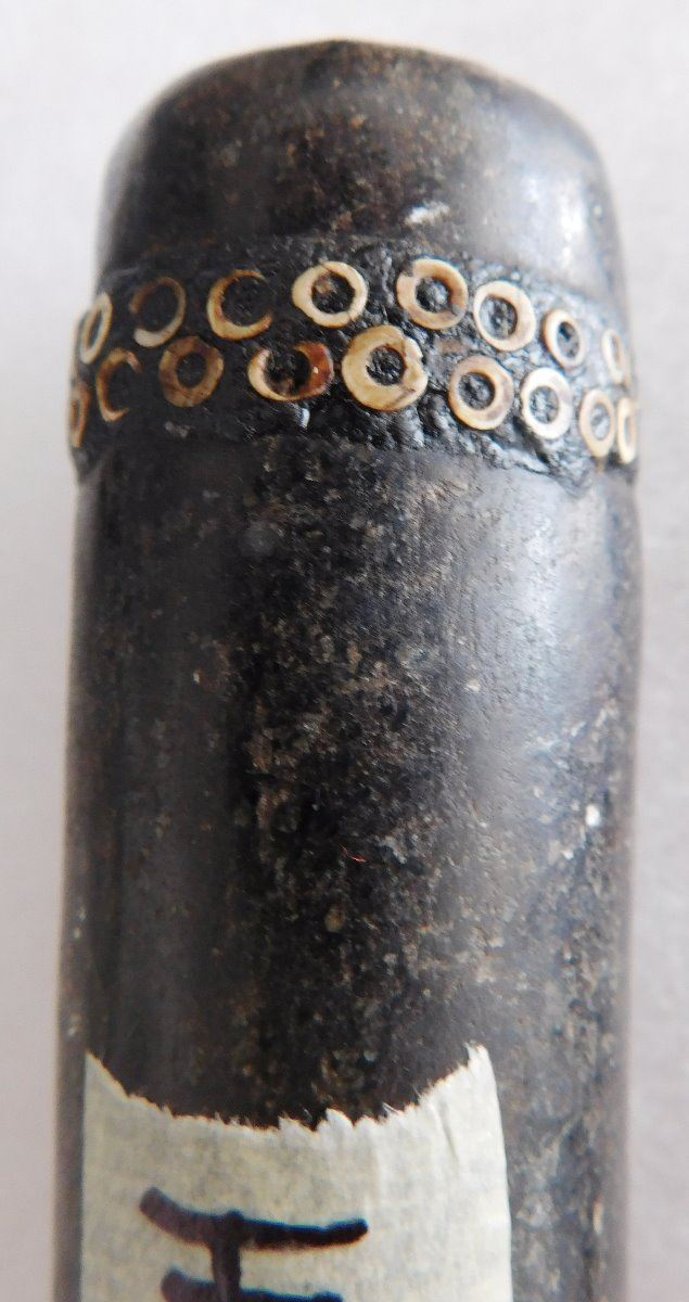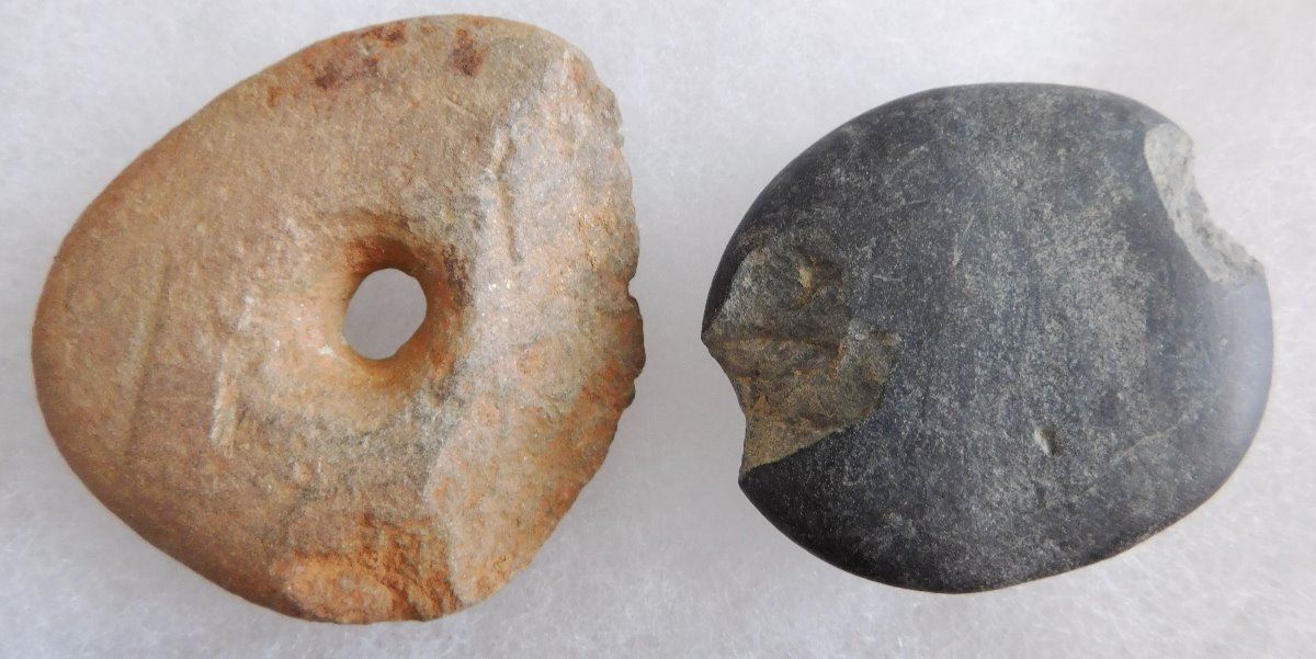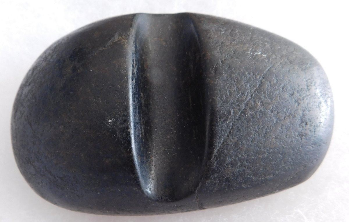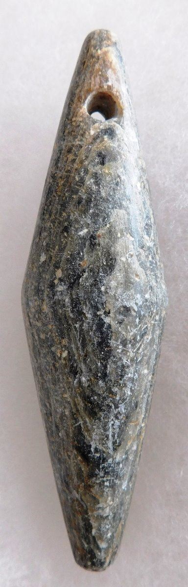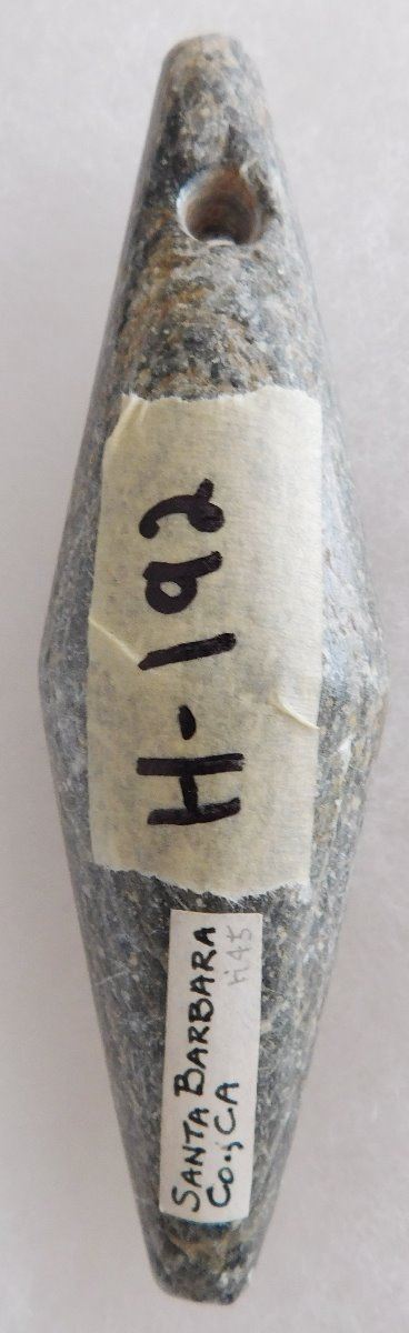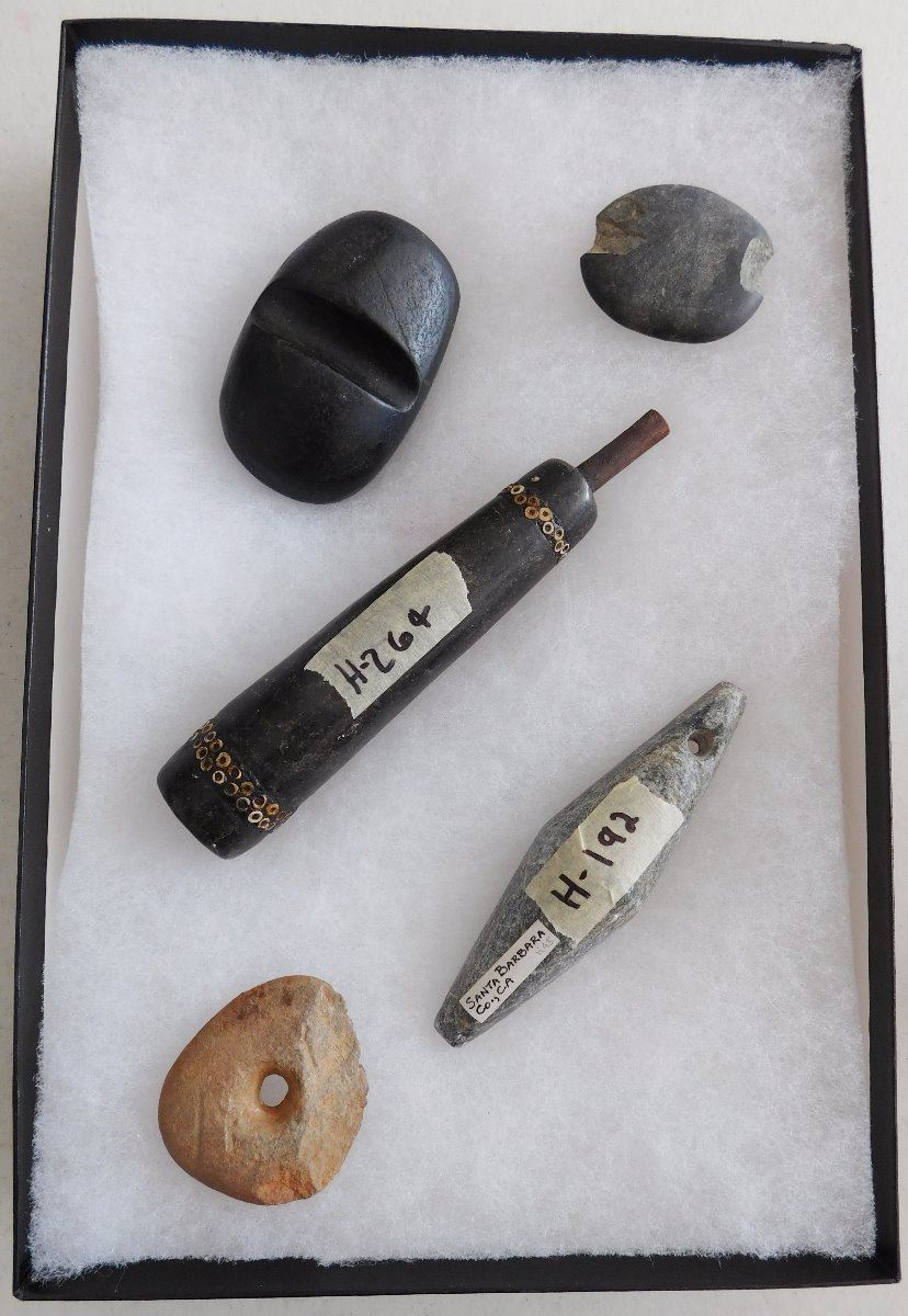 Chumash California Stone Collection, pre-historic items. Made of steatite, sandstone, shell inlay and a bird-bone mouthpiece on pipe. Plummet stone measures 4.5" x 1.25" x 1", pipe is 6" x 1.25" x 1.25", arrowshaft straightener is 3" x 2" x 1.25". Santa Barbara County, Santa Catalina Island. Also included are a small donut stone and sinker. Frame not included. Condition: Very good, as found, see images. Shipping: $30.00 w/insurance and signature, double boxed.