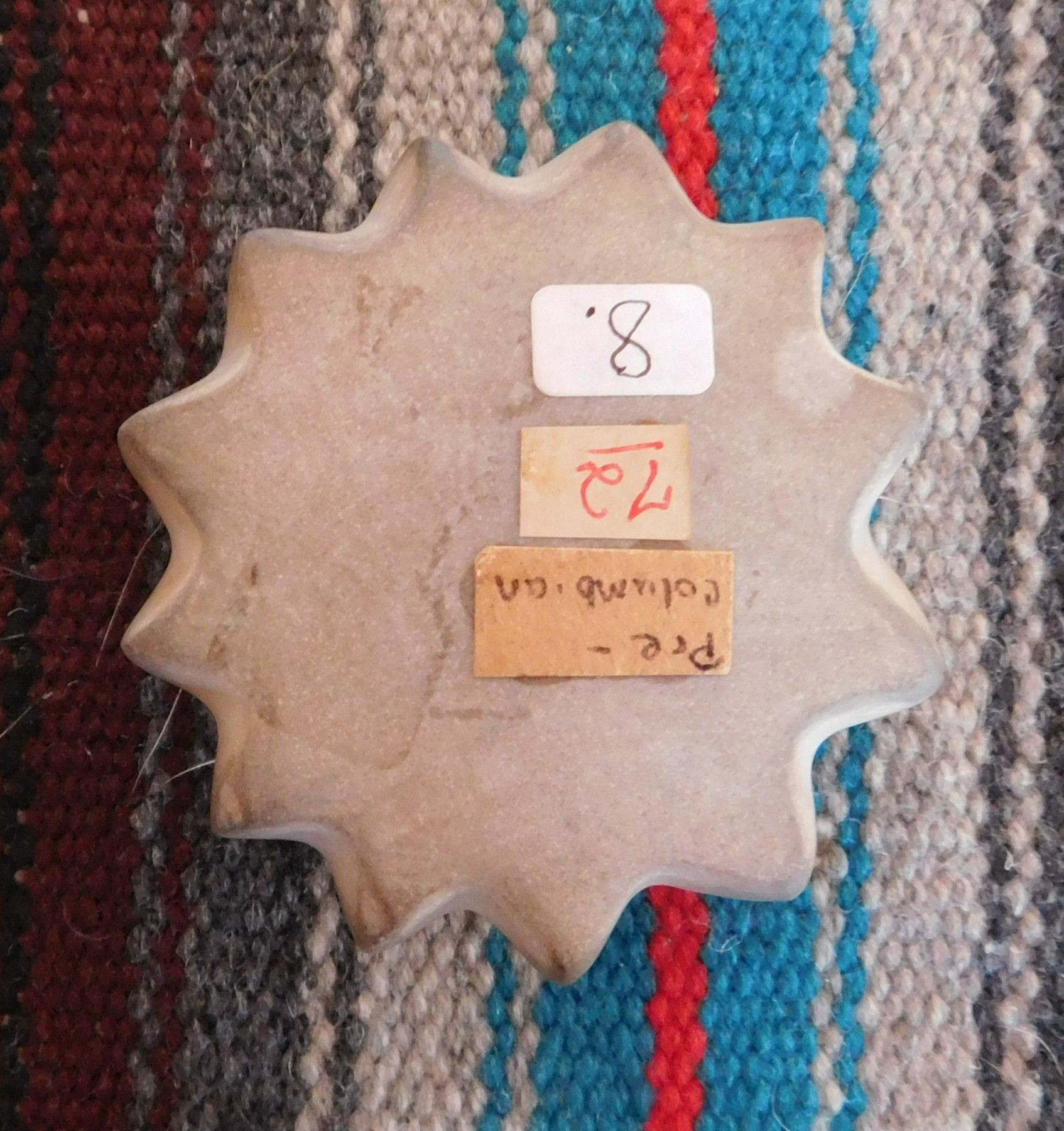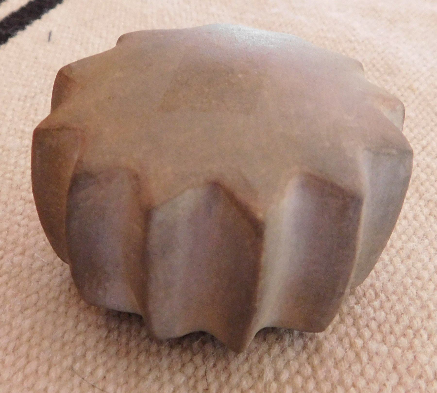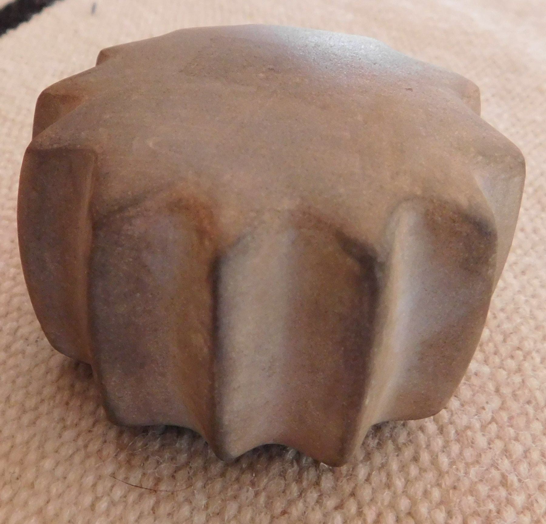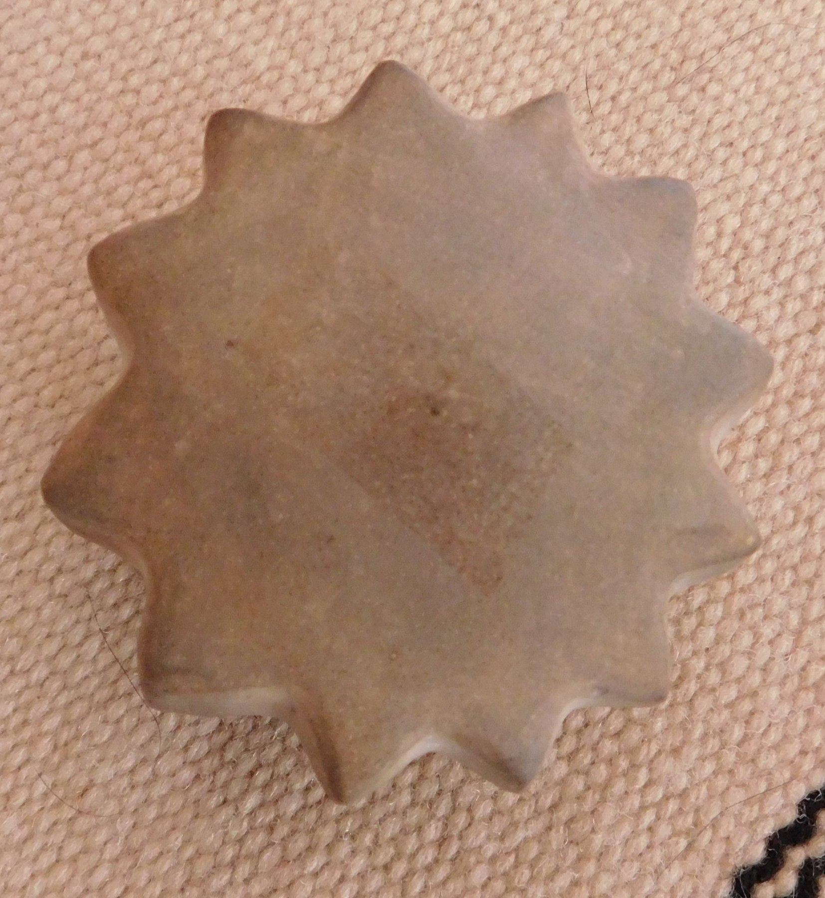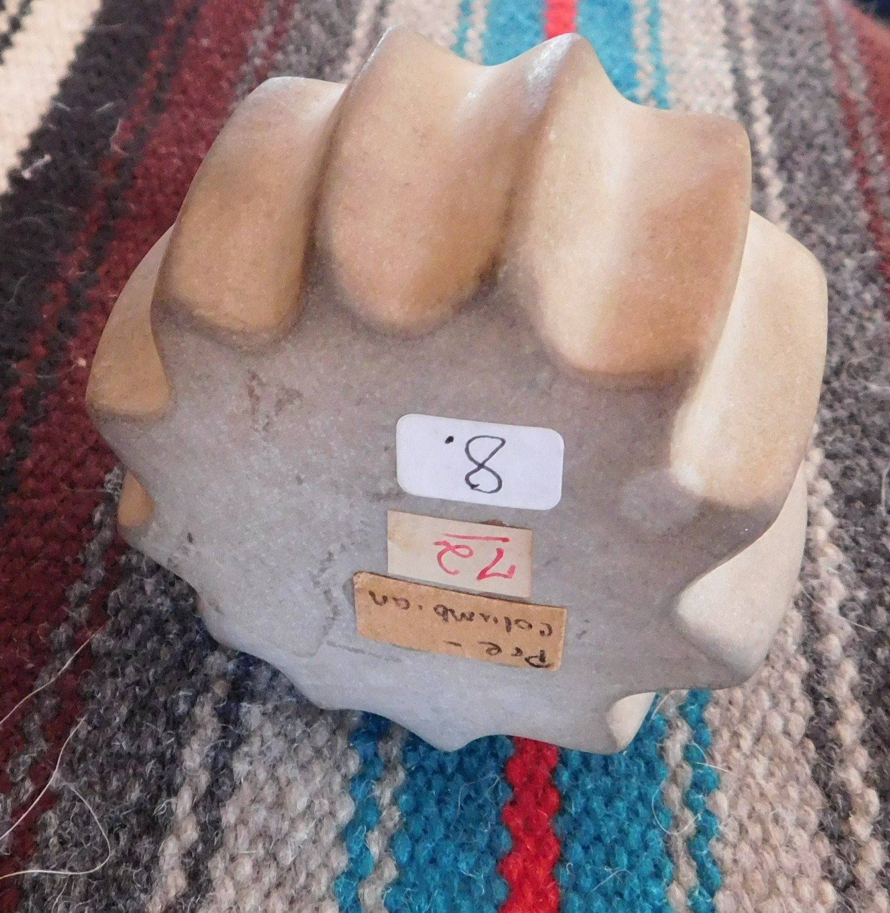 Chumash Cog Stone, pre-historic item. Made of granite stone, the item measures 2.5" x 2.5" x 1.5". Chumash, California. This very rare cog stone is finely carved. Condition: Very good, see images. Shipping: $20.00 w/insurance and signature.
