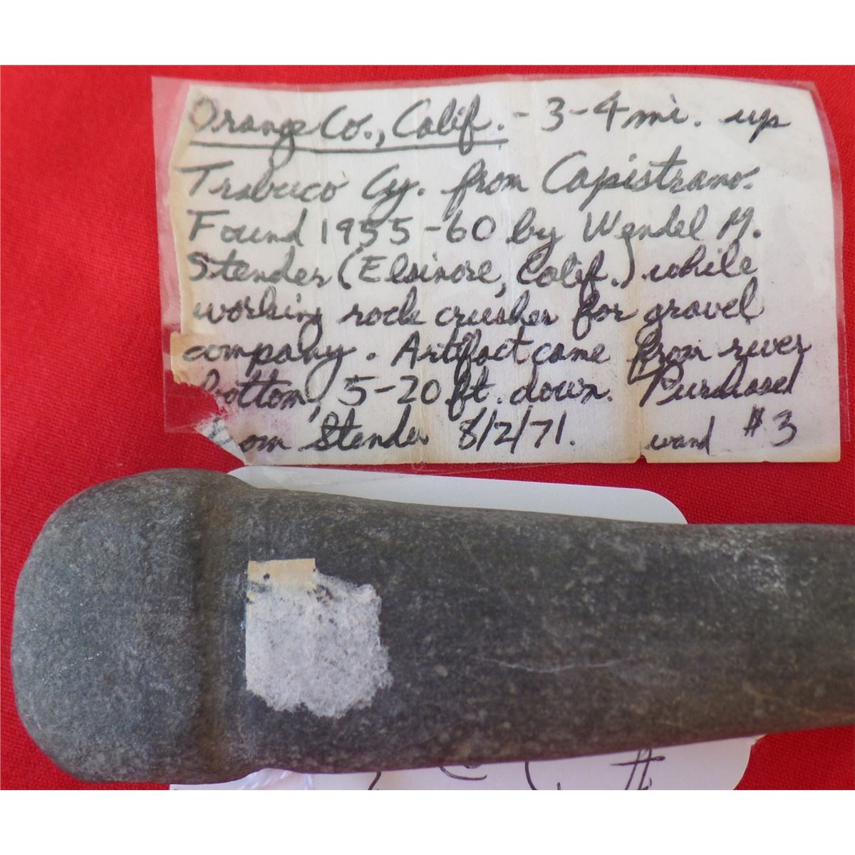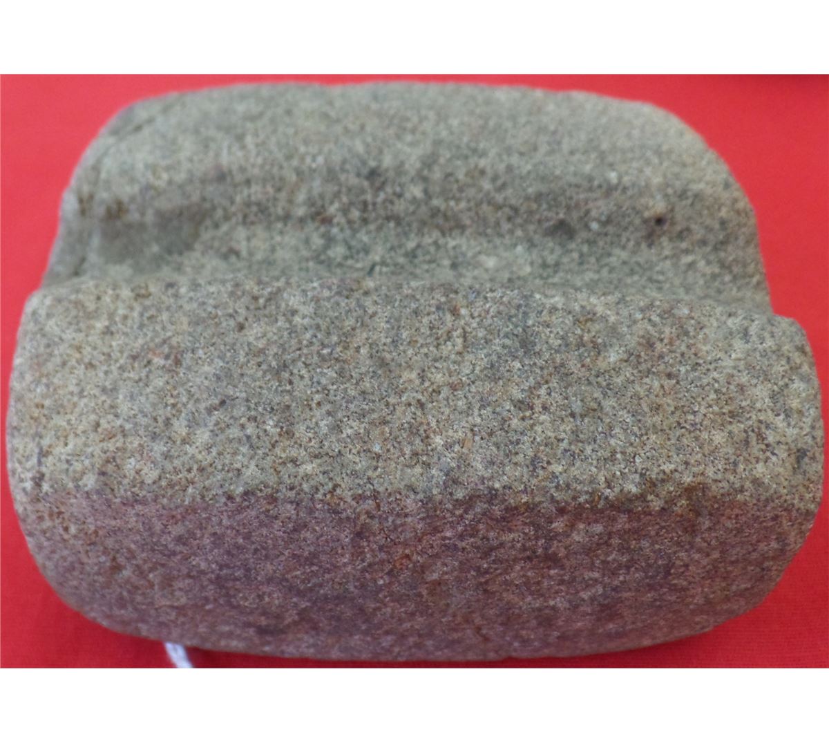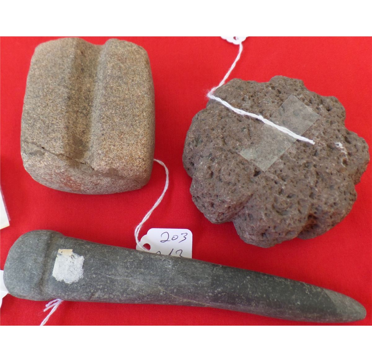Chumash Cogstone & Others. Circa 1000 AD. Cogstone is made of basalt, the arrowshaft straightener is sandstone, the plummet stone is made of basalt. Plummet measures 6.5", cogstone 3", and arrowshaft straightener is 3" x 2.5". Chumash, California, plummet has good data on finding. Very rare, authentic relics. Cogstones are seldom seen. Condition: Arrowshaft straightener fractured and glued, plummet and cogstone are in good condition. Shipping: $22.