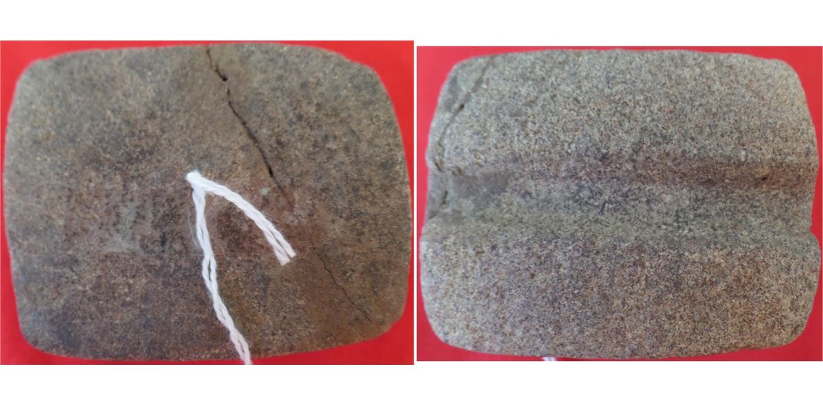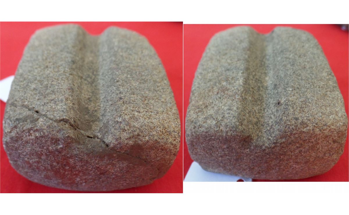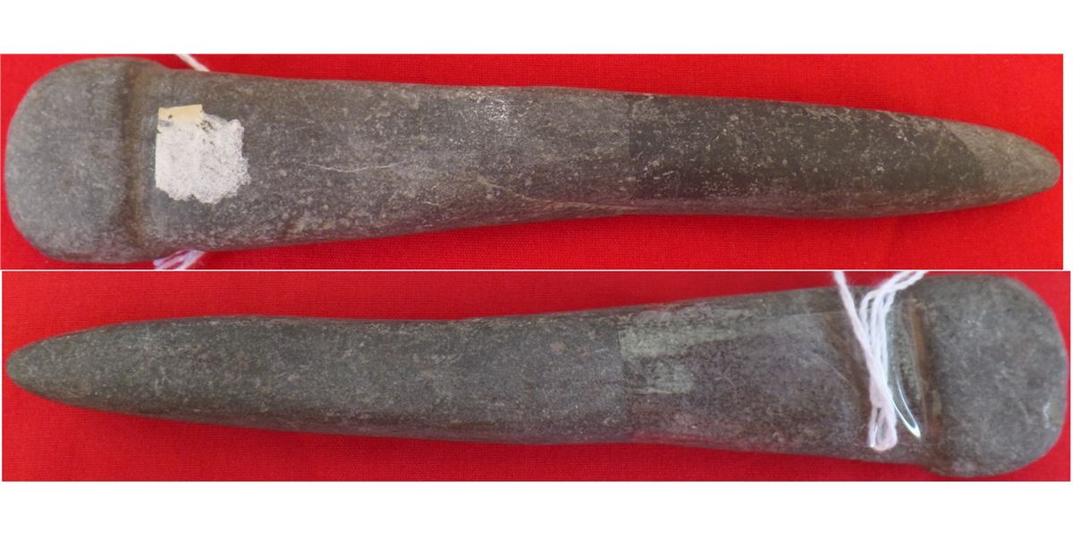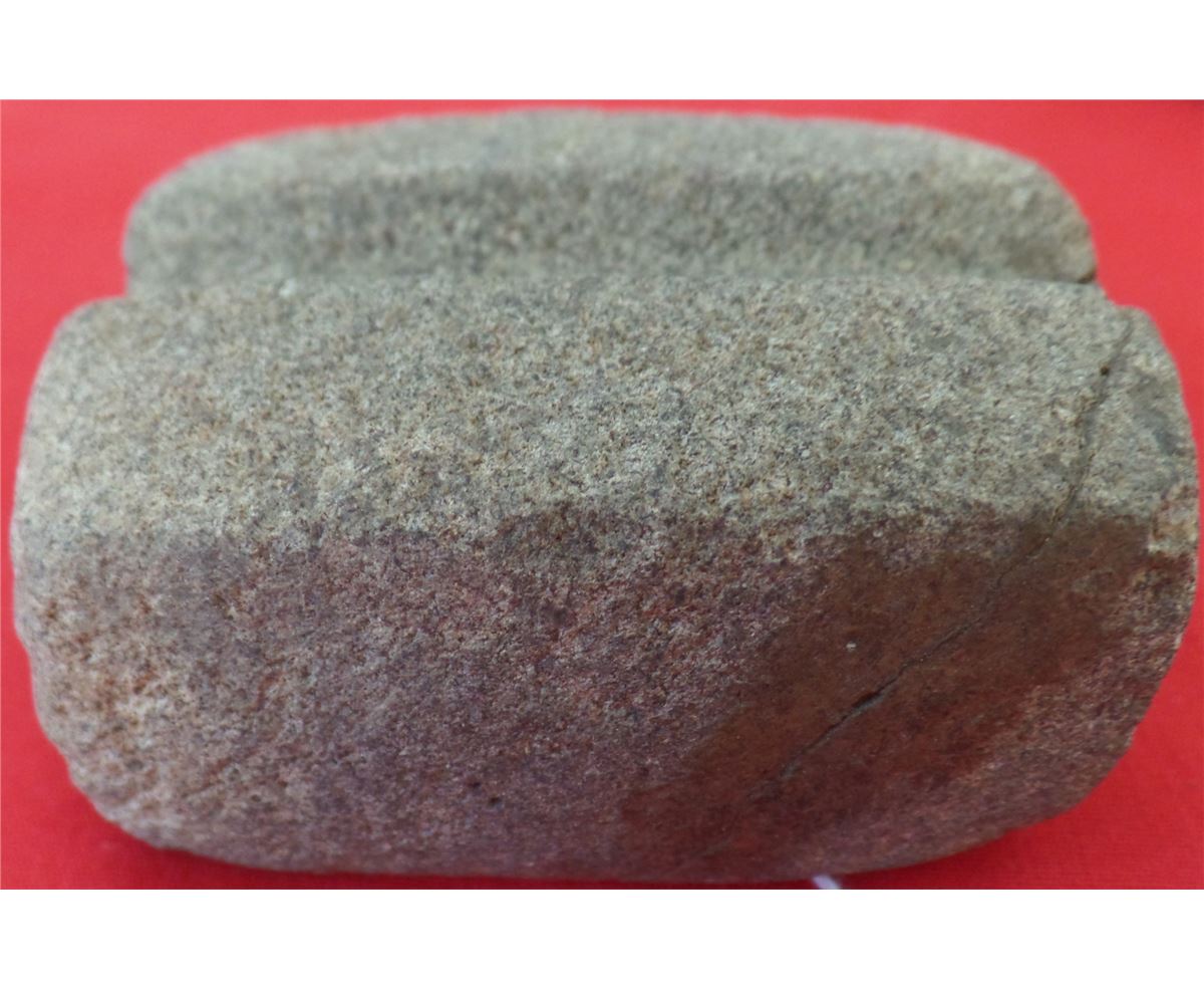 Chumash Cogstone & Others. Circa 1000 AD. Cogstone is made of basalt, the arrowshaft straightener is sandstone, the plummet stone is made of basalt. Plummet measures 6.5", cogstone 3", and arrowshaft straightener is 3" x 2.5". Chumash, California, plummet has good data on finding. Very rare, authentic relics. Cogstones are seldom seen. Condition: Arrowshaft straightener fractured and glued, plummet and cogstone are in good condition. Shipping: $22.