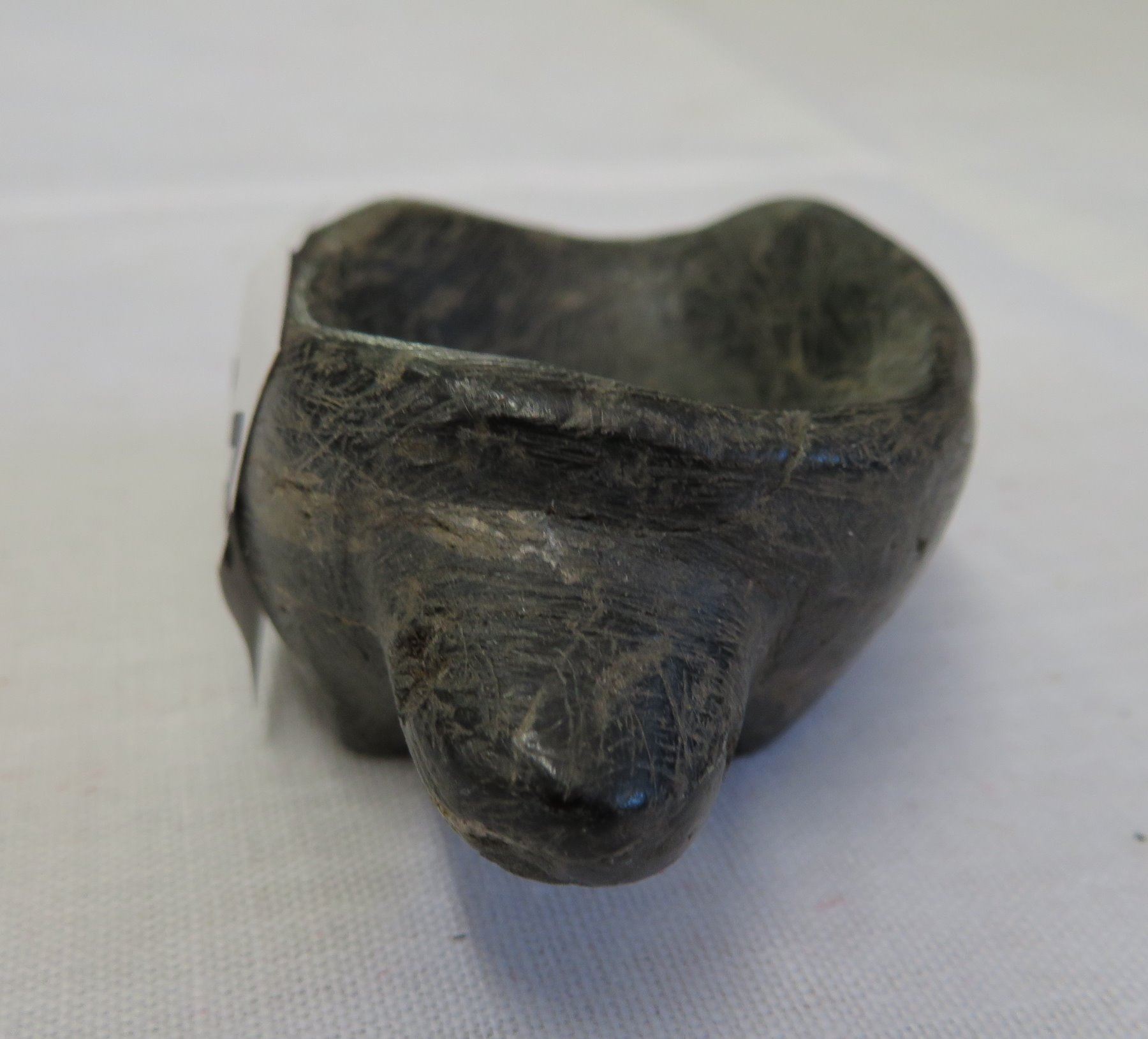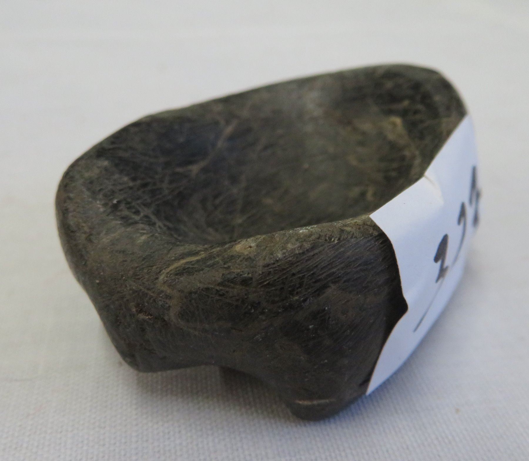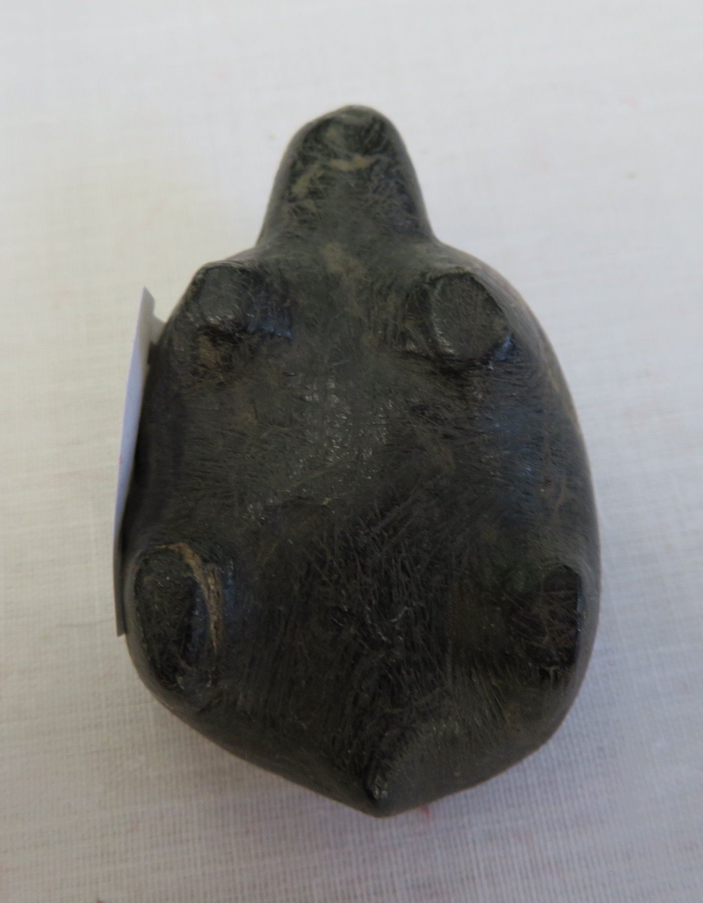 Chumash Effigy Turtle Bowl, pre-historic item. Made of steatite, the item measures 2 1/2" x 1 1/2" x 3/4". Santa Barbara County, California. Condition: As found, see images. Shipping: $16.50 w/insurance and signature, due to value.