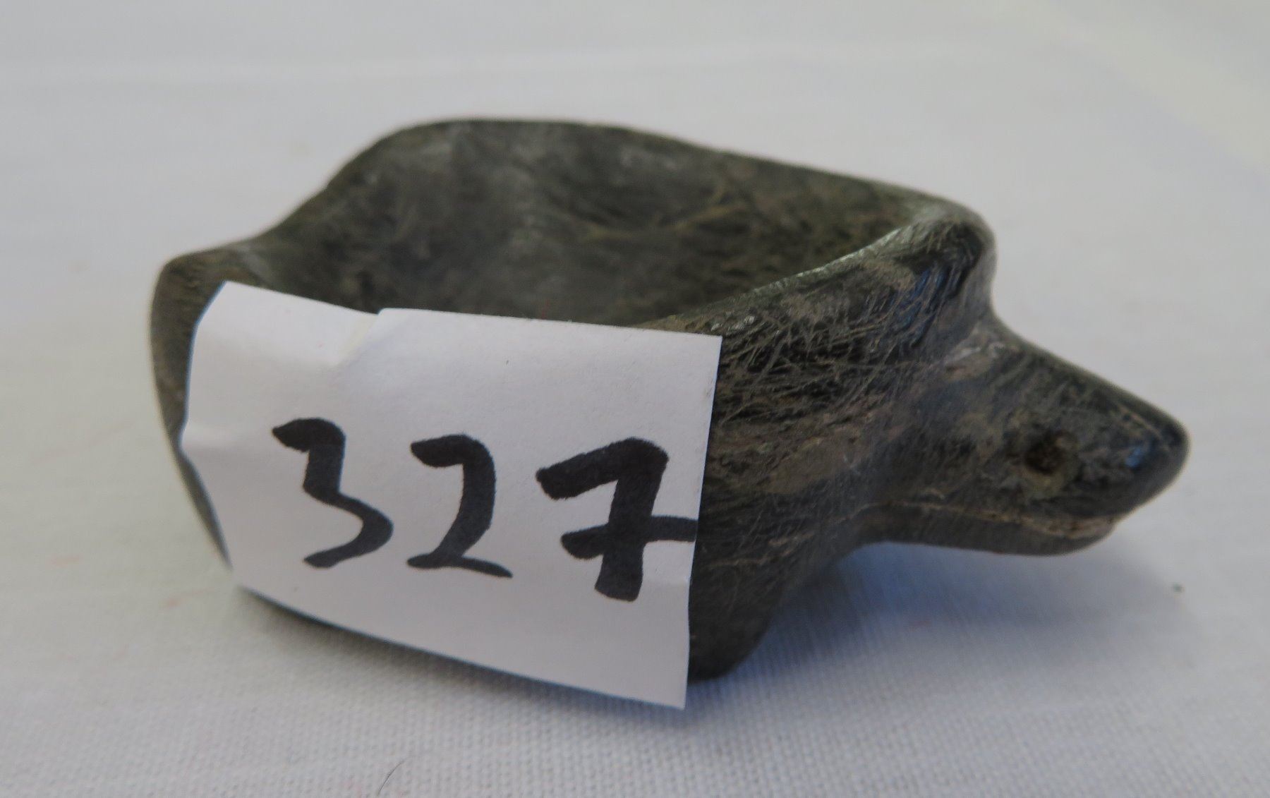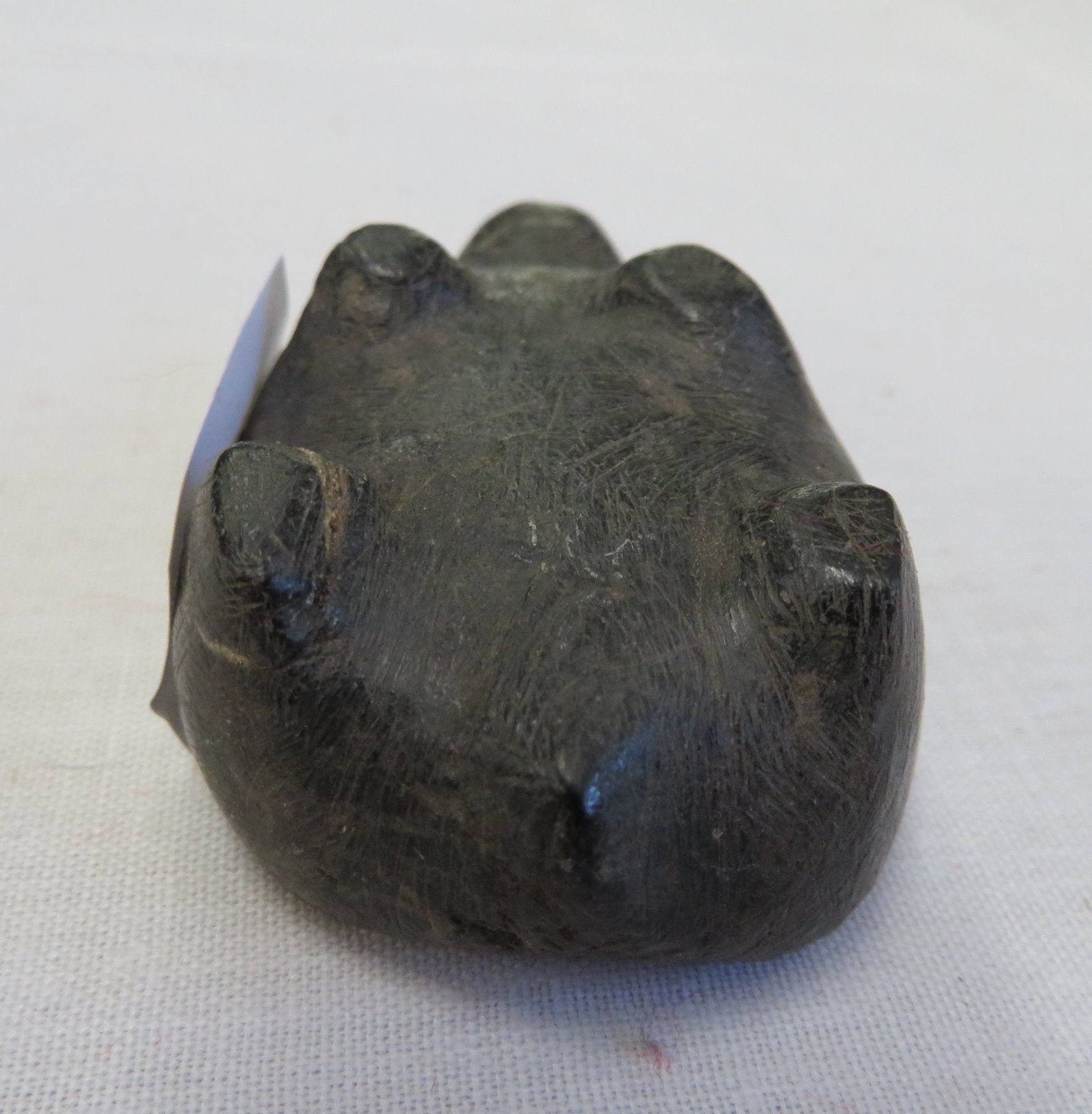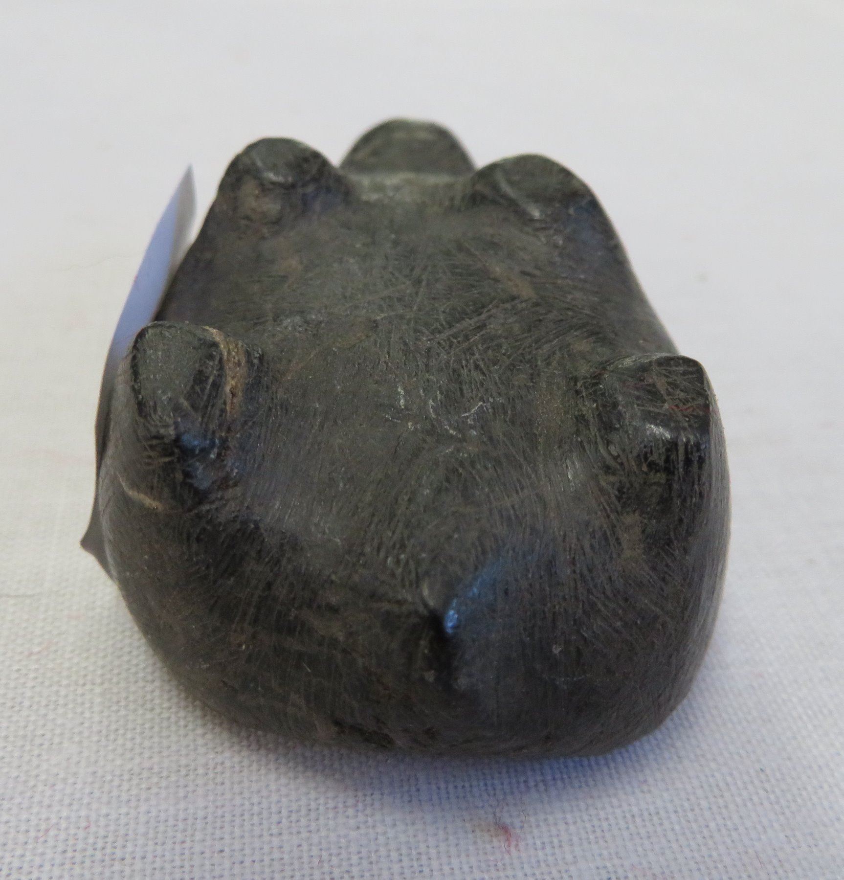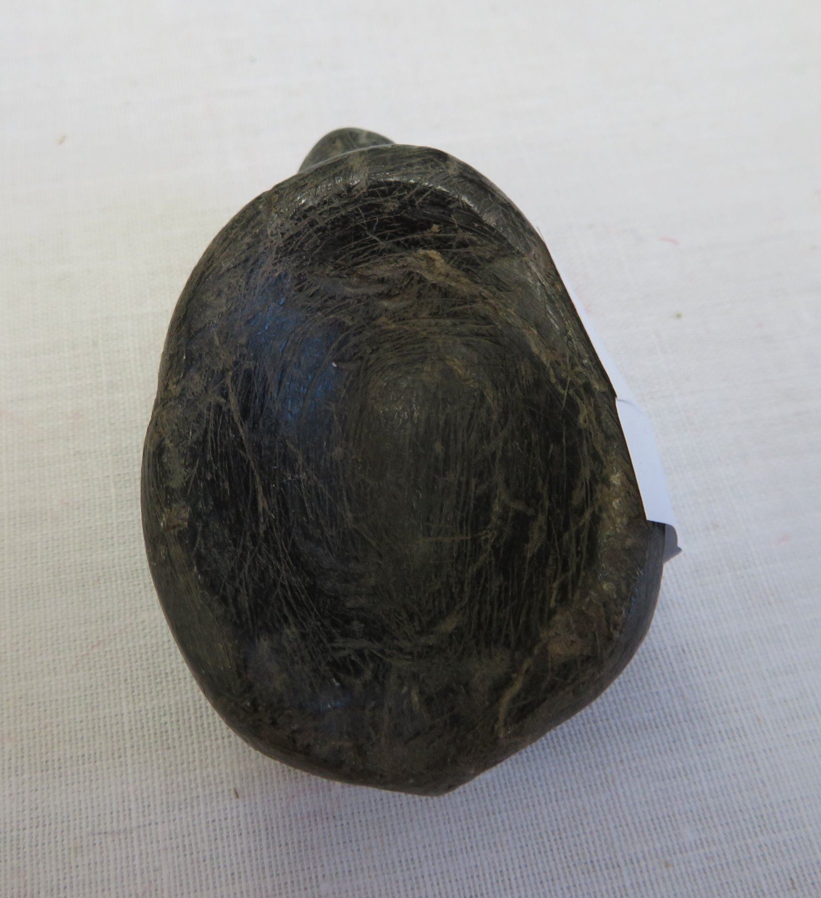 Chumash Effigy Turtle Bowl, pre-historic item. Made of steatite, the item measures 2 1/2" x 1 1/2" x 3/4". Santa Barbara County, California. Condition: As found, see images. Shipping: $16.50 w/insurance and signature, due to value.