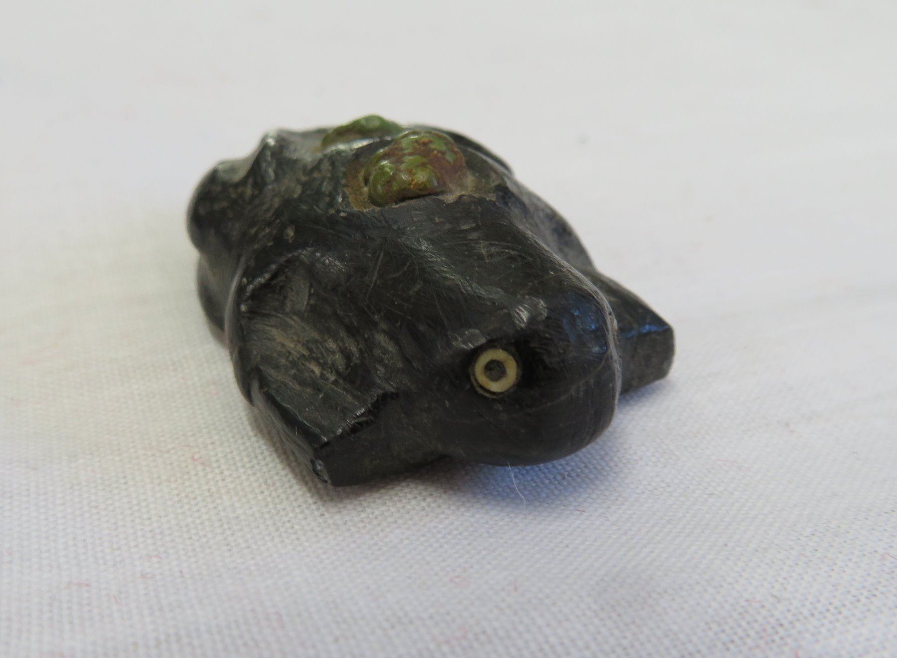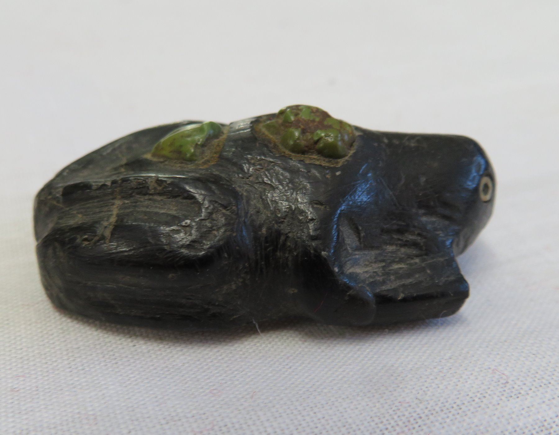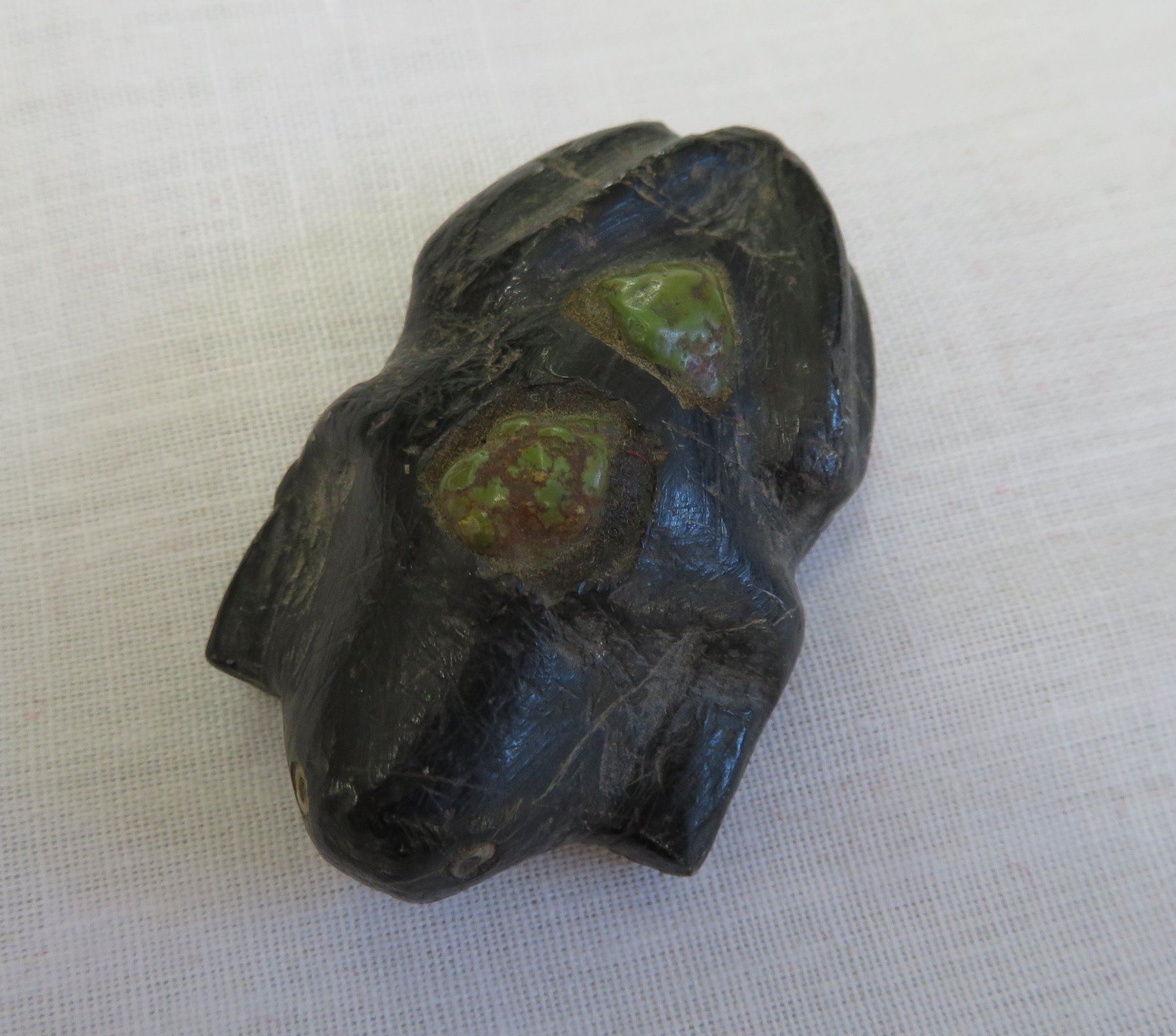 Chumash Inlaid Effigy Frog, pre-historic item. Made of steatite, turquoise and shell, the item measures 2" x 1 1/4" x 3/4". Santa Barbara County, California. Condition: As found, see images. Shipping: $16.50 w/insurance and signature, due to value.