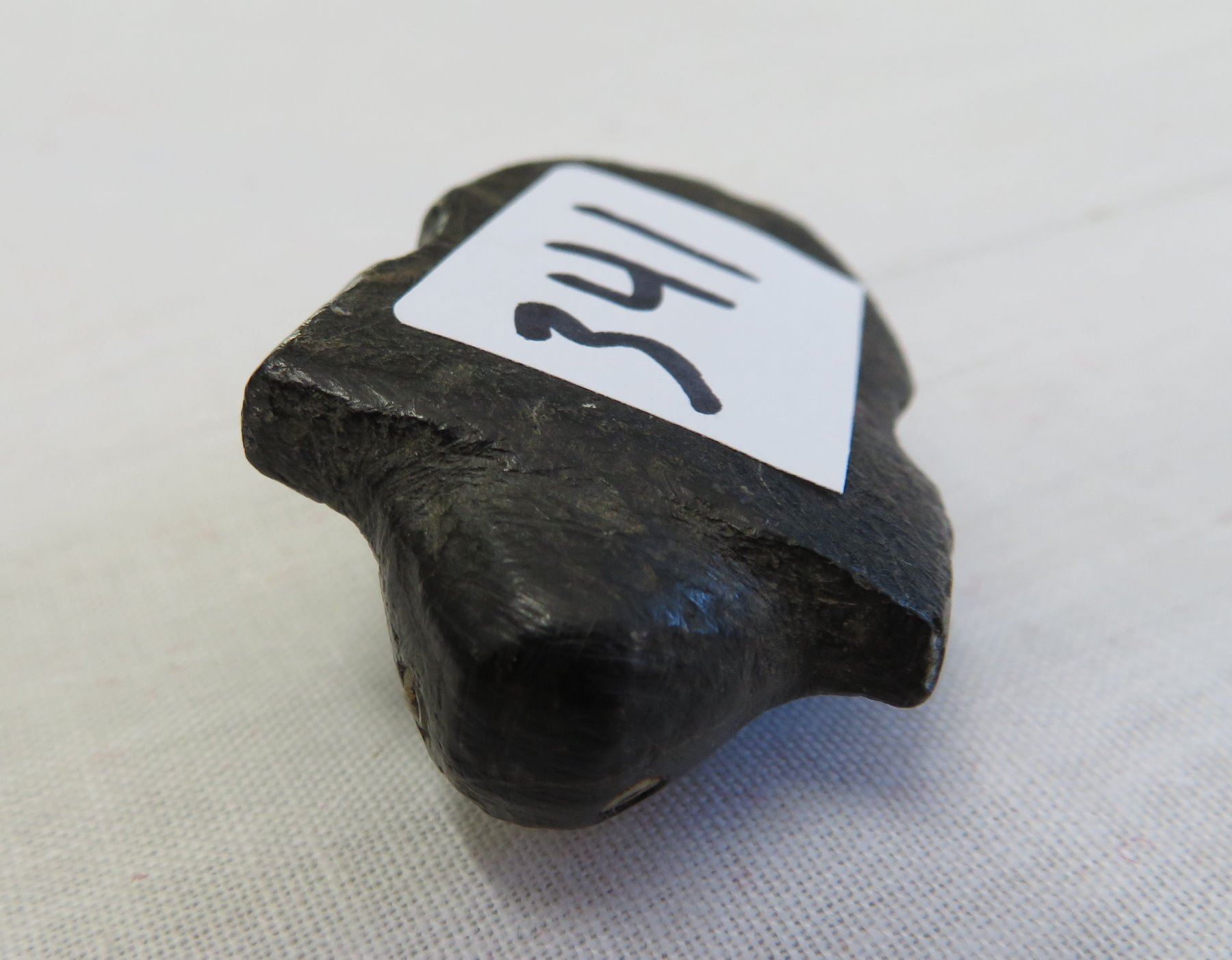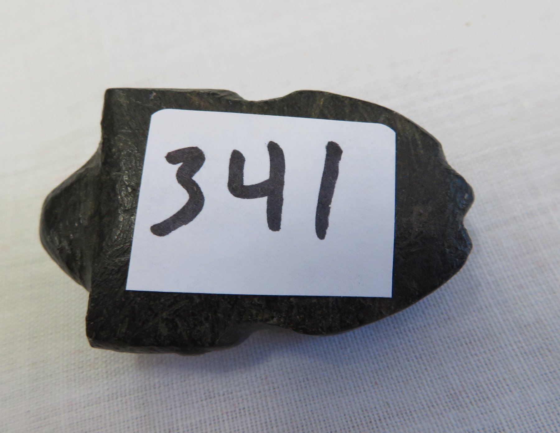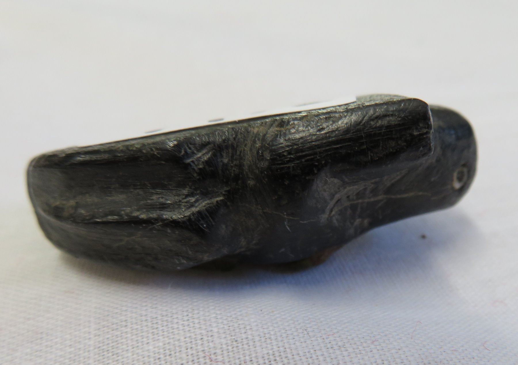 Chumash Inlaid Effigy Frog, pre-historic item. Made of steatite, turquoise and shell, the item measures 2" x 1 1/4" x 3/4". Santa Barbara County, California. Condition: As found, see images. Shipping: $16.50 w/insurance and signature, due to value.