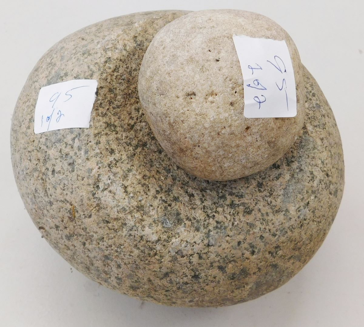 Chumash Mortar & Pestle, pre-historic items. Made of granite, the mortar measures 6" x 8", and the pestle is 3" x 3". From San Clemente, California. Portable mortar and pestle. Condition: Very good, see images. Shipping: $50.00, USA estimate only.