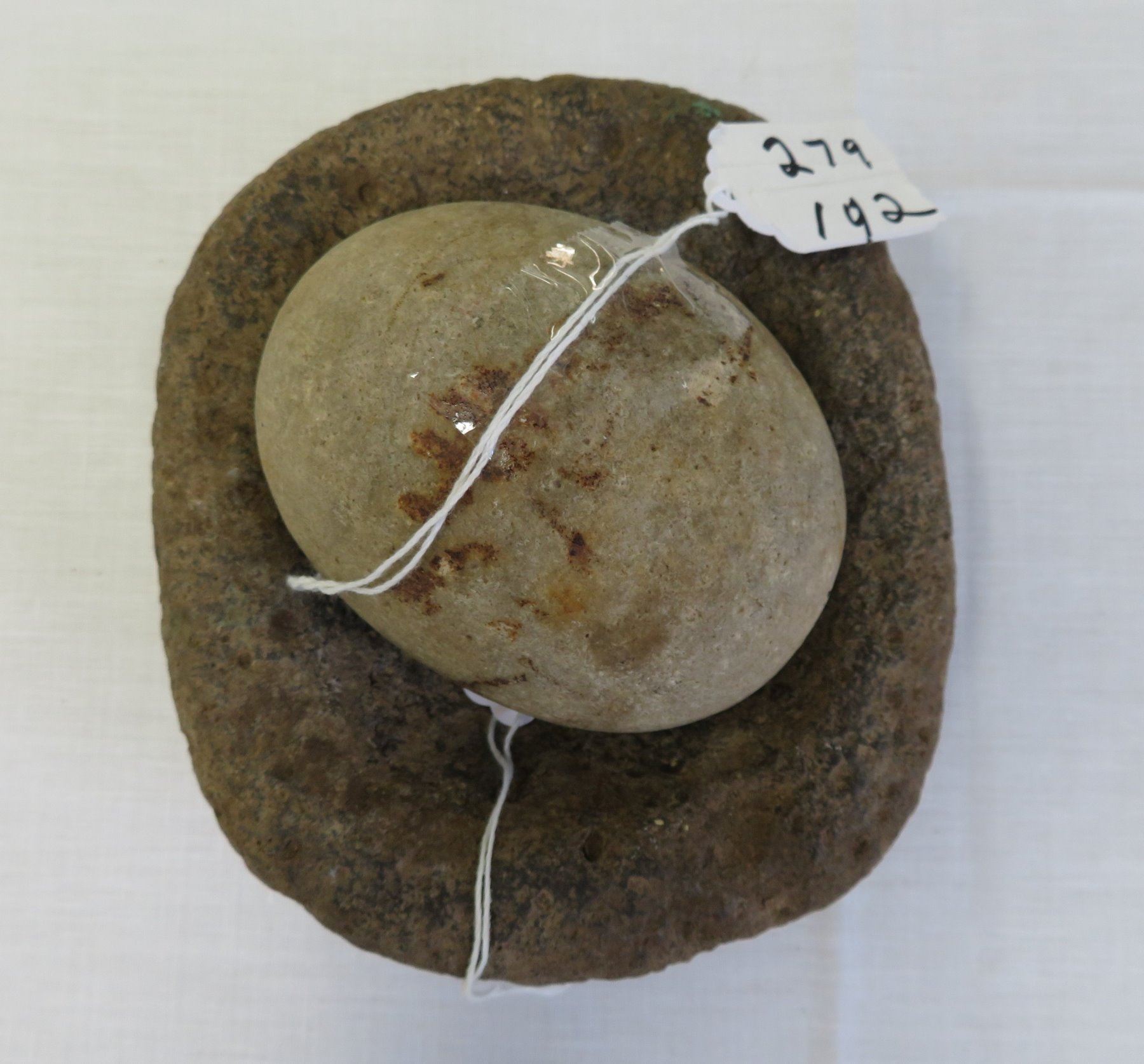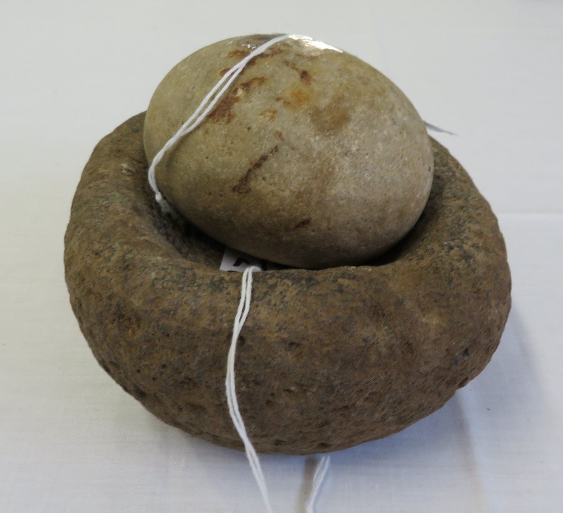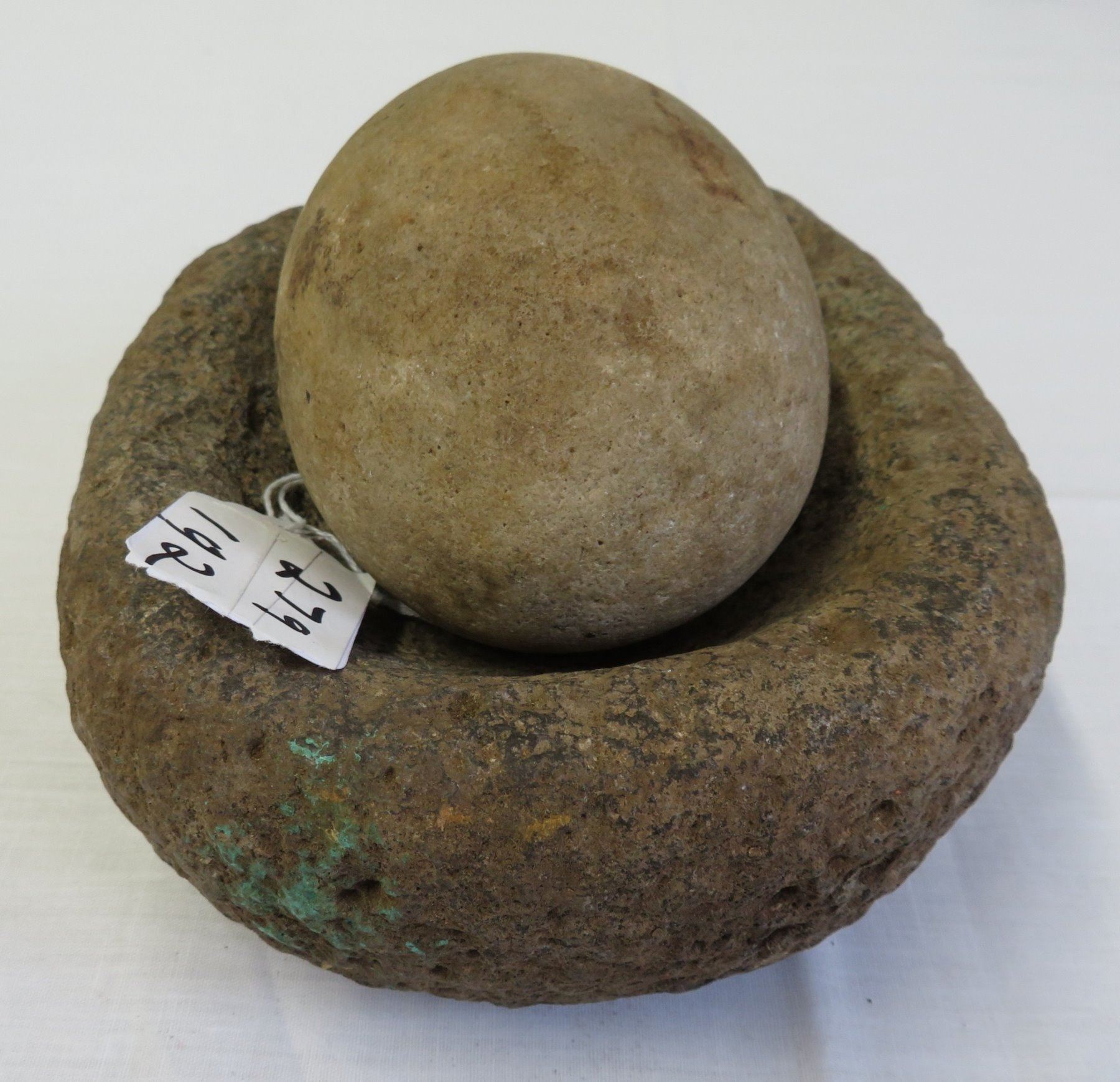 Chumash Mortar & Pestle, pre-historic item. Made of basalt, the item measures 6" x 5" x 2 1/2", pestle masures 4" x 3". Santa Barbara County, California. Condition: Good, see images. Shipping: $35.00 w/insurance and signature, due to size and weight.