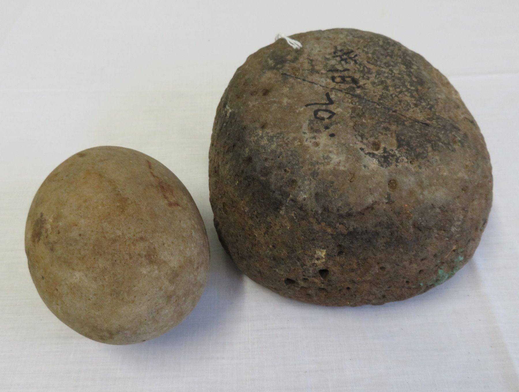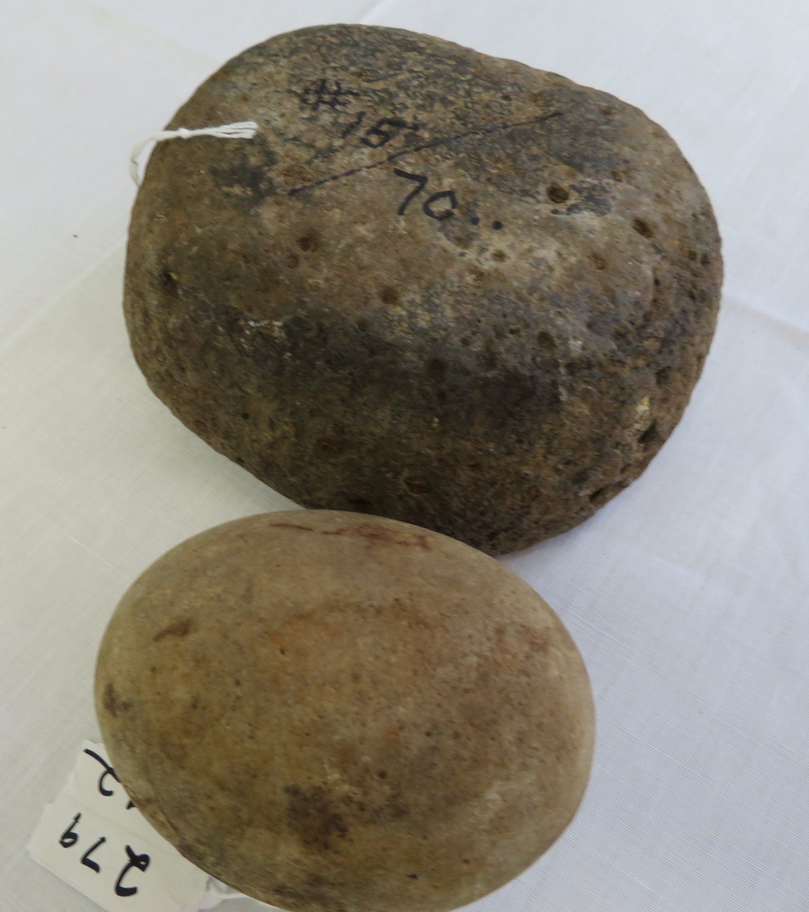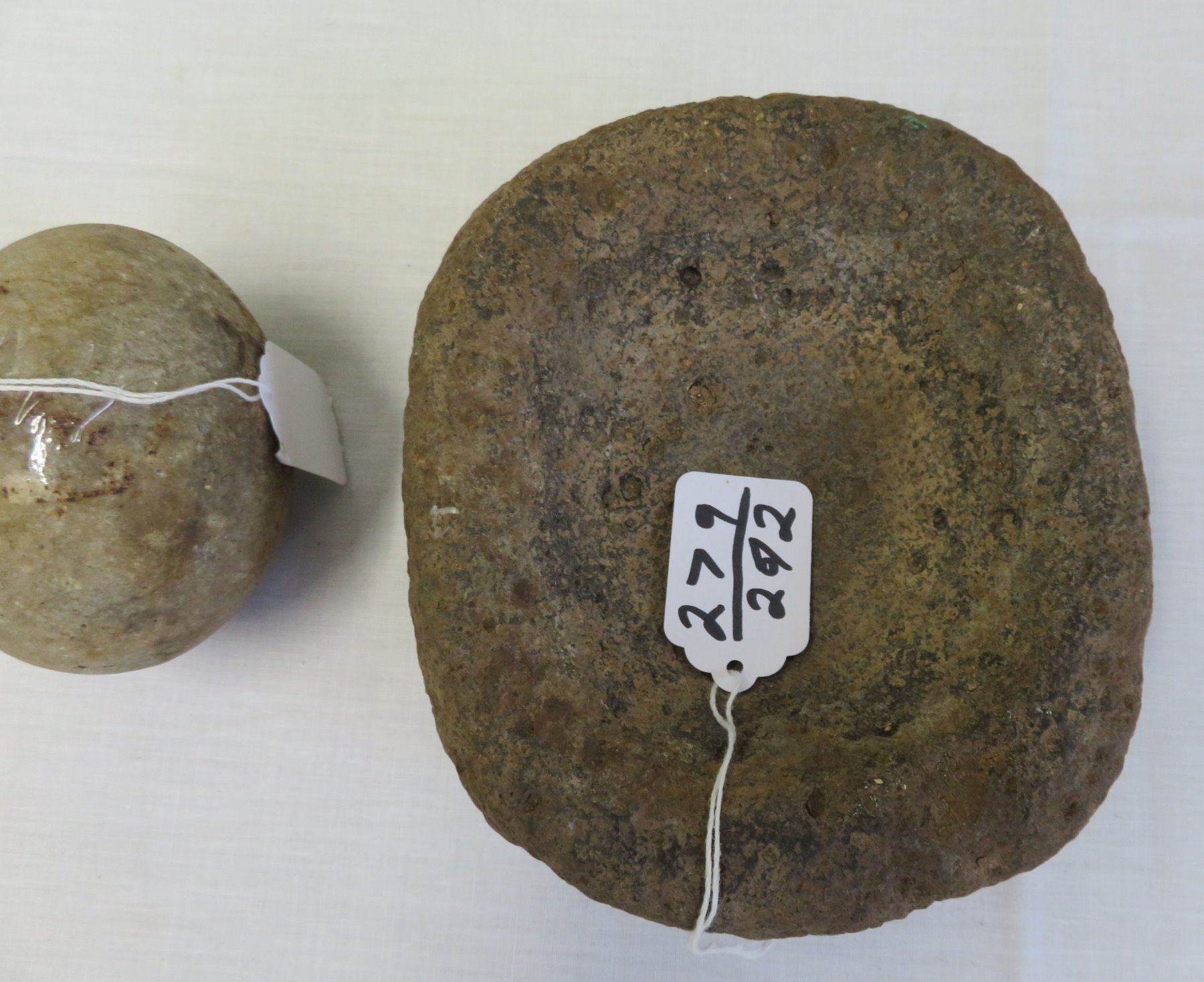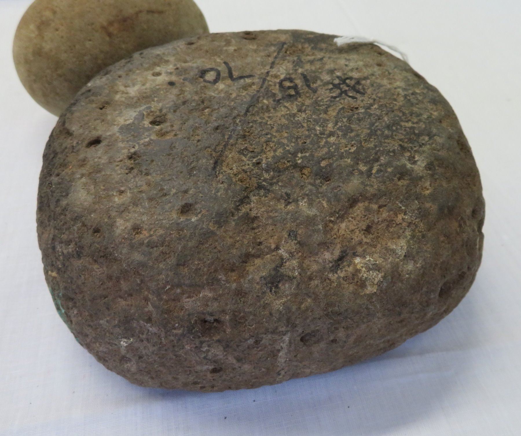 Chumash Mortar & Pestle, pre-historic item. Made of basalt, the item measures 6" x 5" x 2 1/2", pestle masures 4" x 3". Santa Barbara County, California. Condition: Good, see images. Shipping: $35.00 w/insurance and signature, due to size and weight.