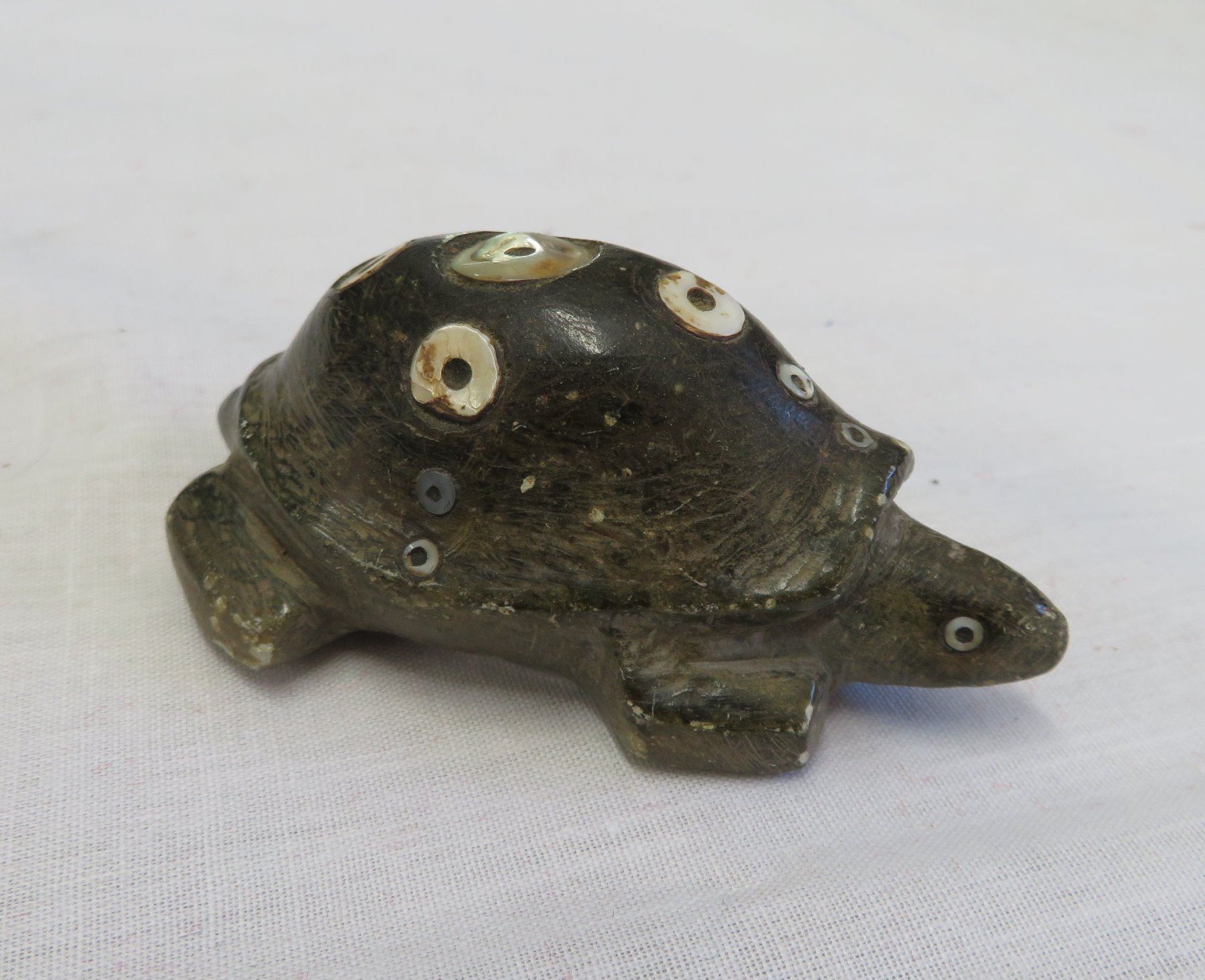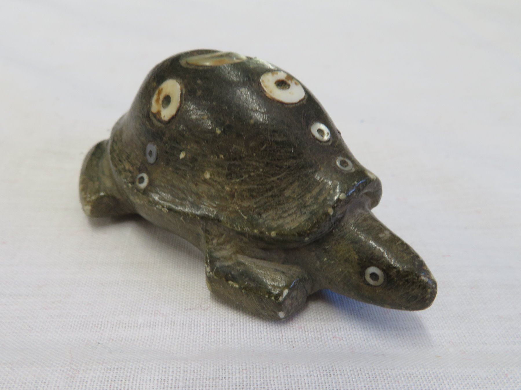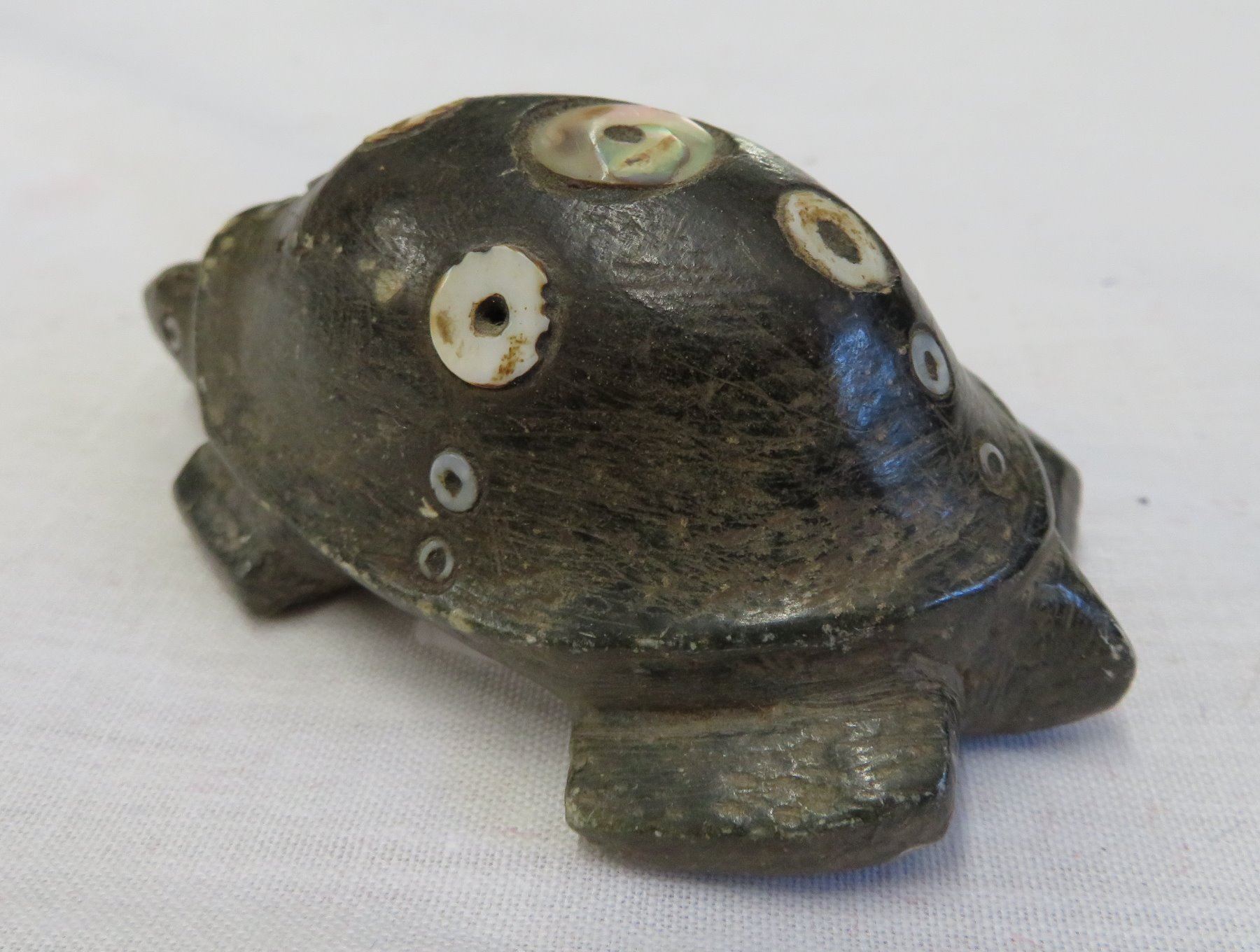 Chumash Shell Inlaid Frog, pre-historic item. Made of steatite and shell, the item measures 3 1/2" x 2" x 1 1/4". Santa Barbara County, California. Condition: As found, see images. Shipping: $20.00 w/insurance and signature, due to value.