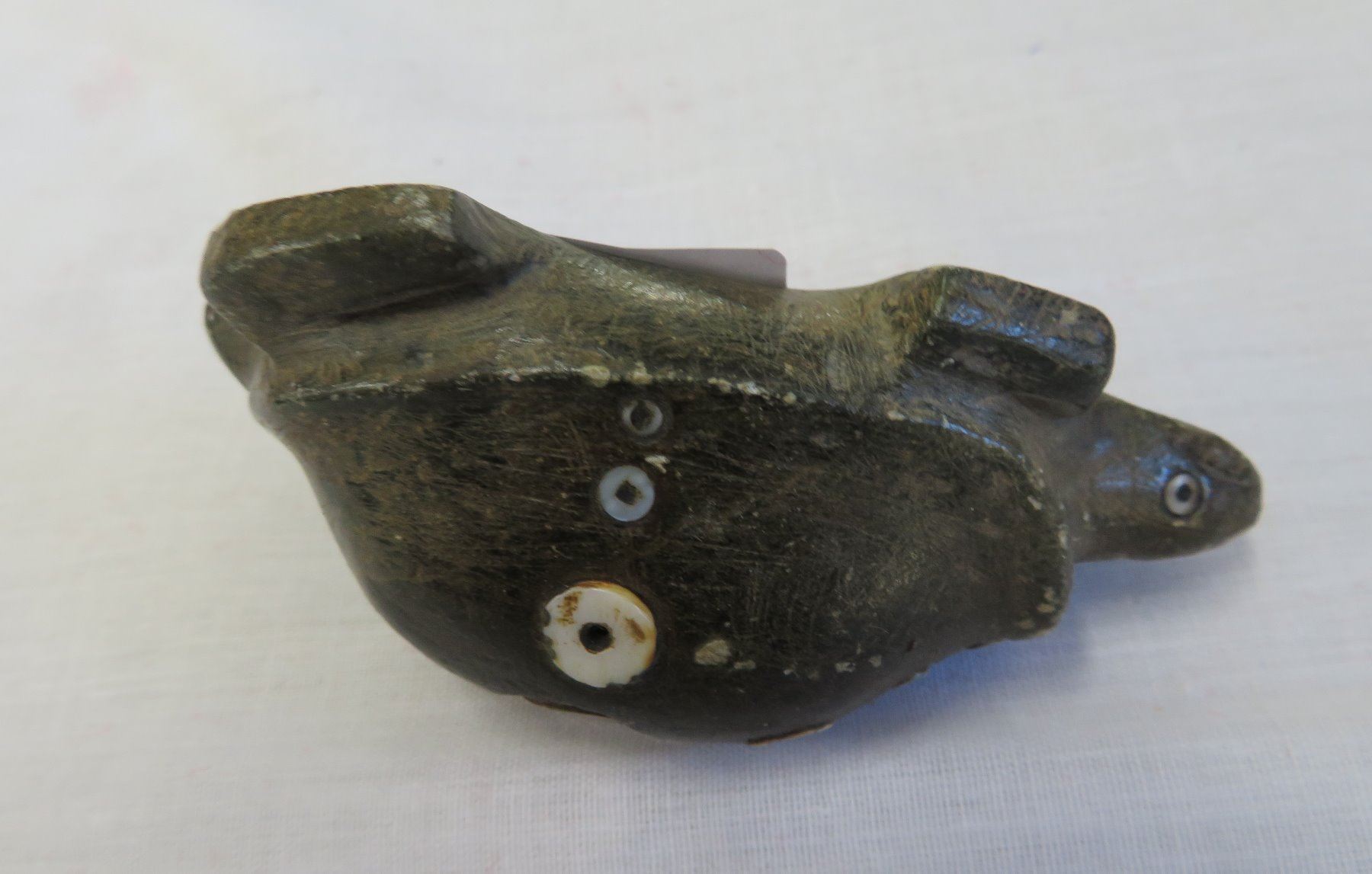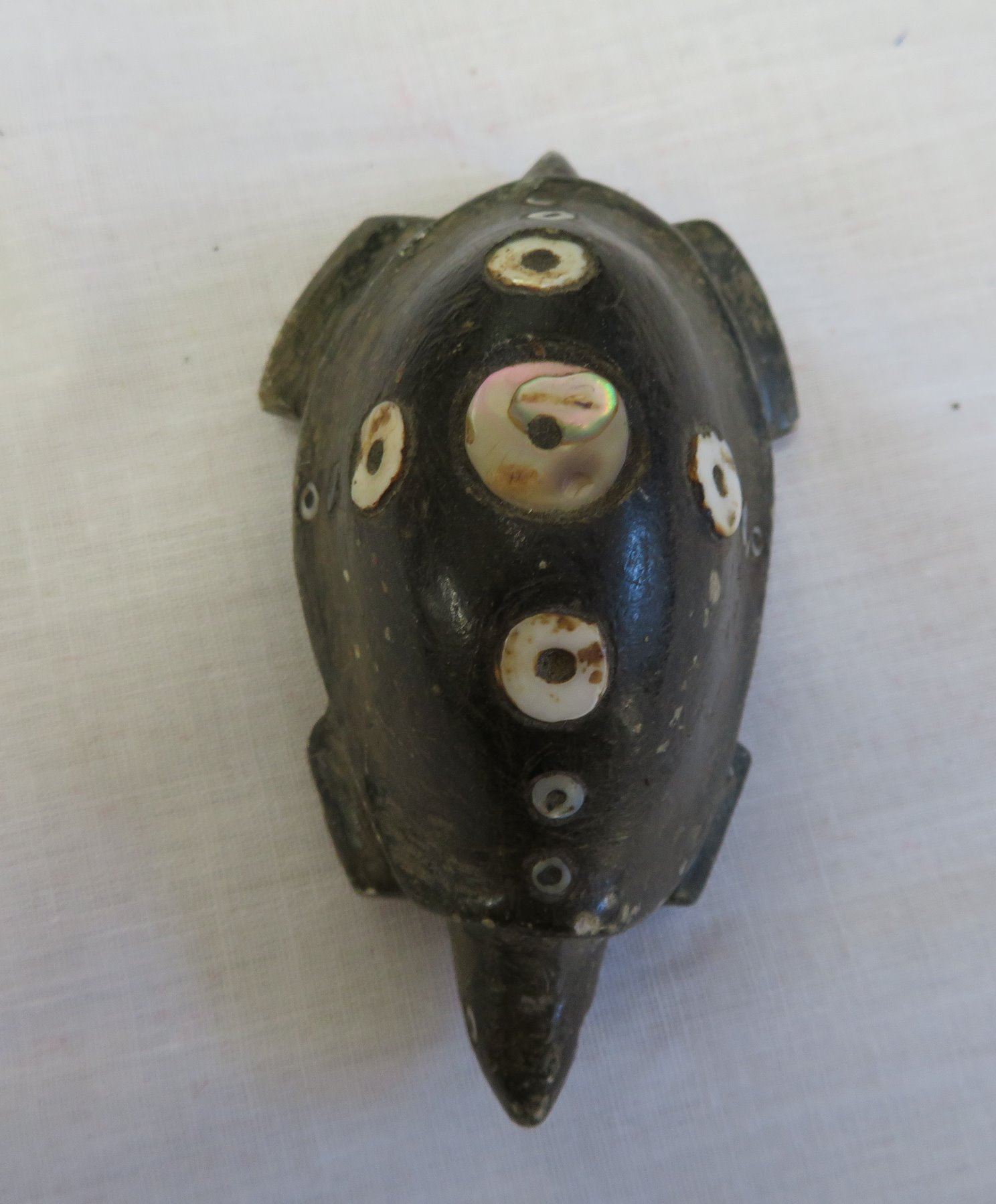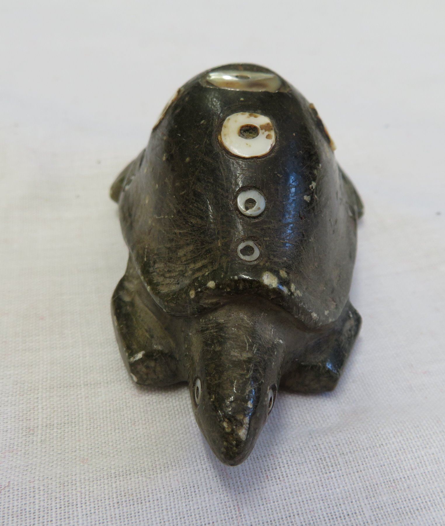 Chumash Shell Inlaid Frog, pre-historic item. Made of steatite and shell, the item measures 3 1/2" x 2" x 1 1/4". Santa Barbara County, California. Condition: As found, see images. Shipping: $20.00 w/insurance and signature, due to value.