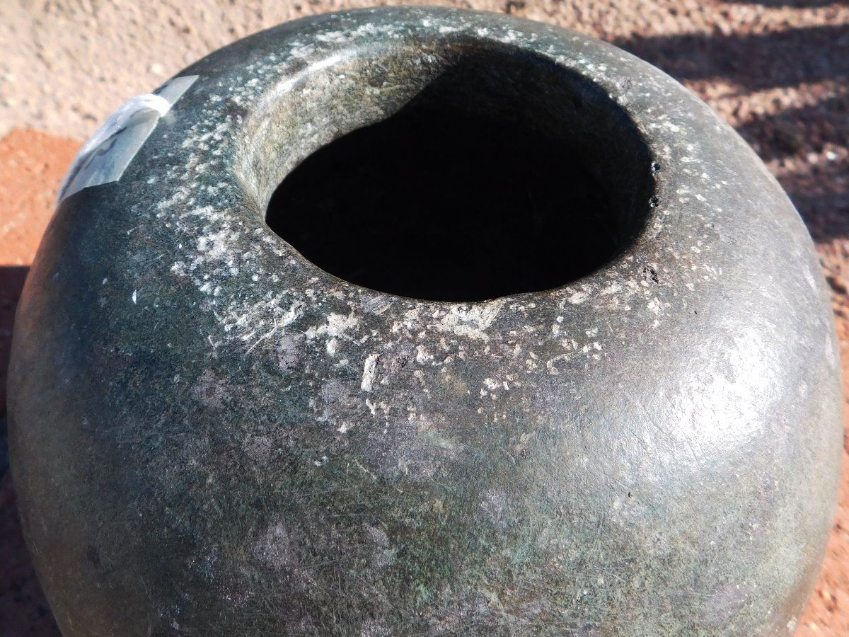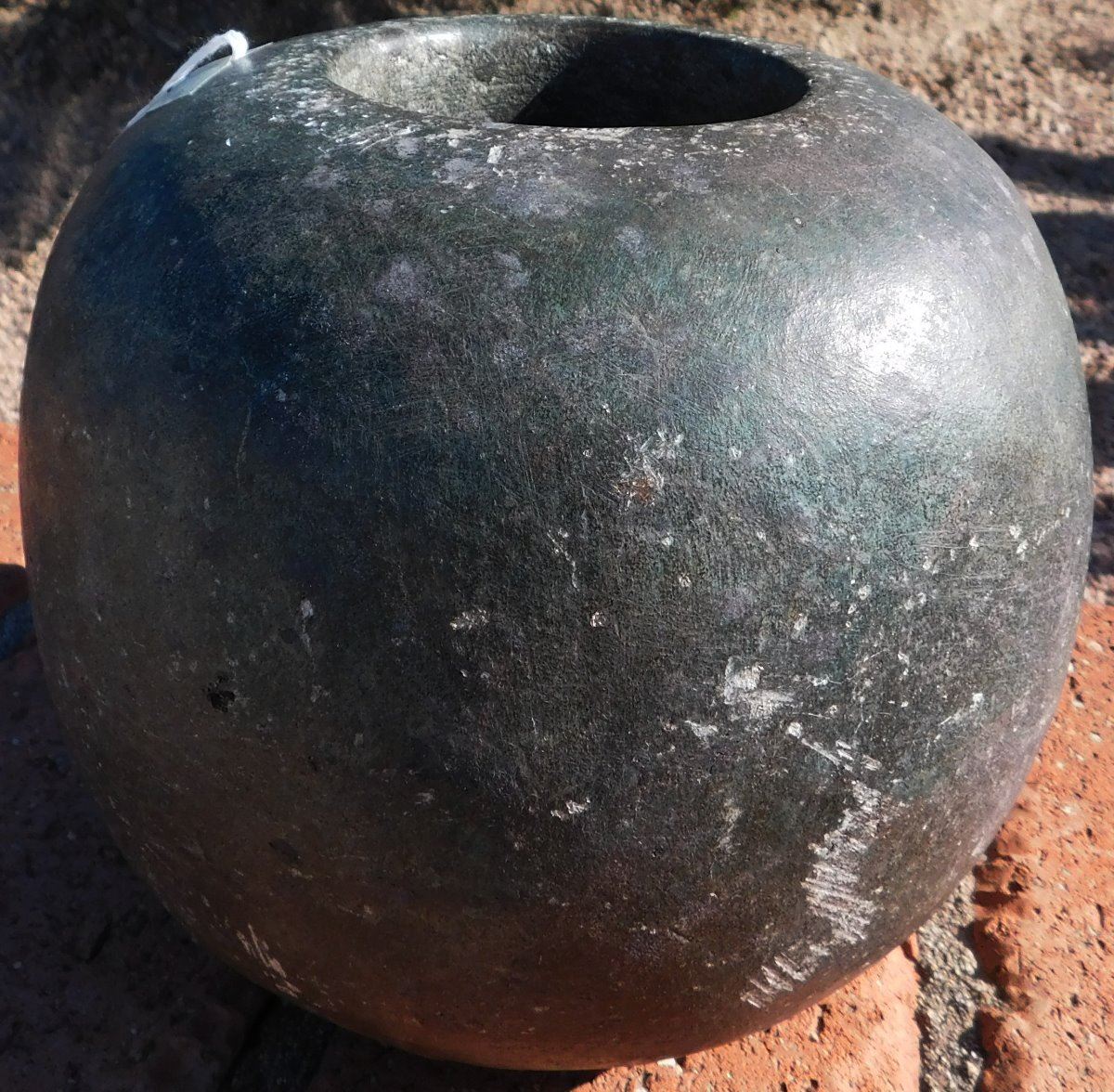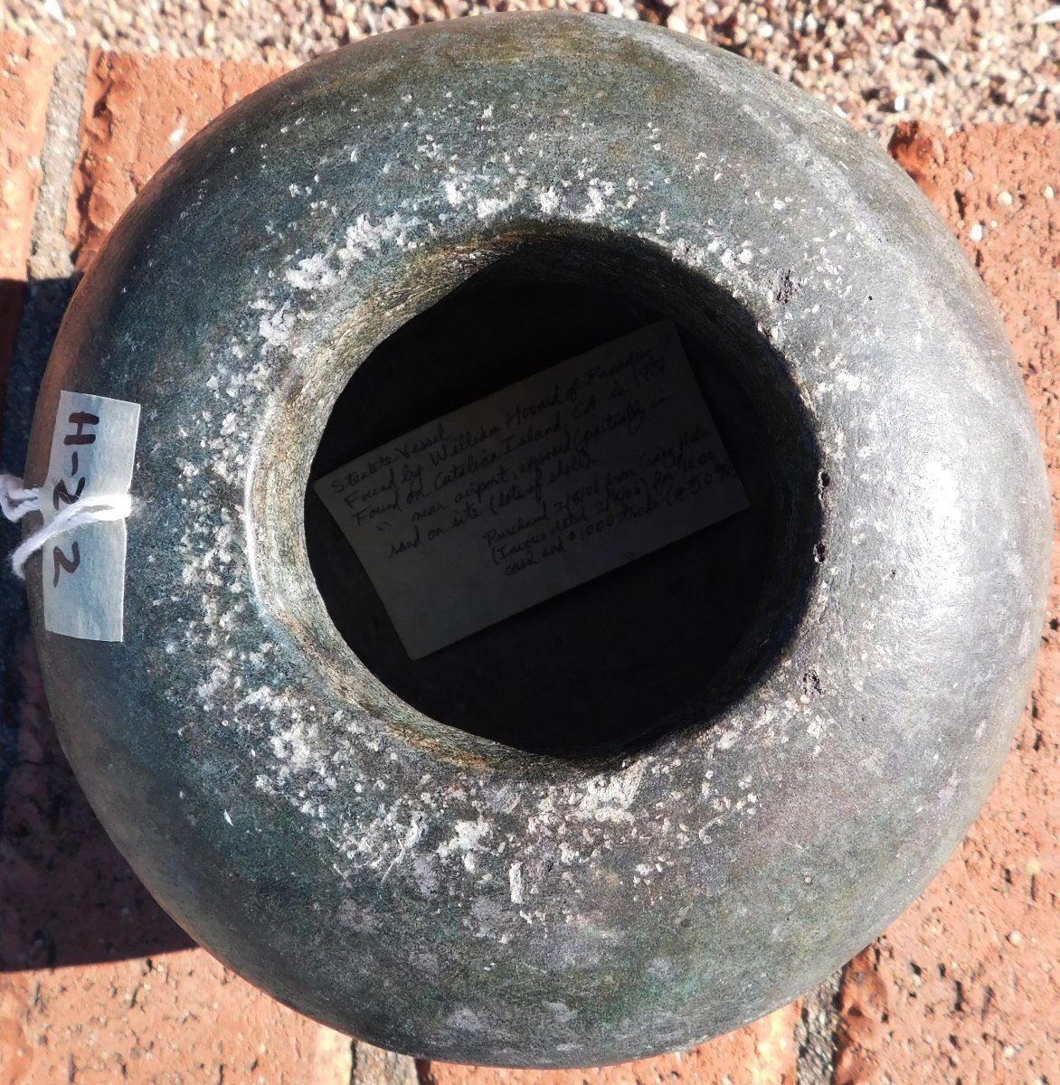 Chumash Stone Bowl, pre-historic item. Made of steatite, the item measures 7.5" x 7" x 6.75", with a 2.75" opening. Found on Catalina Island, California in 1951. Very rare, Chumash steatite olla. Great color on stone. Condition: Minor nicks and scuffs, see images. Shipping: $40.00, USA estimate only, requires insurance w/signature and double-box.
